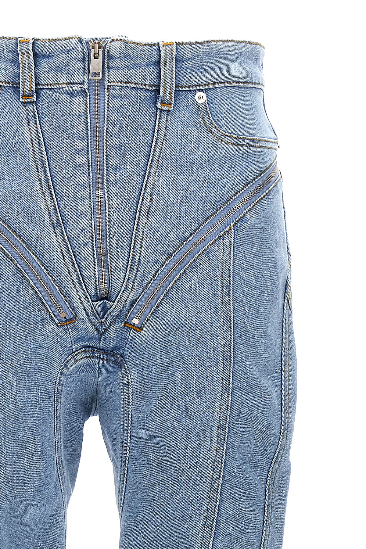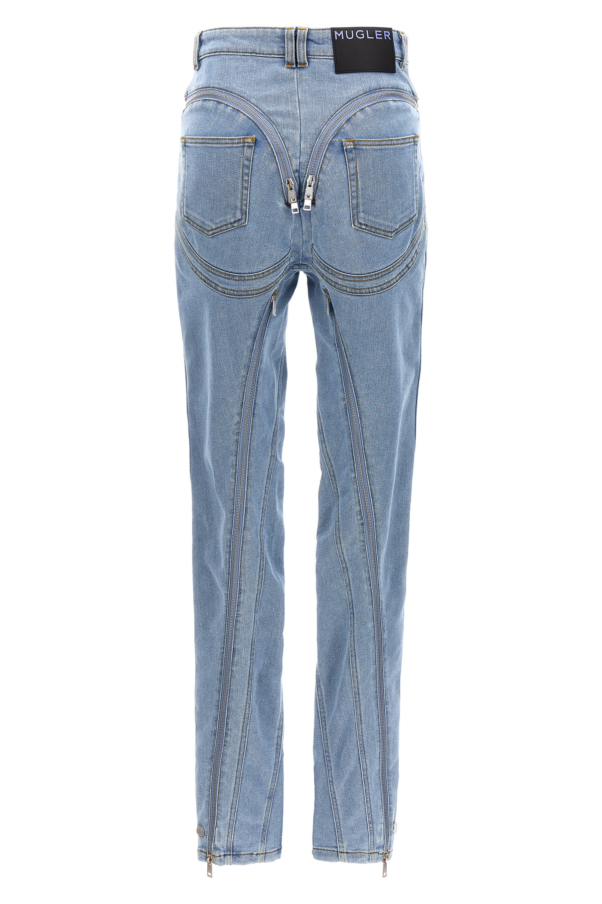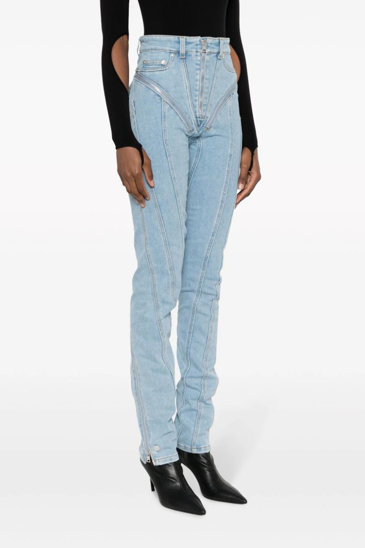 'Zipped spiral' skinny stretch denim jeans with front zip closure. Zip detail on the sides that can be fully opened.