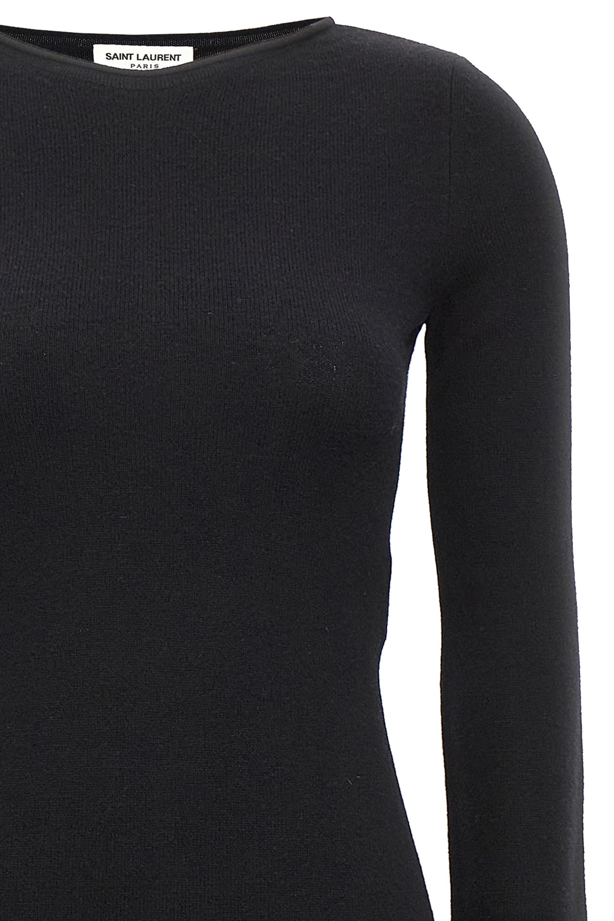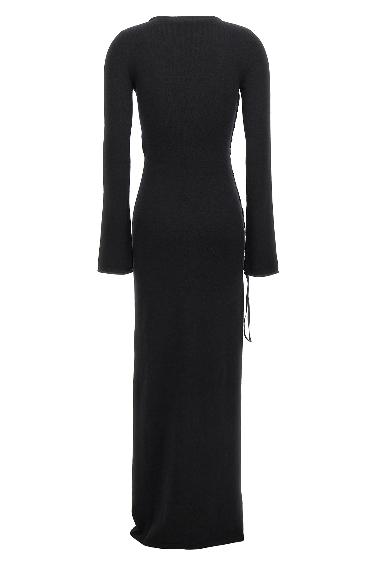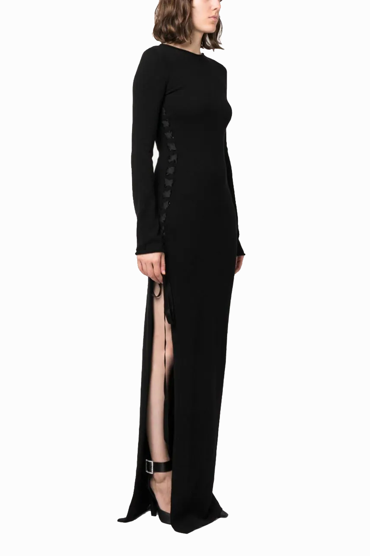 Long wool dress, crew neck, long sleeves, side split detail and lace.