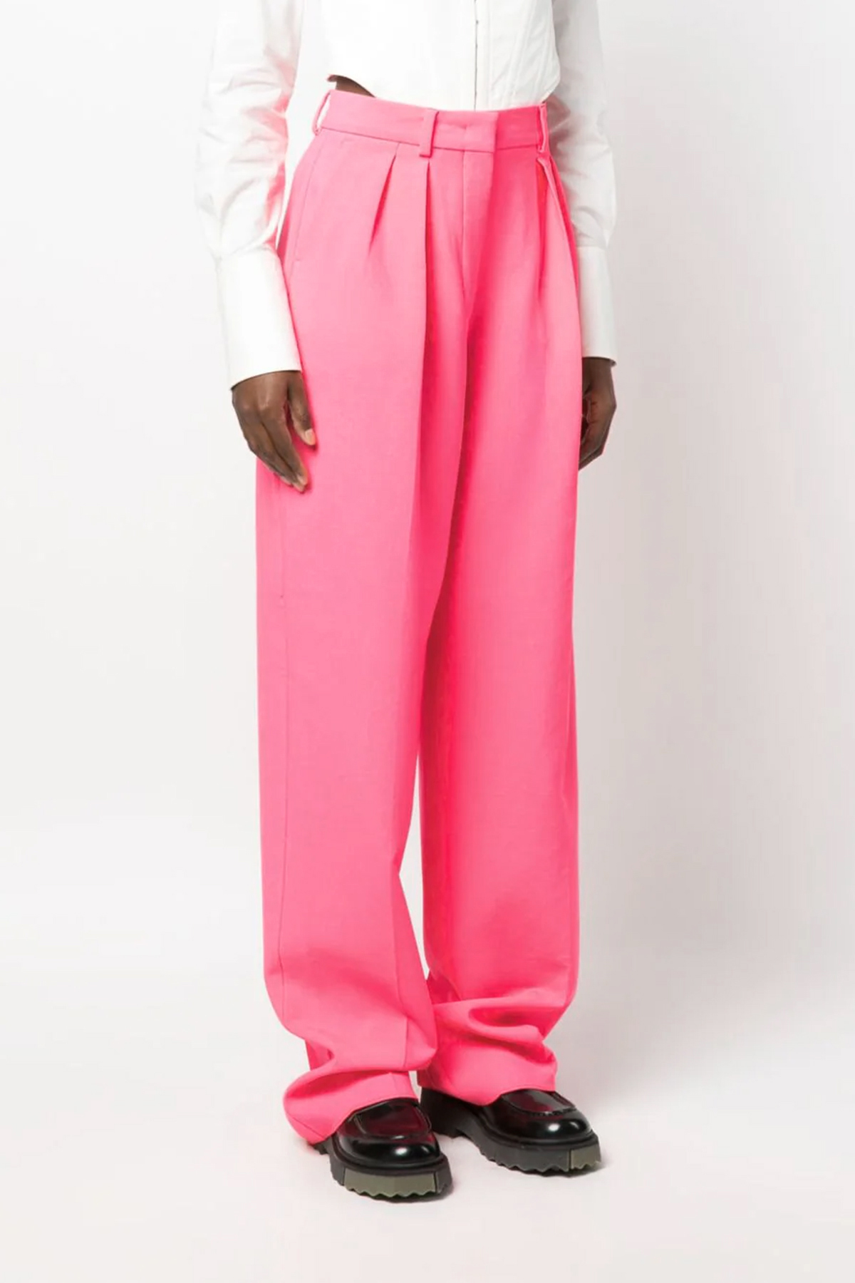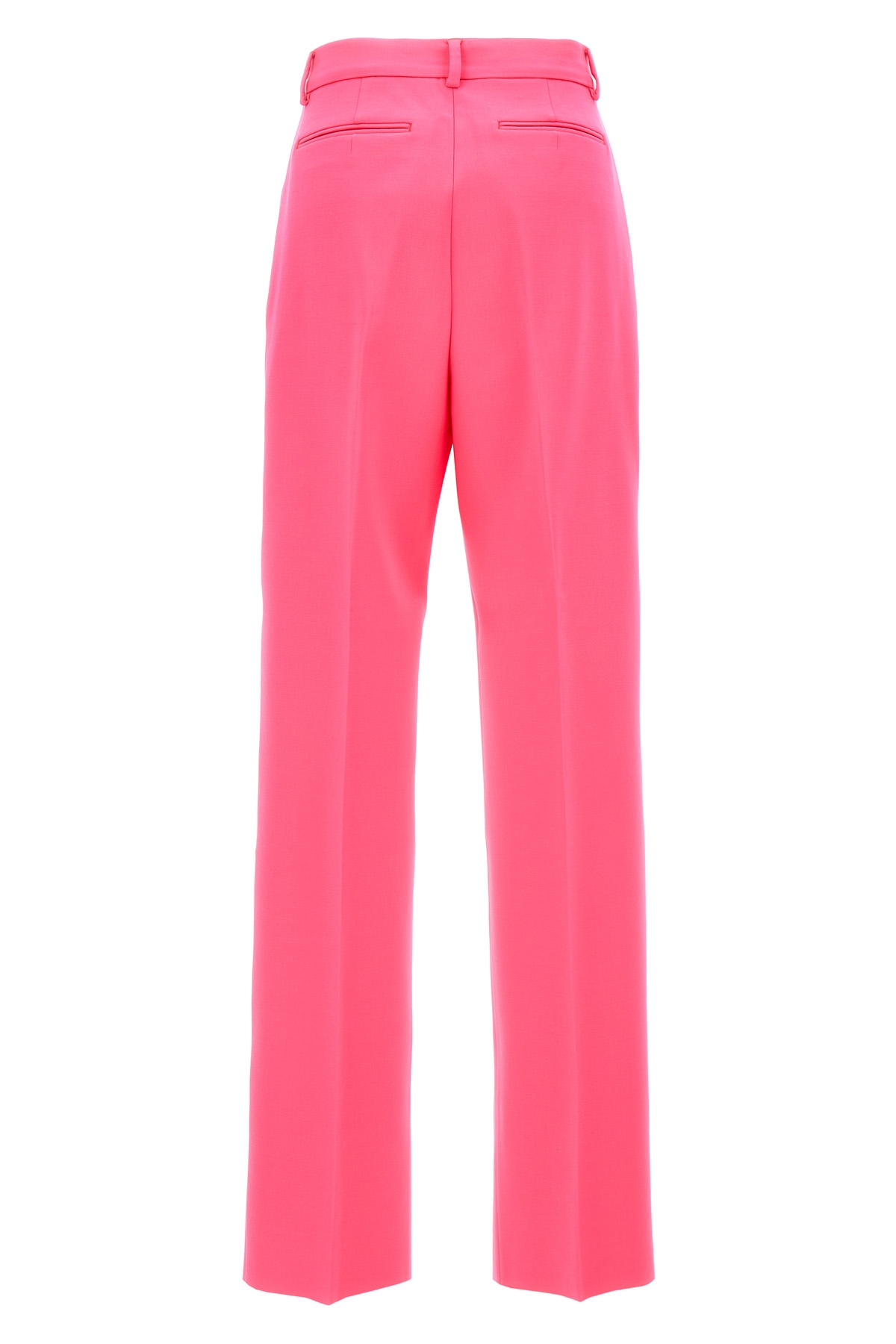 'Tibet' stretch virgin wool pants with front front pences. Model with wide leg and zip and hook closure.