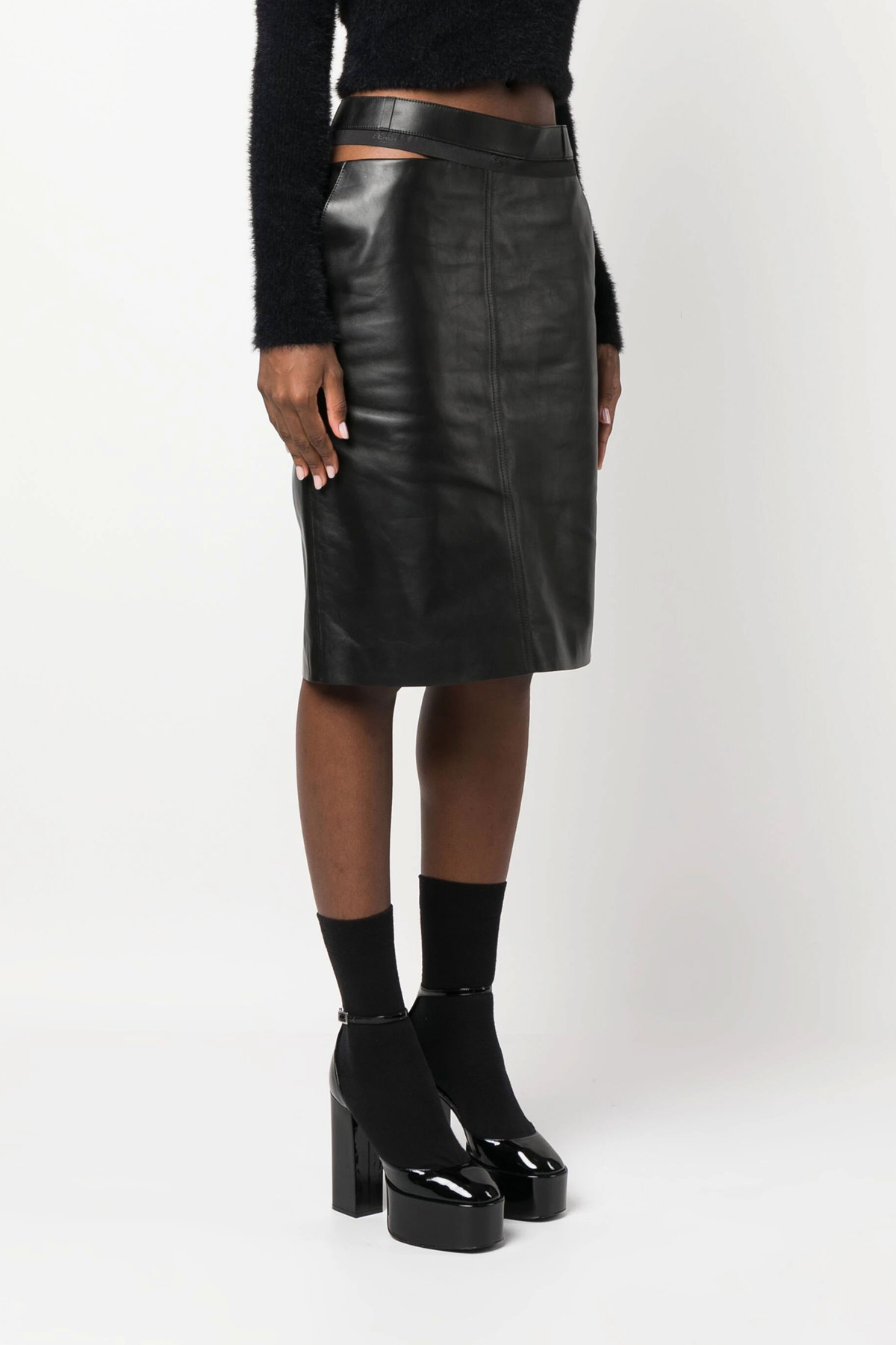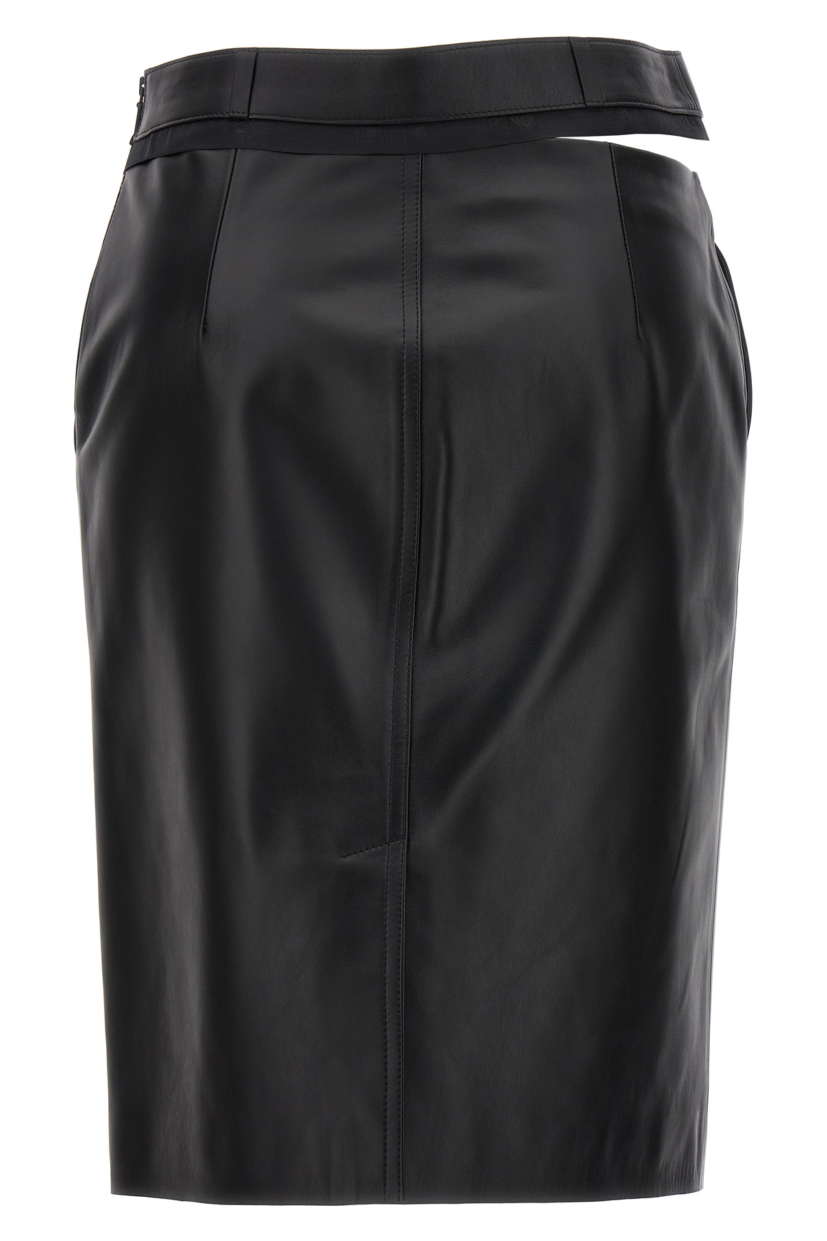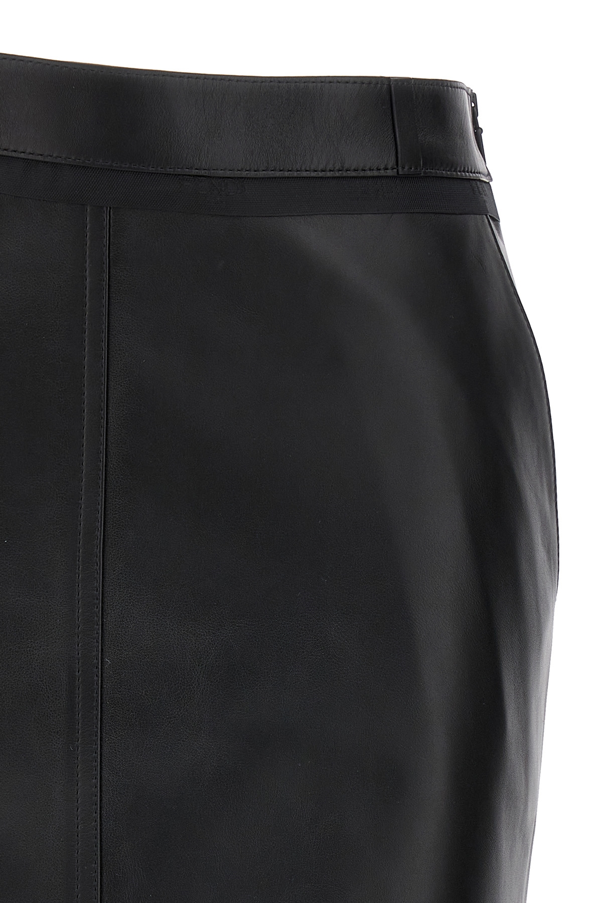 Leather sheath midi skirt, pockets, back central split, side zip closure, asymmetrical cut detail at the waist with belt loops and black ribbon profile with jacquard logo.