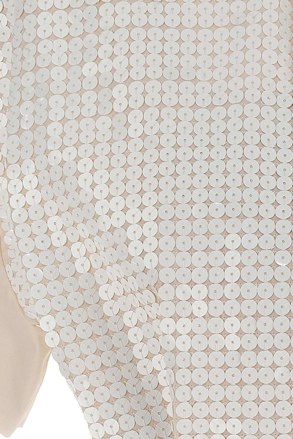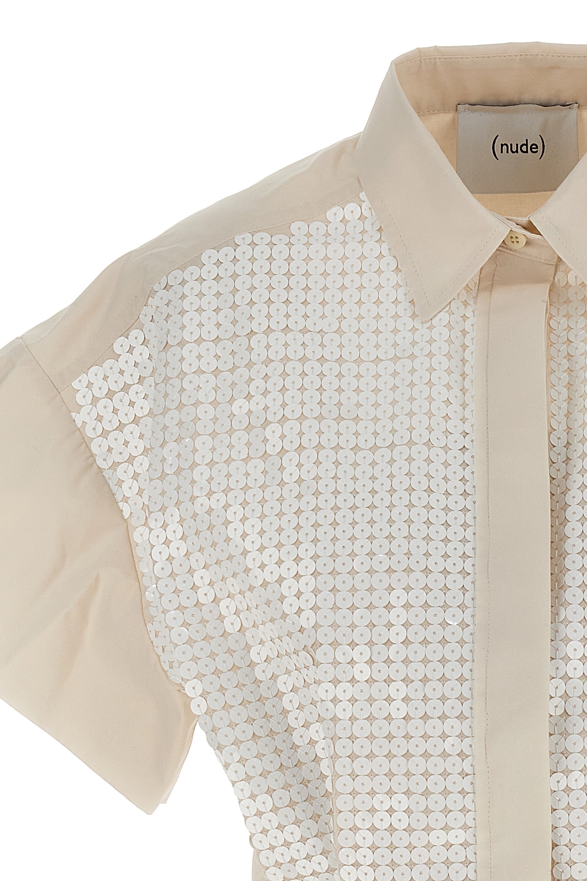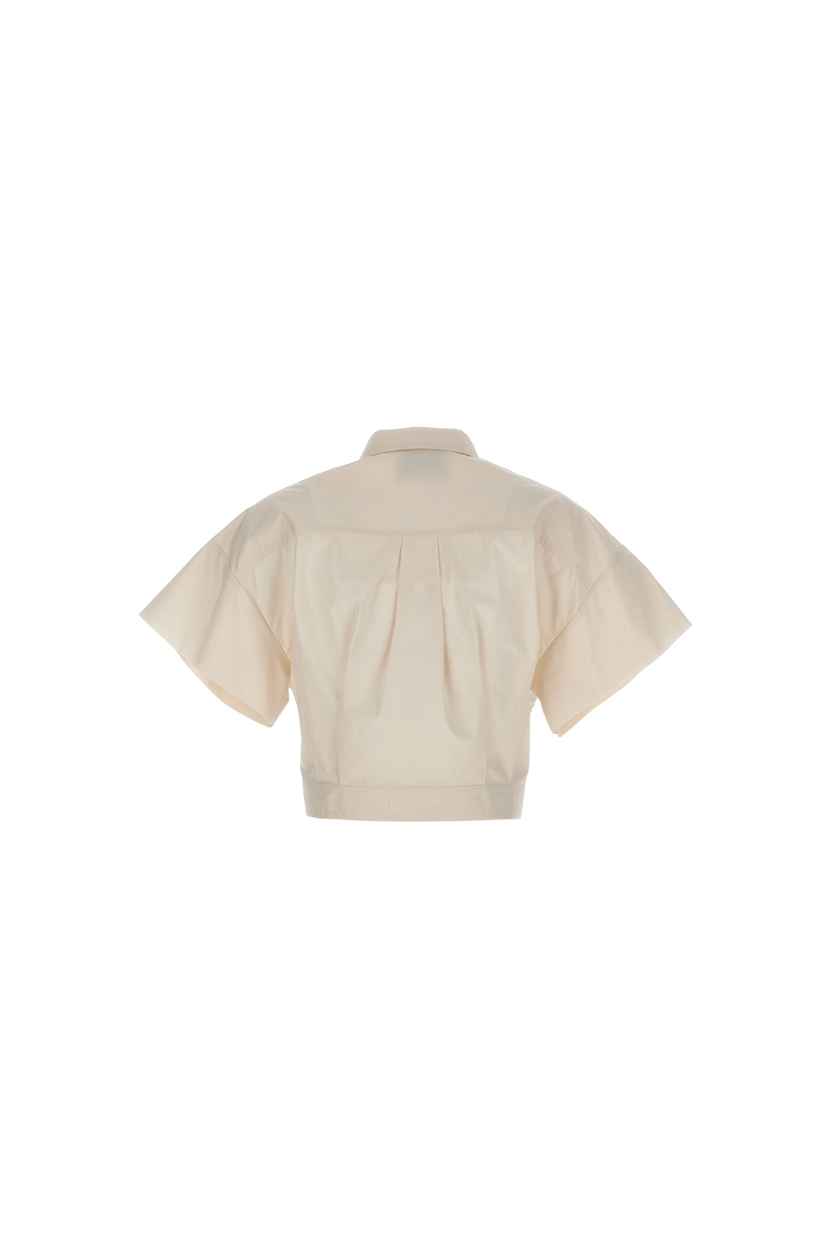 Cropped cotton shirt with front sequin applique, a button closure and short sleeves.