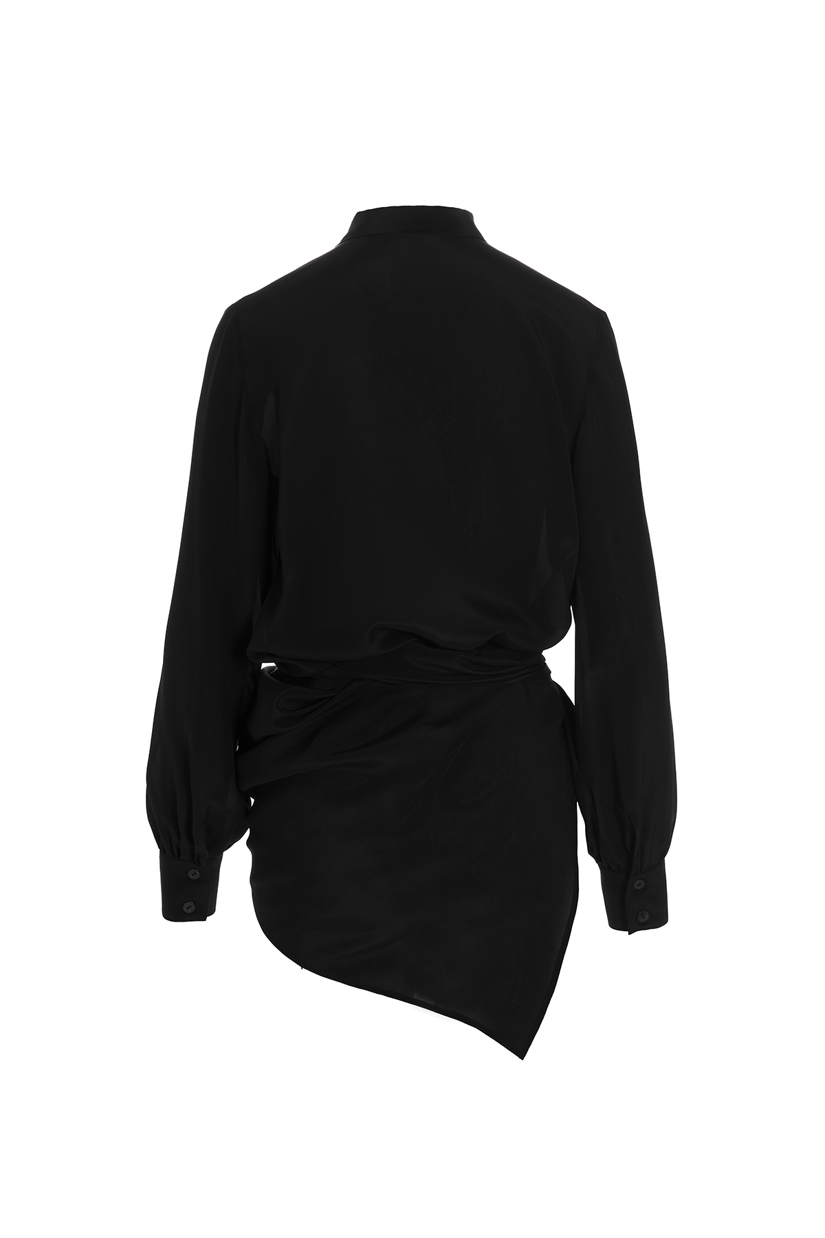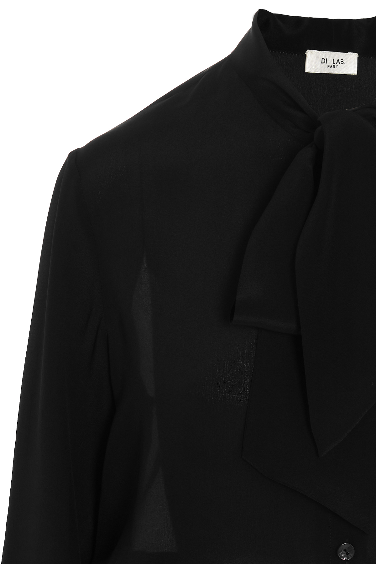 Asymmetrical shirt on the transparent silk hemline, pussy bow, button closure and long cuffed sleeves.