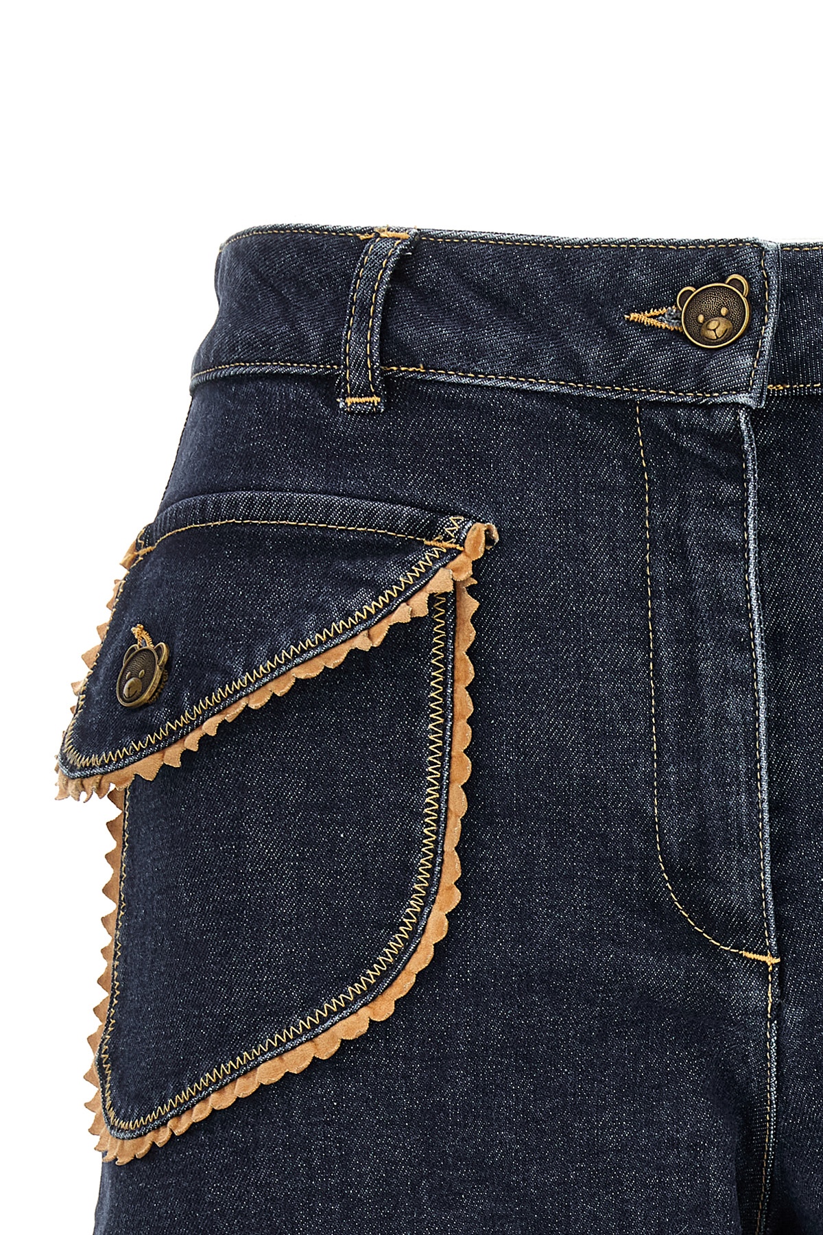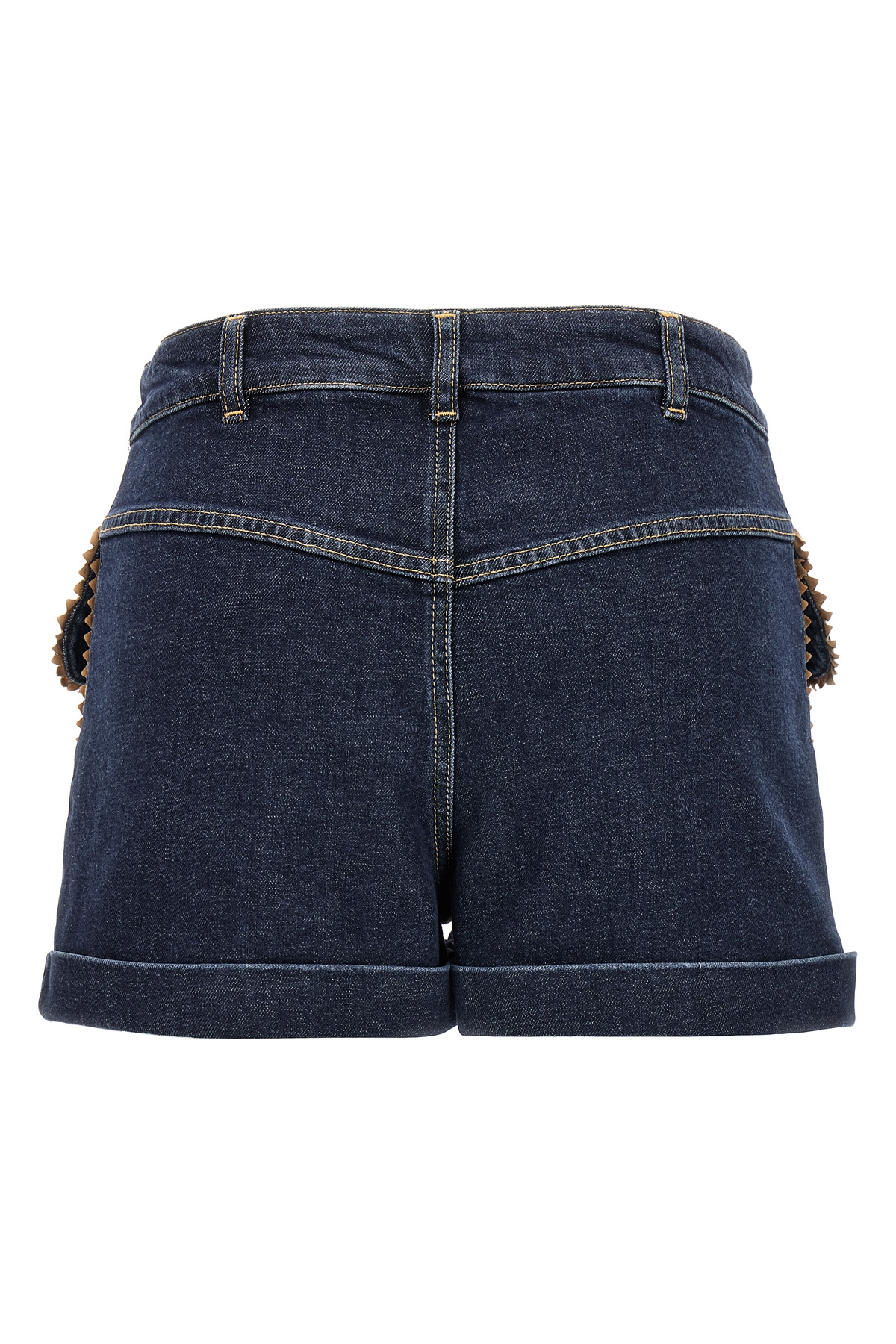 Short in denim con passamaneria a contrasto, dettagli tasche patch frontali con bottoni teddy, modello a vita alta con piega sull'orlo.