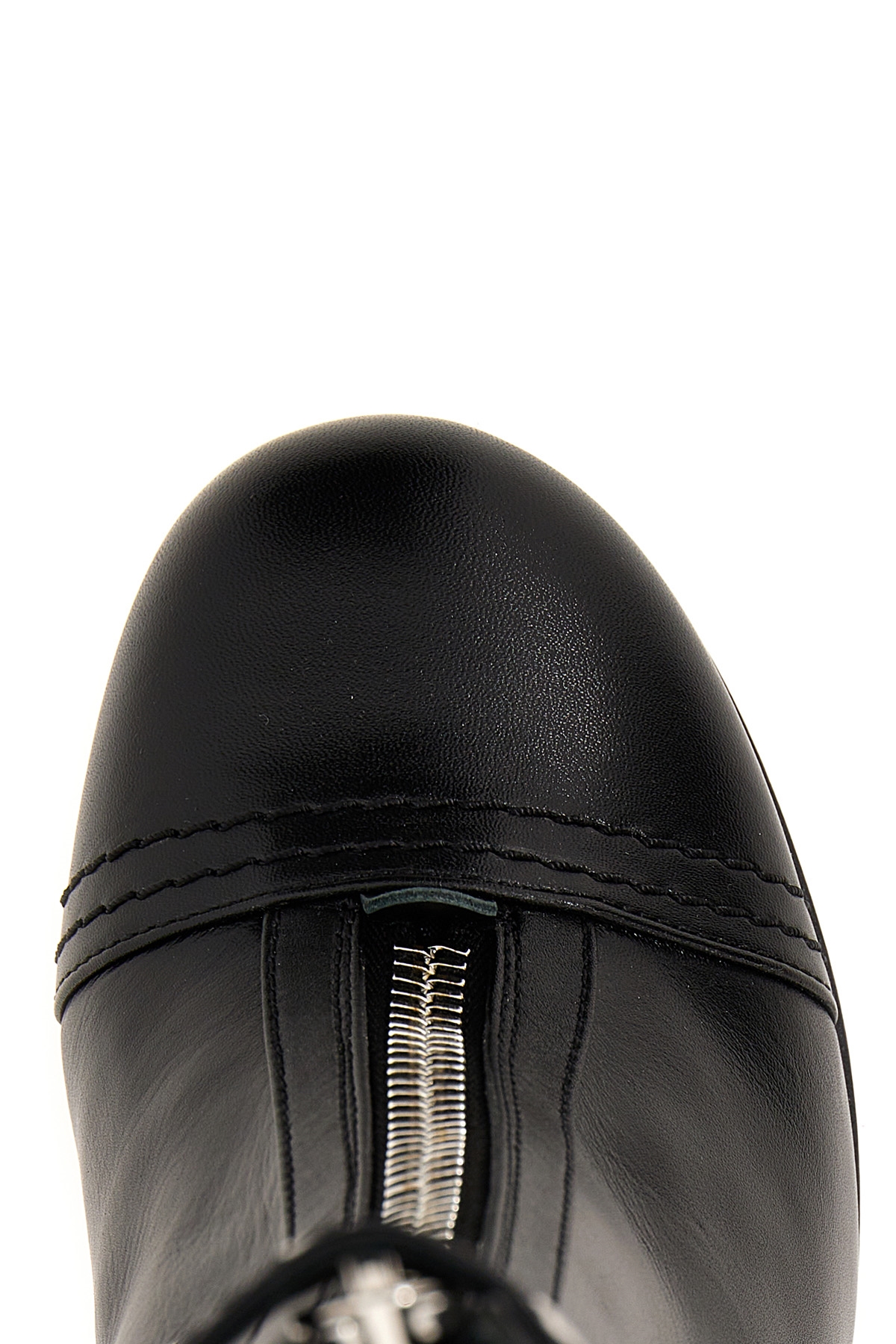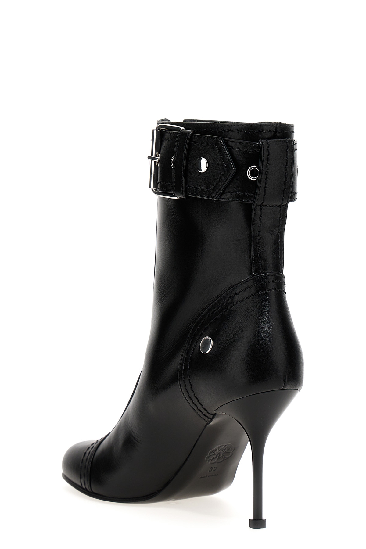 Stivaletto in pelle con dettaglio cinturino e fibbia in metallo argentato, zip frontale, tacco a spillo.