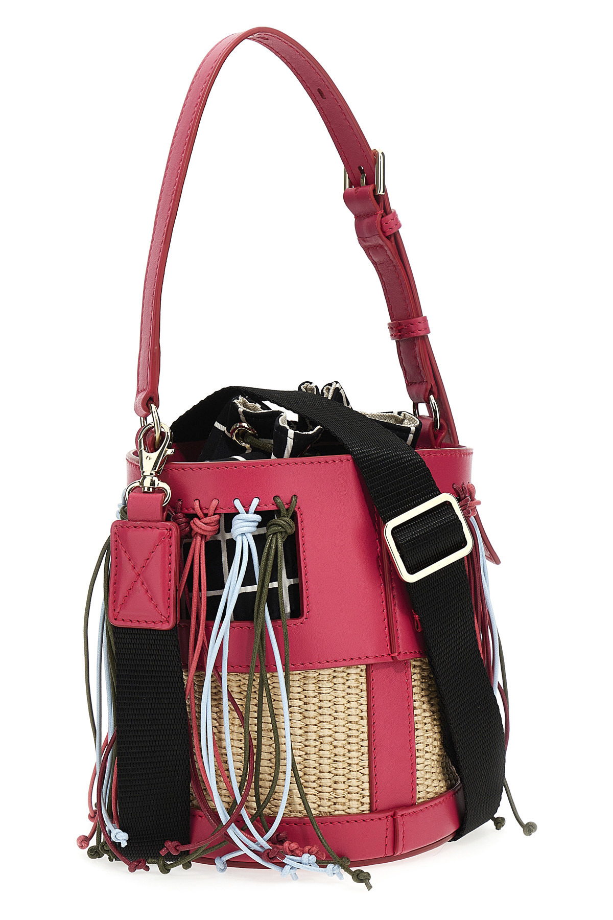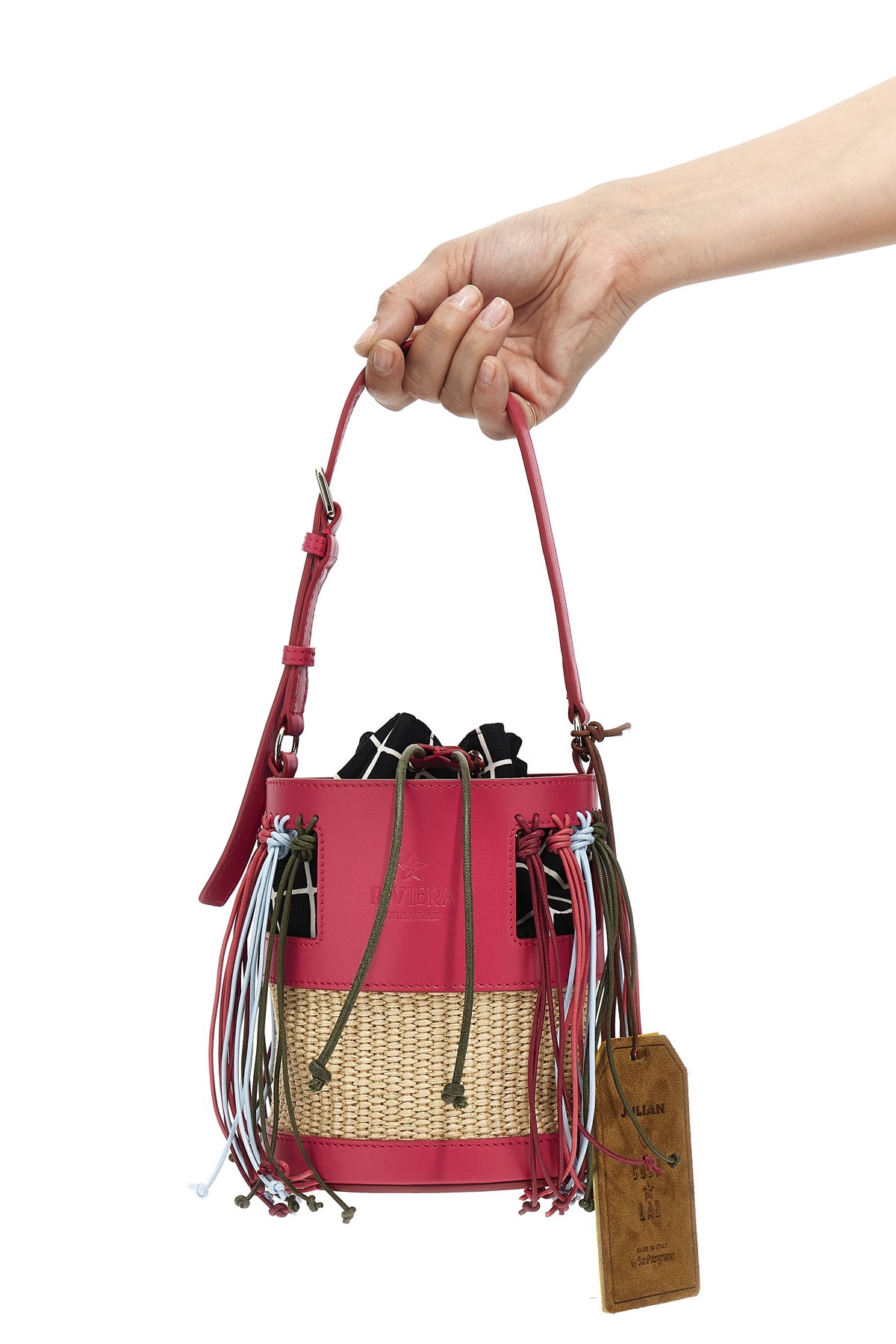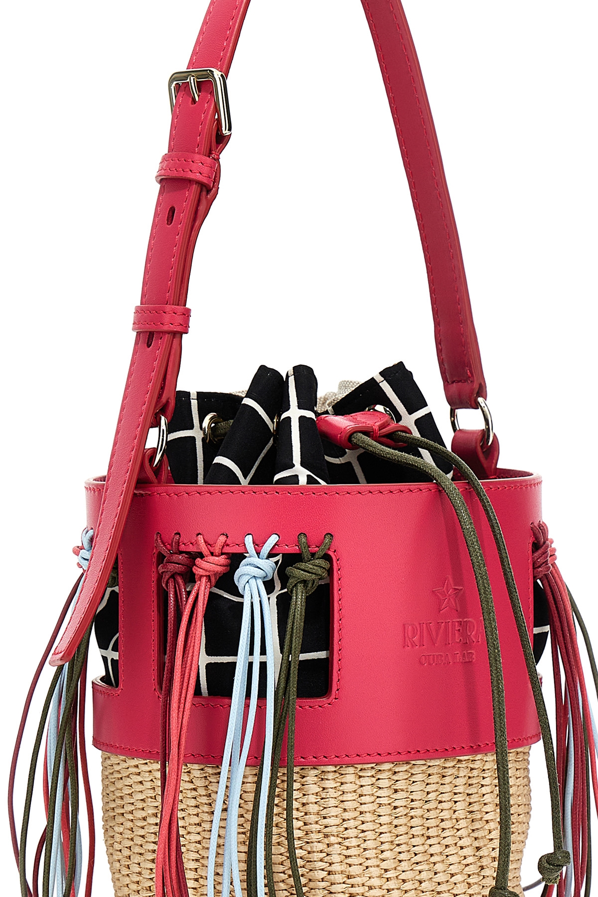 Cuba Lab x SanPa 'Riviera CubaLab' raffia and leather bucket bag with adjustable handle, drawstring closure, a regenerated fabric lining with animal print.