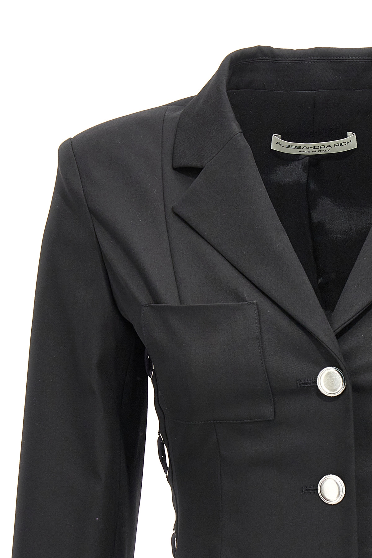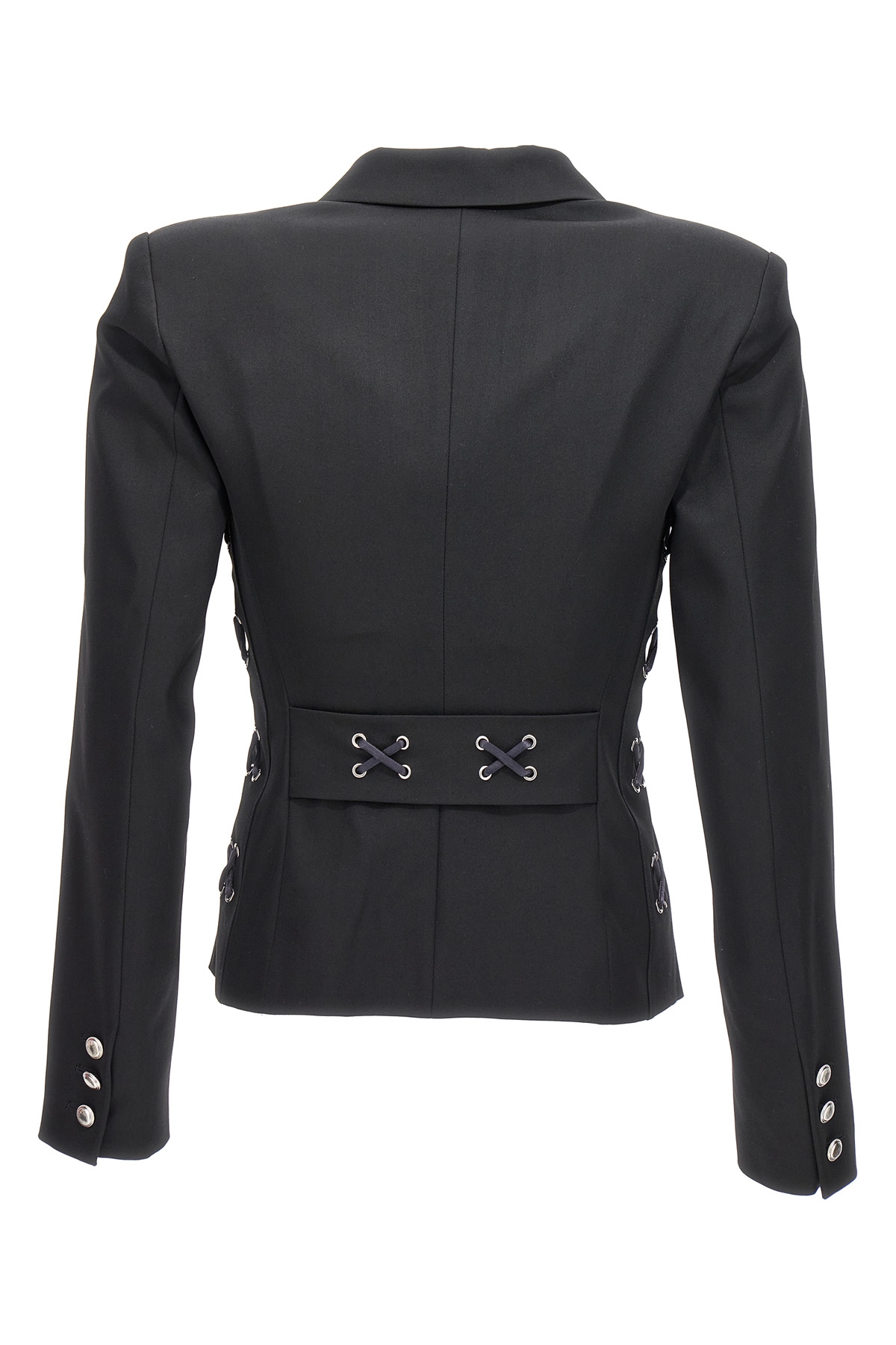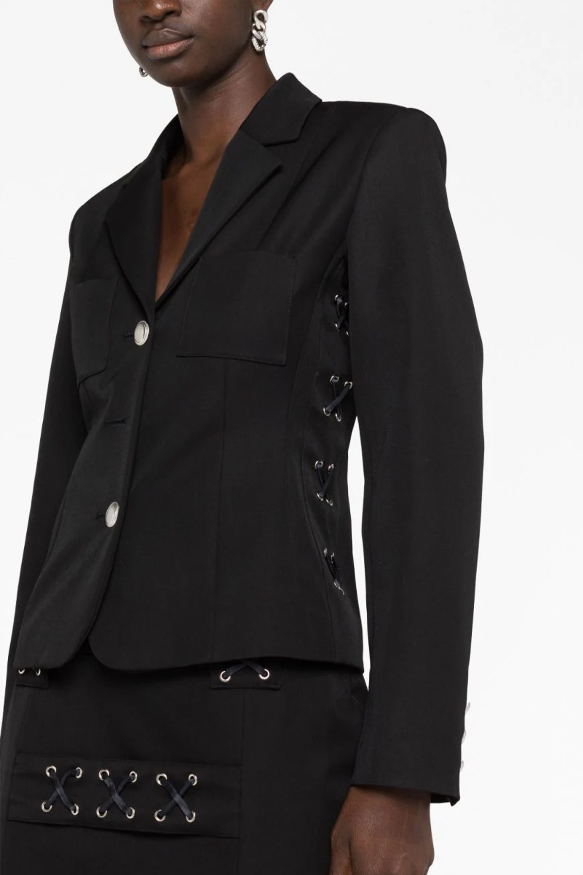 Blazer monopetto in misto lana con dettaglio lacci, chiusura bottoni frontale, taschini frontali, martingala posteriore, manica lunga, spalline imbottite.