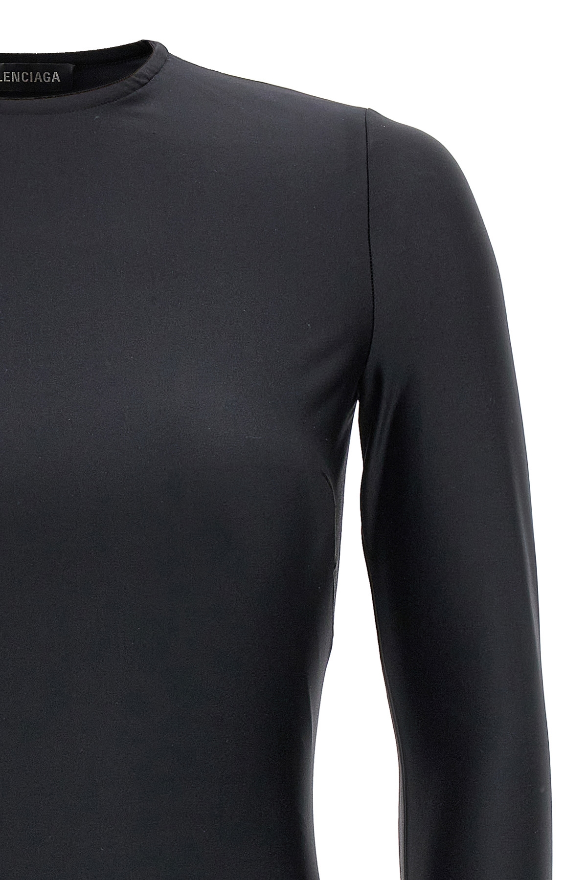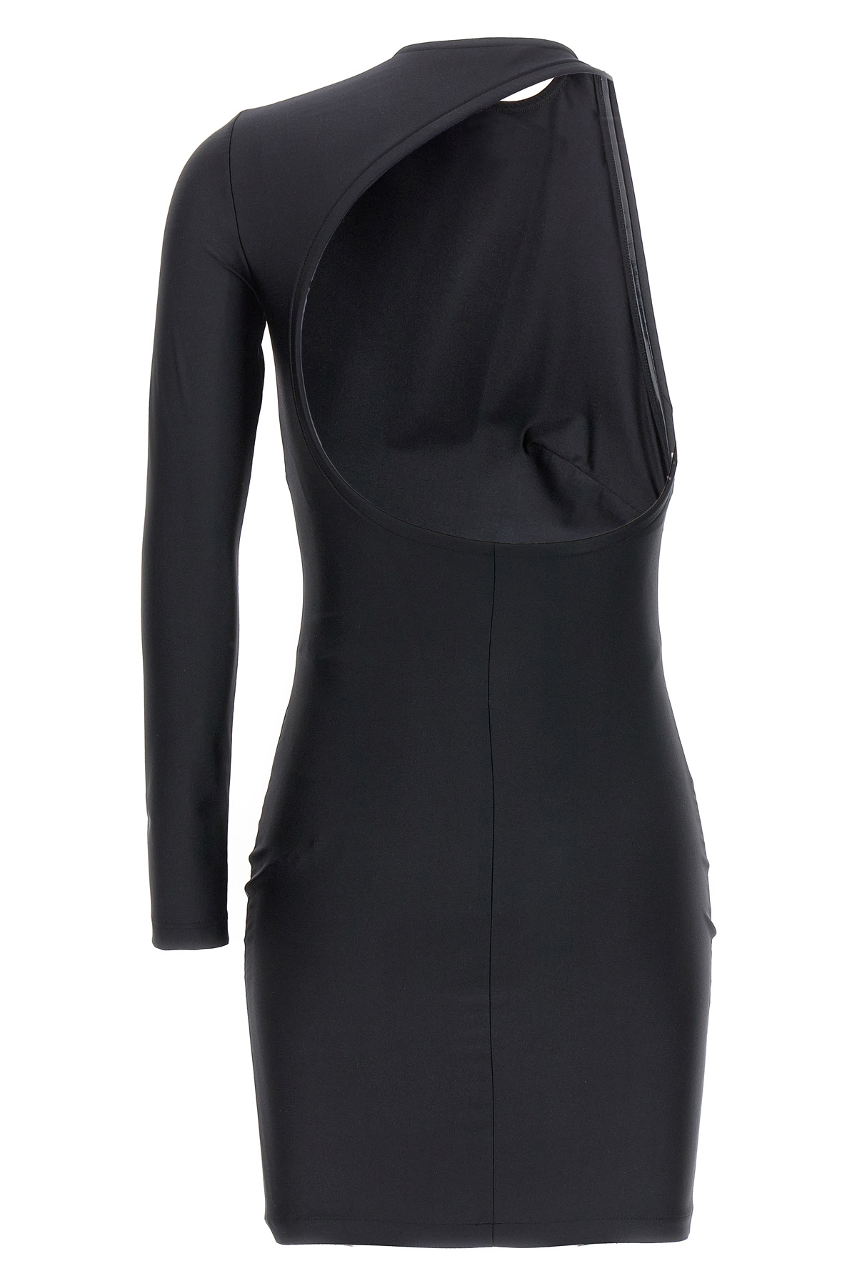 One shoulder stretch fabric dress with cut out detail on the back, long sleeves and inner briefs with button closure.