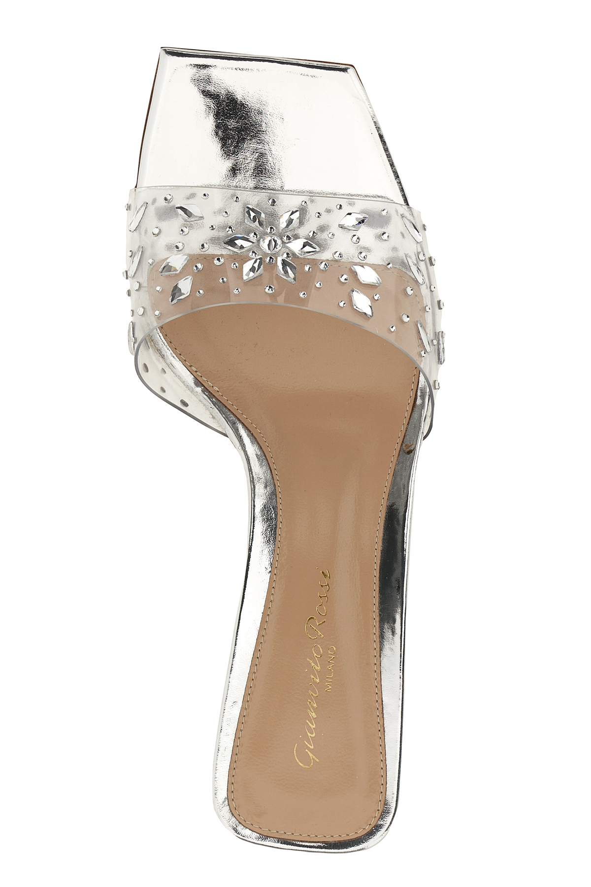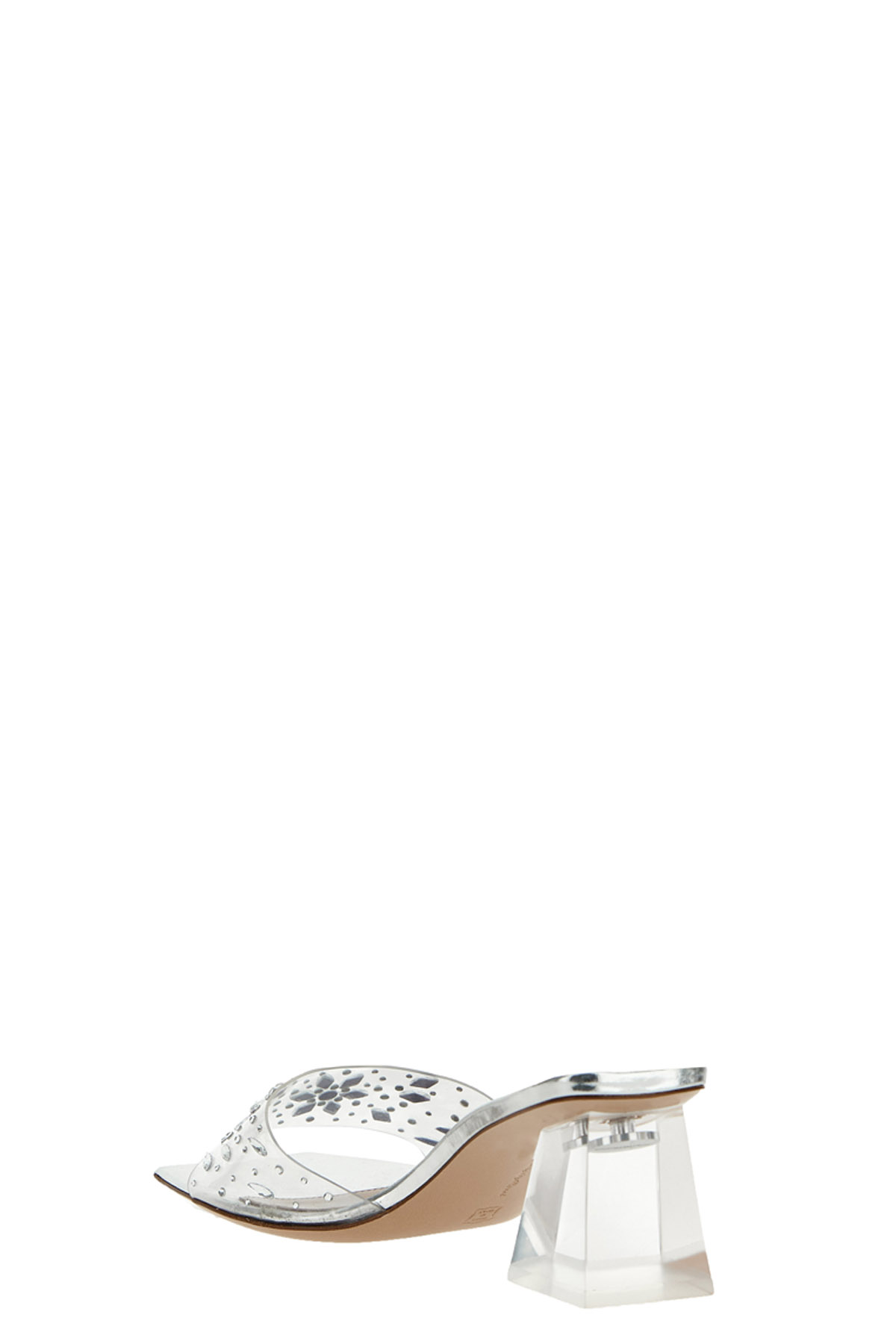 Laminated leather and PVC sandals with rhinestone applique and transparent sculpted heel.