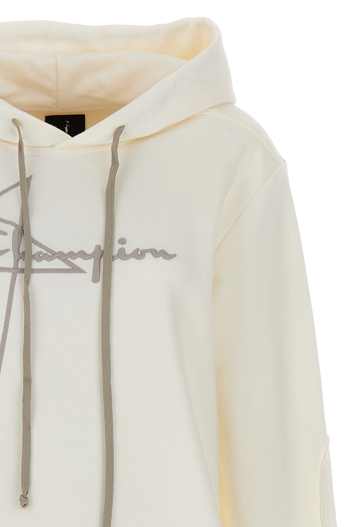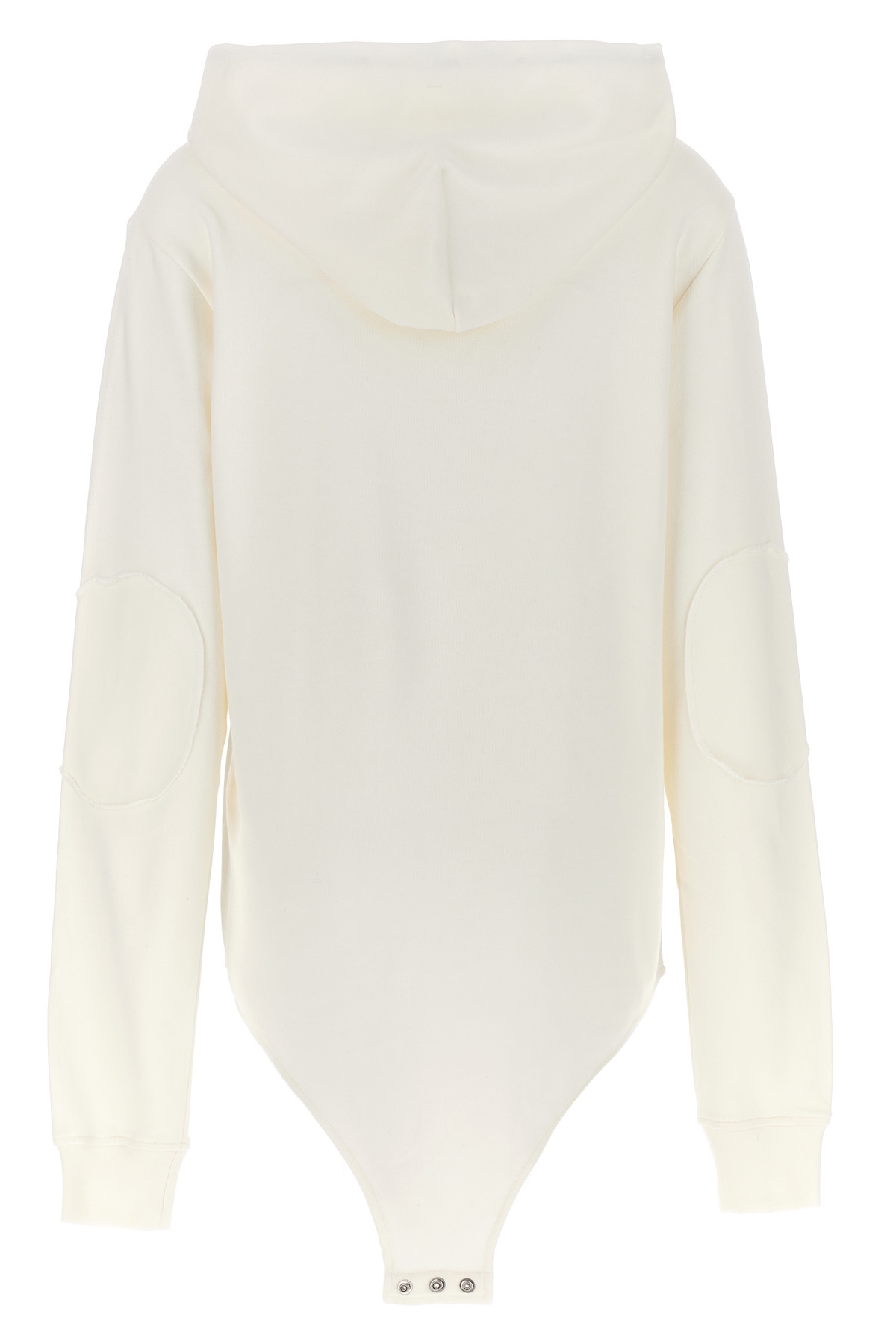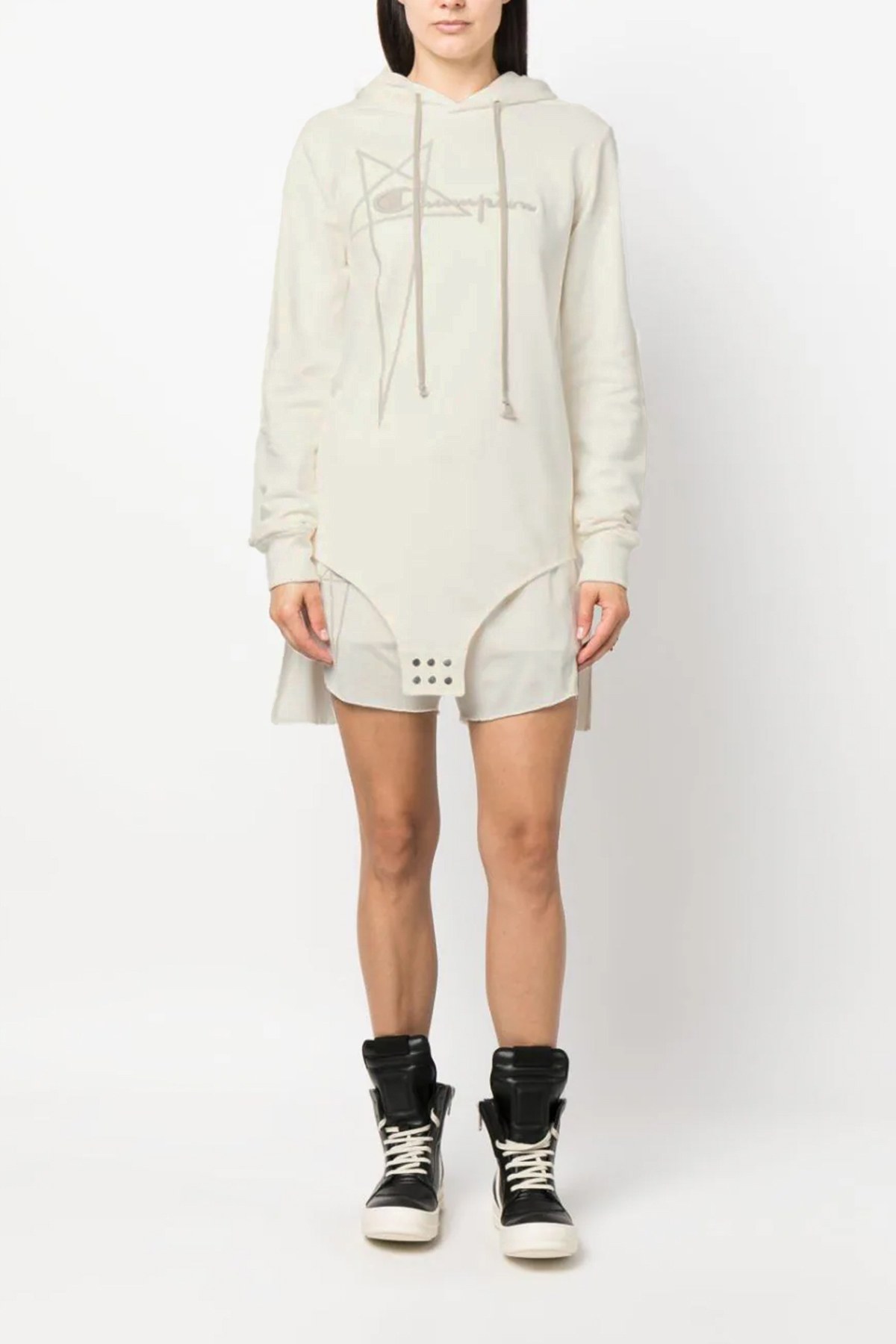 Champion x Rick Owens hooded bodysuit in cotton sweatshirt fabric with front embroidery.