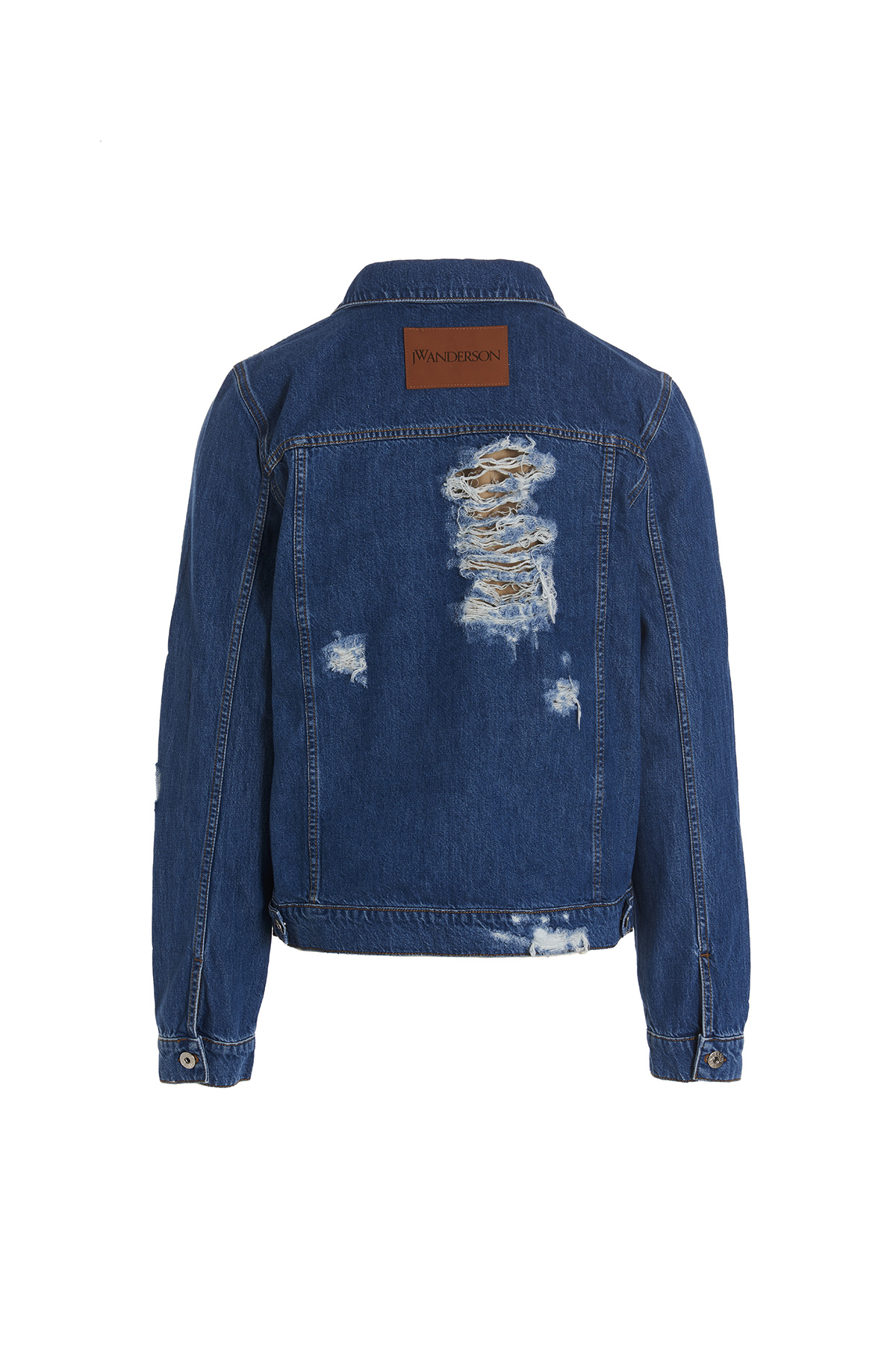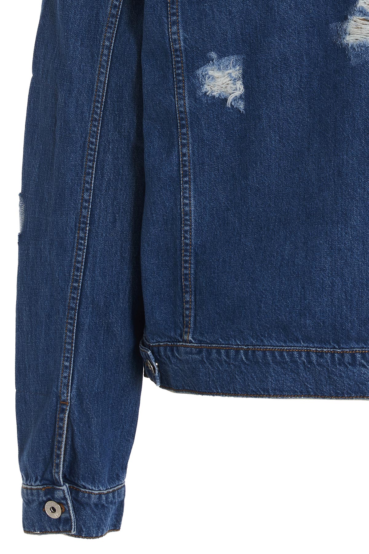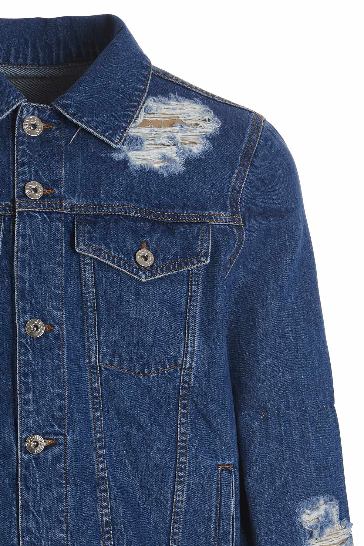 Distressed and destroyed effect cotton denim jacket, with button closure, pockets, back leather logo patch, long cuffed sleeves.