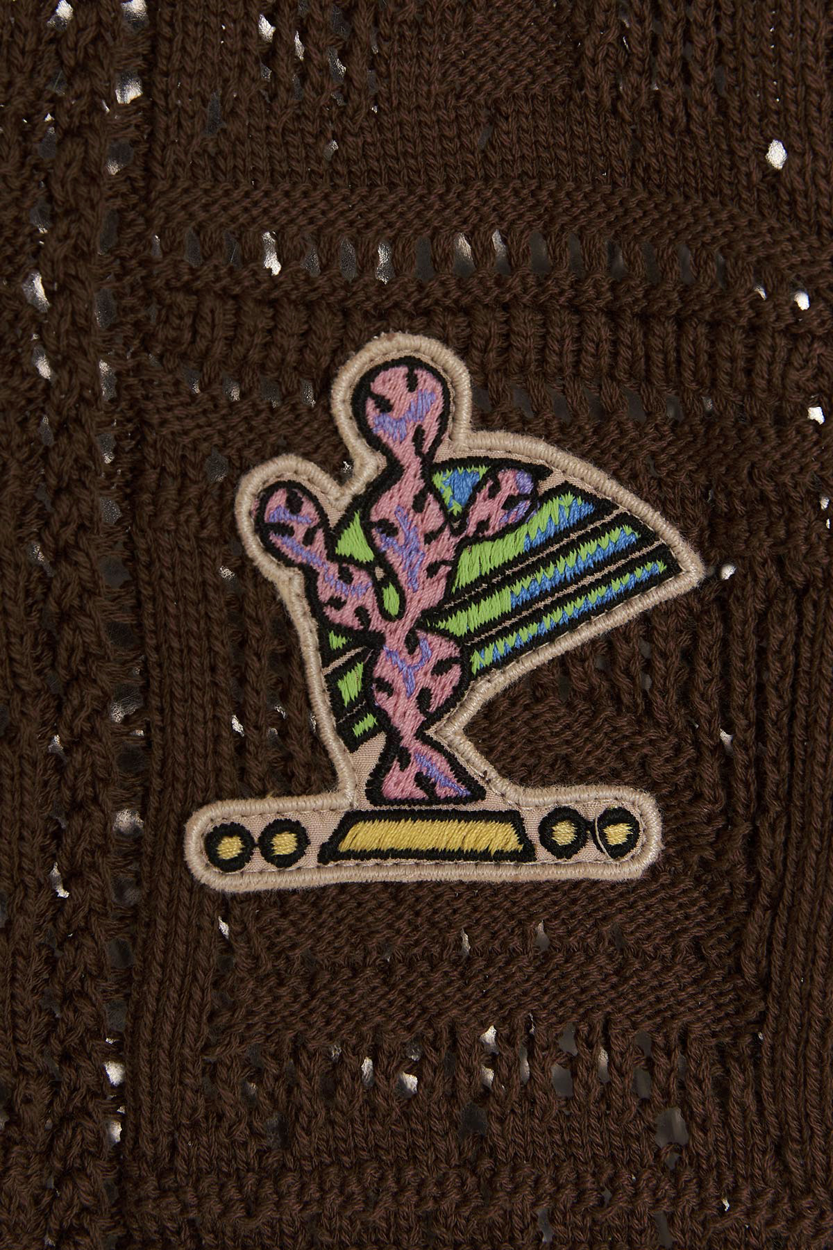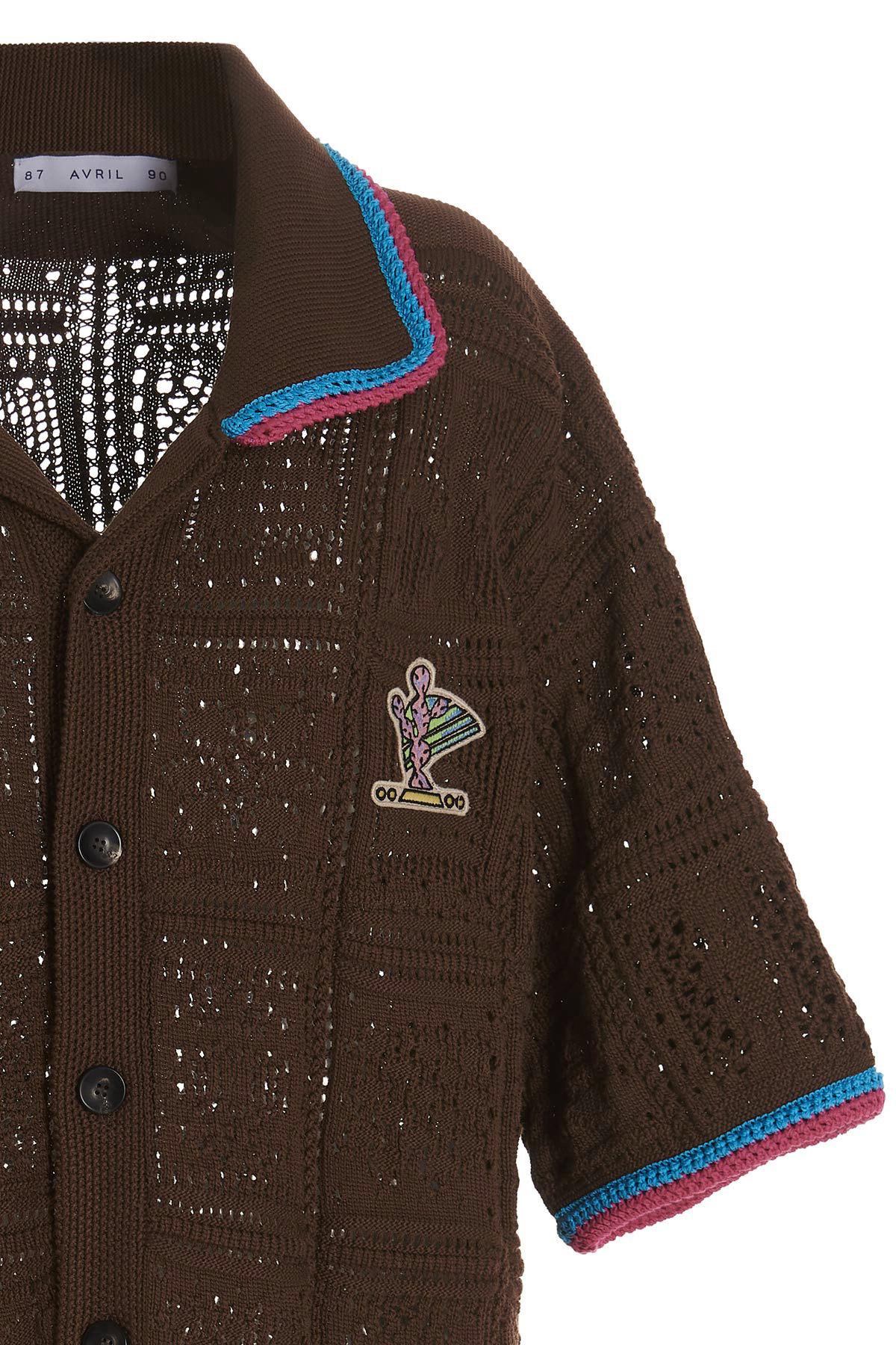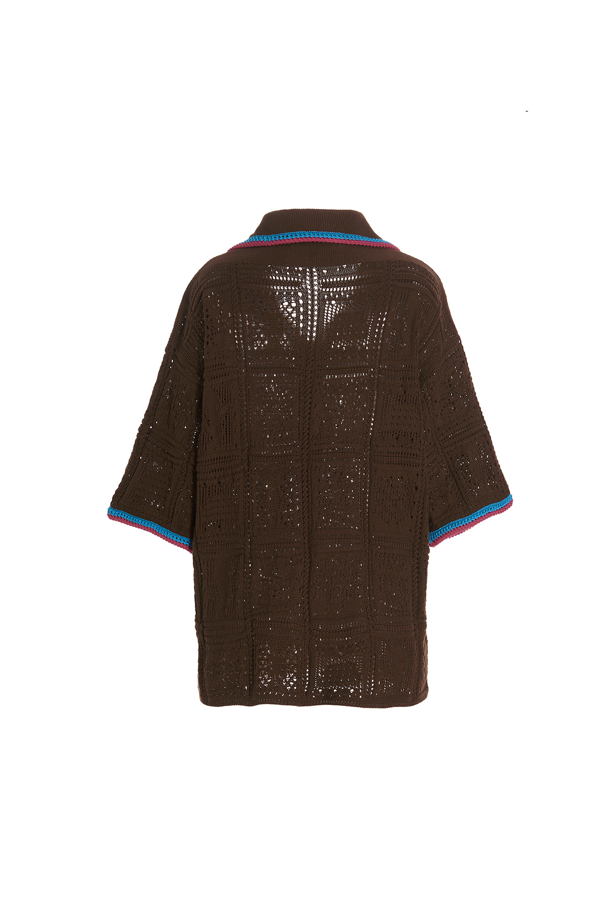 Crochet cotton shirt with contrast edging, front patch applique, a button closure and short sleeves.