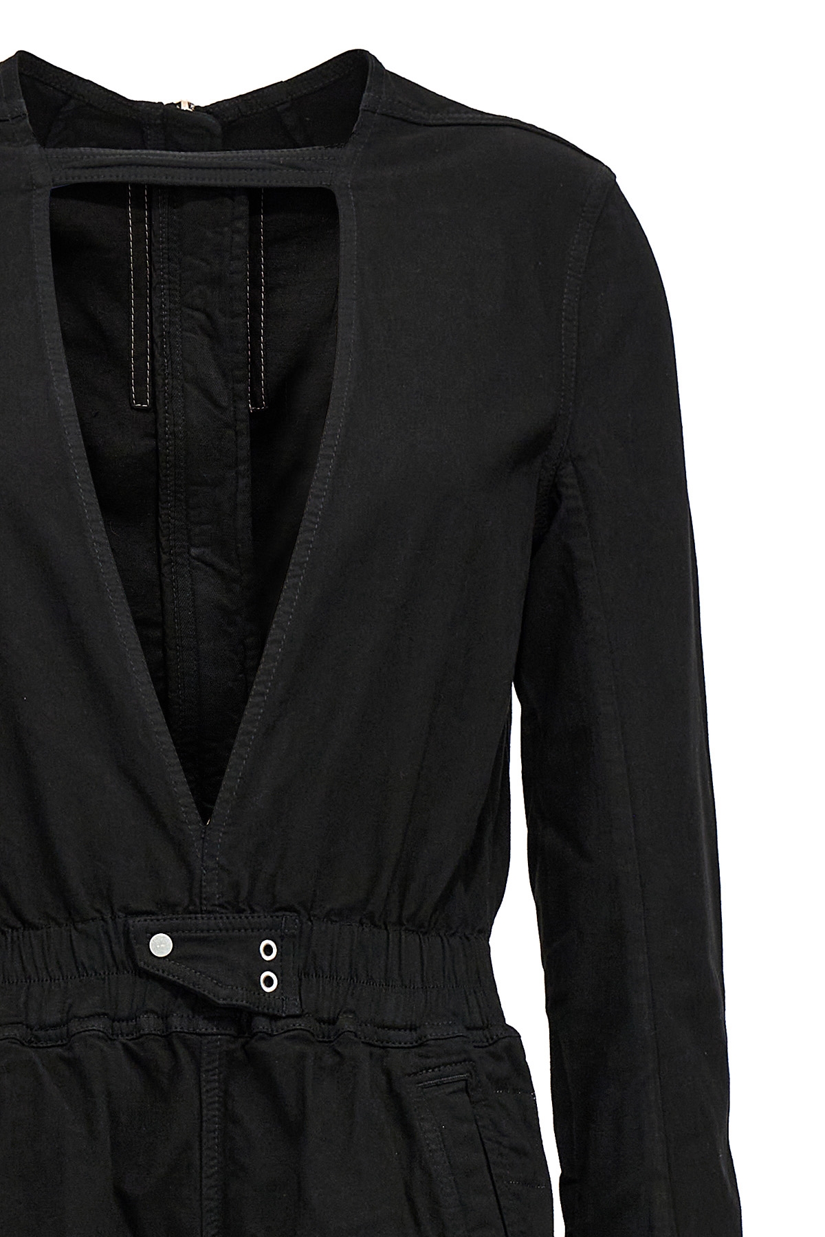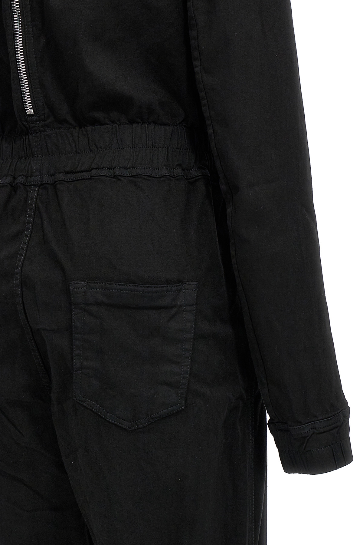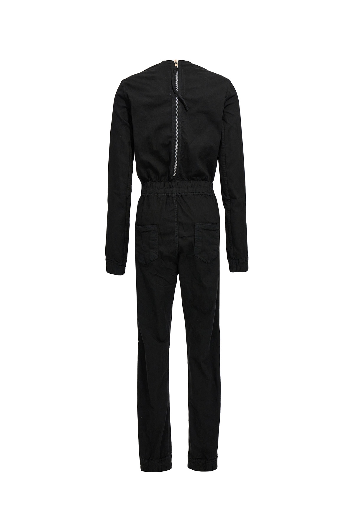 Eclipse Bodybag' one-piece coated canvas bodysuit, with long sleeves, a front V-neck, a central zip closure at the back, an elastic waistband, pockets, and a long ankle elastic leg.