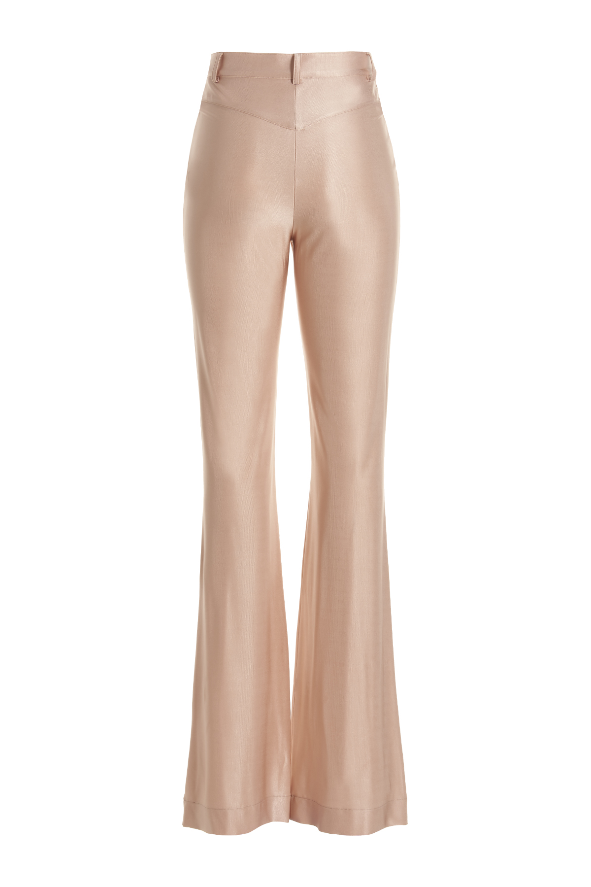 Shiny stretch pants with zip, hook and button closure, pockets.