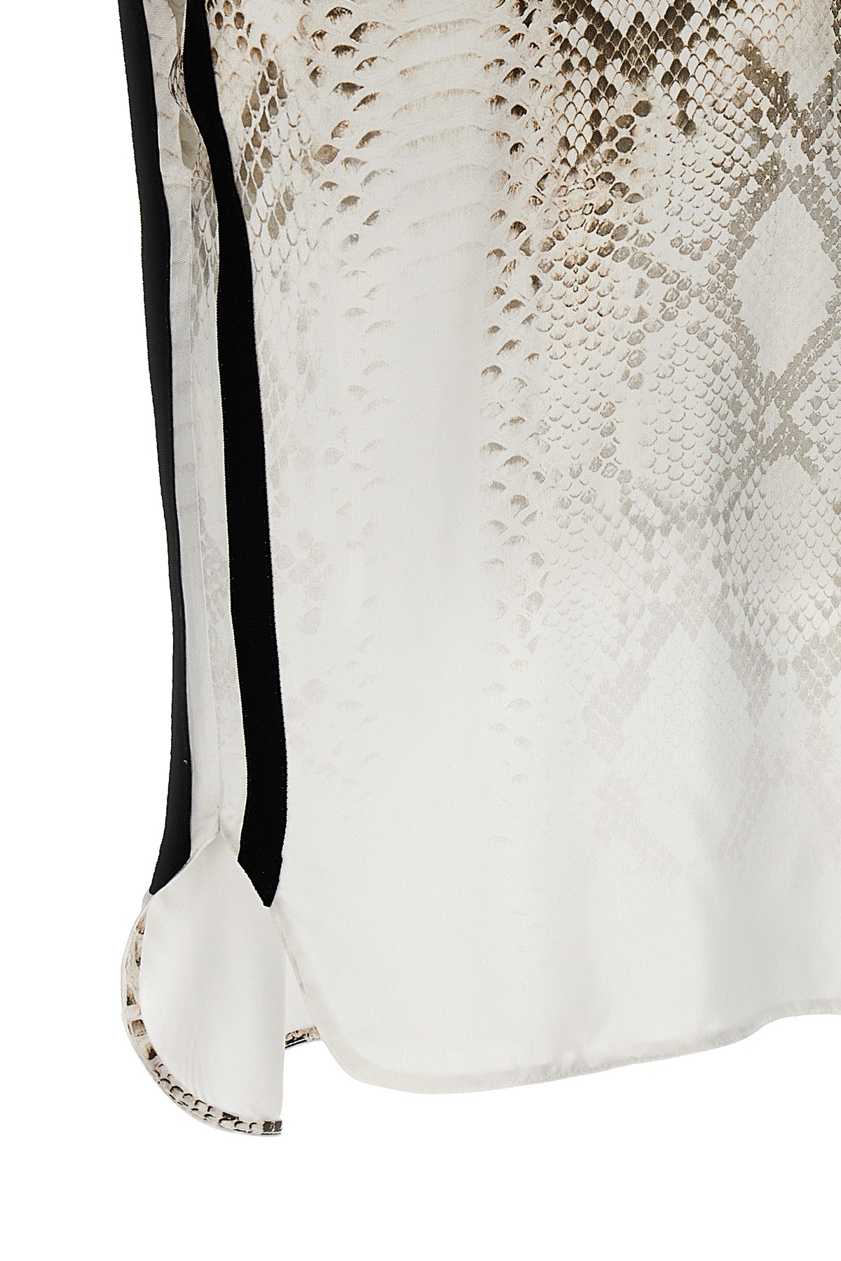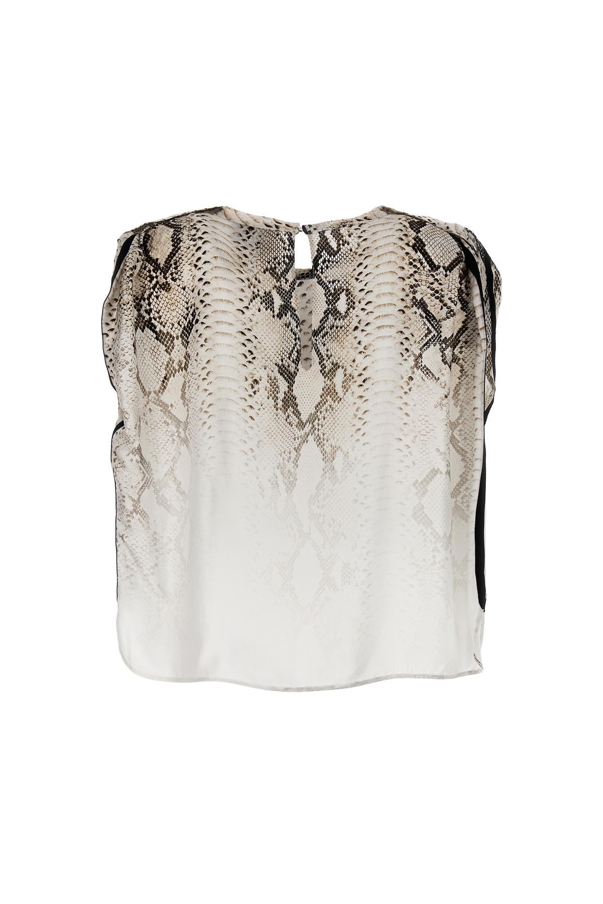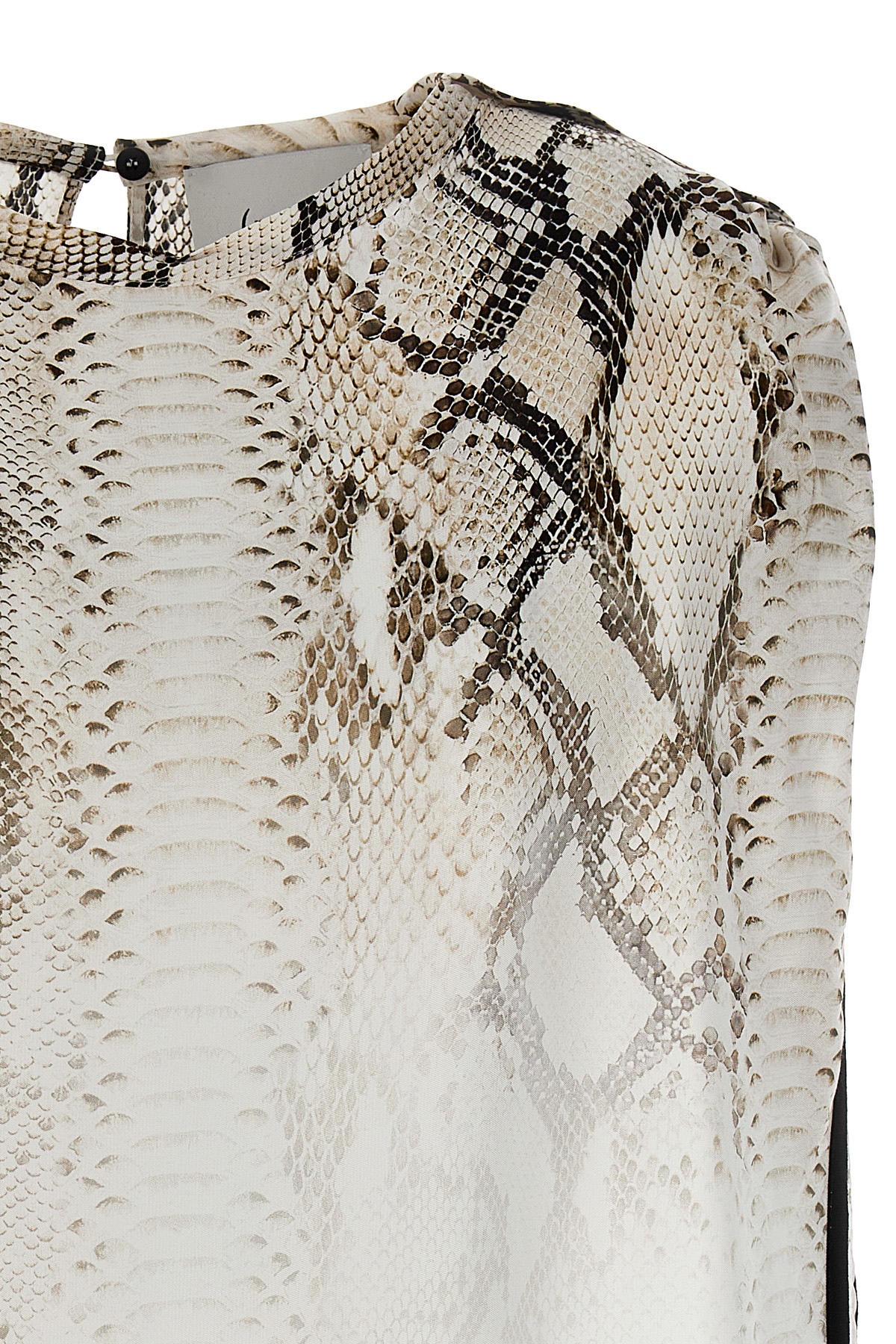 All over 'Snake' print viscose blous with crewneck, short sleeves gathered on the shoulder and contrast side bands.