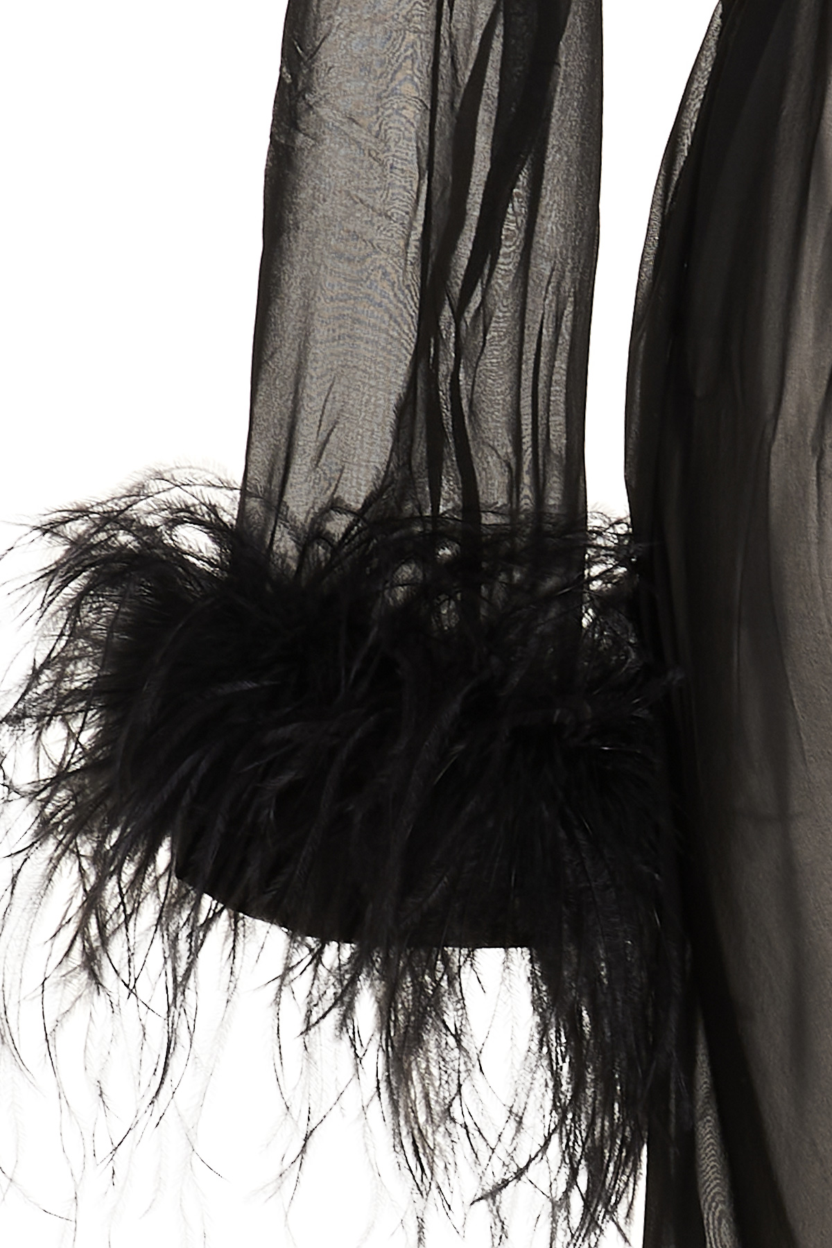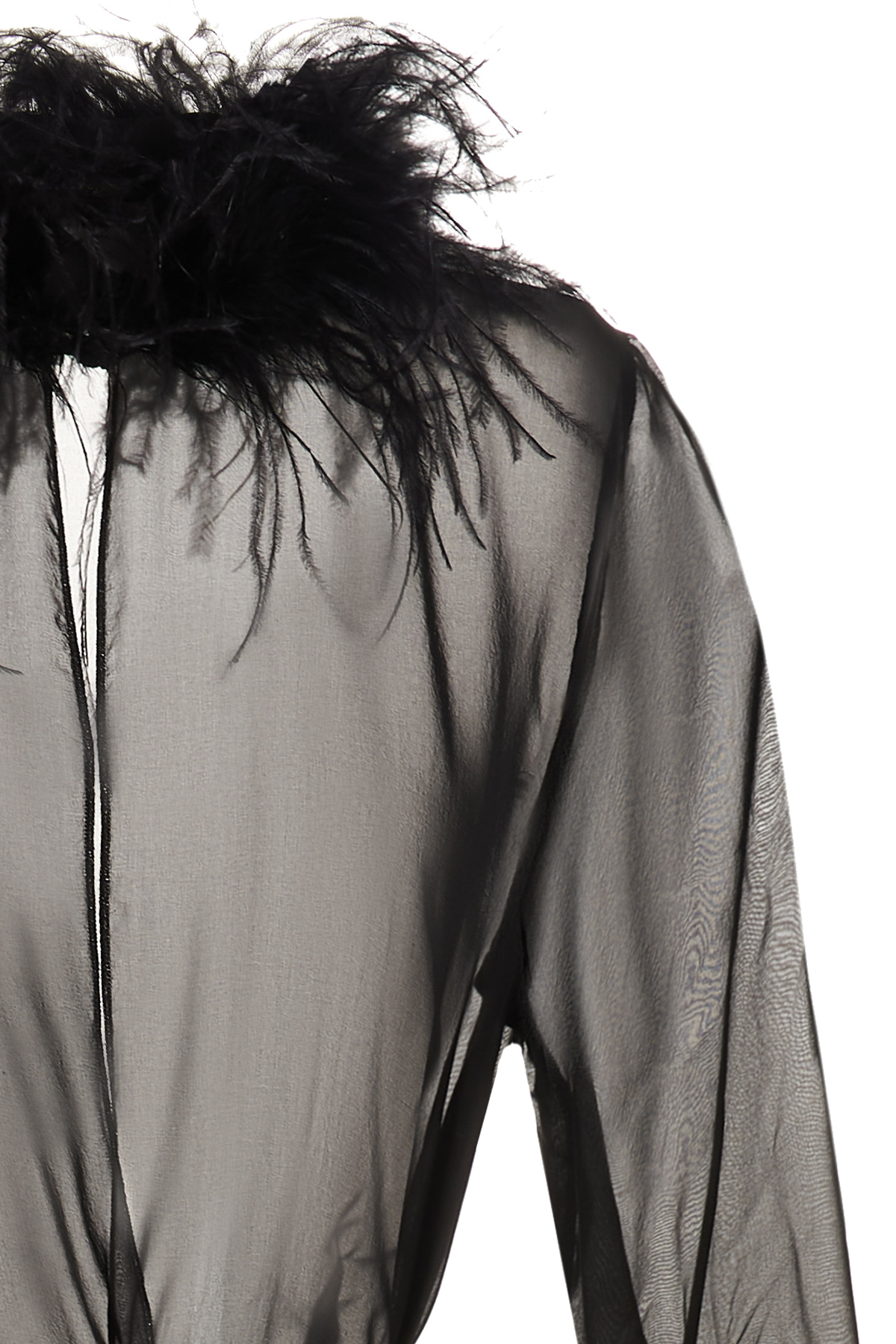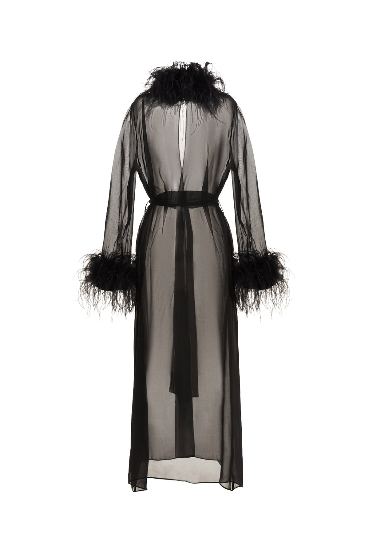 Transparent silk robe with a feather applique on the neck and sleeve ends, a belted waist closure, and long sleeves.