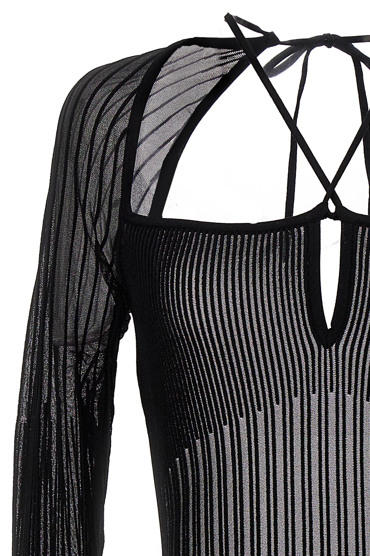 Long ribbed viscose blend dress with long sleeves, lacing at the neck, cut-out details and a bare back.