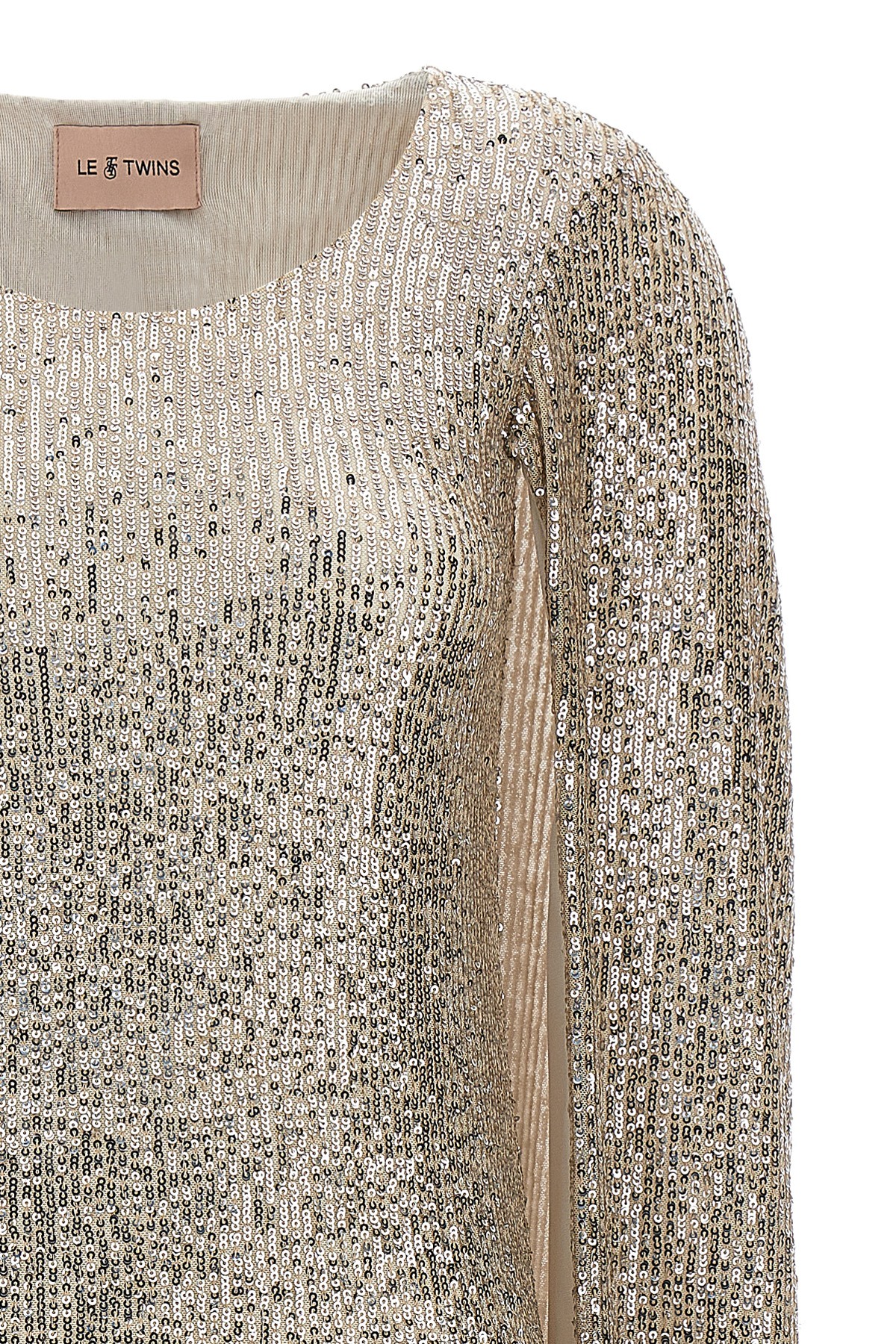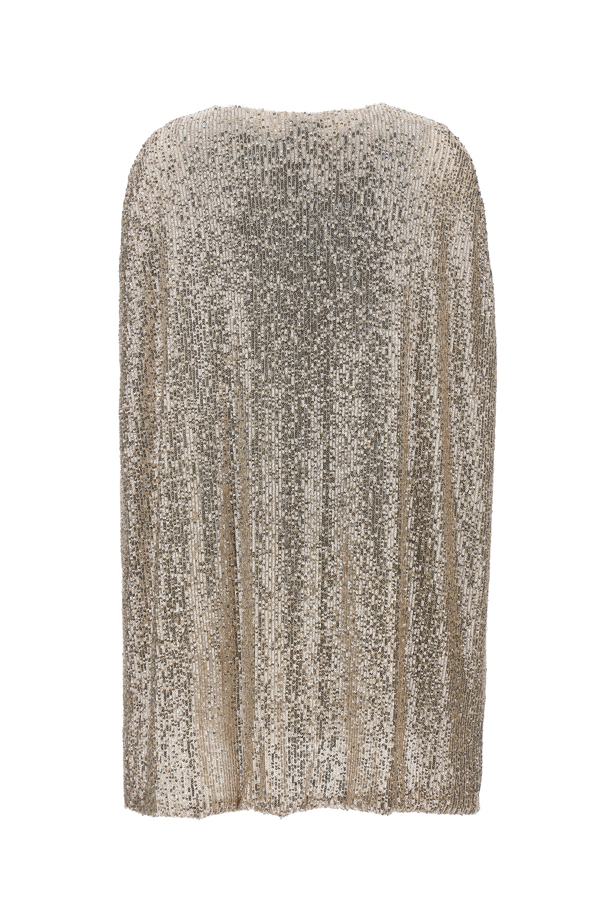 'Cashmere' dress in a stretch fabric withll over sequin applique, a crewneck, with cape at the back.