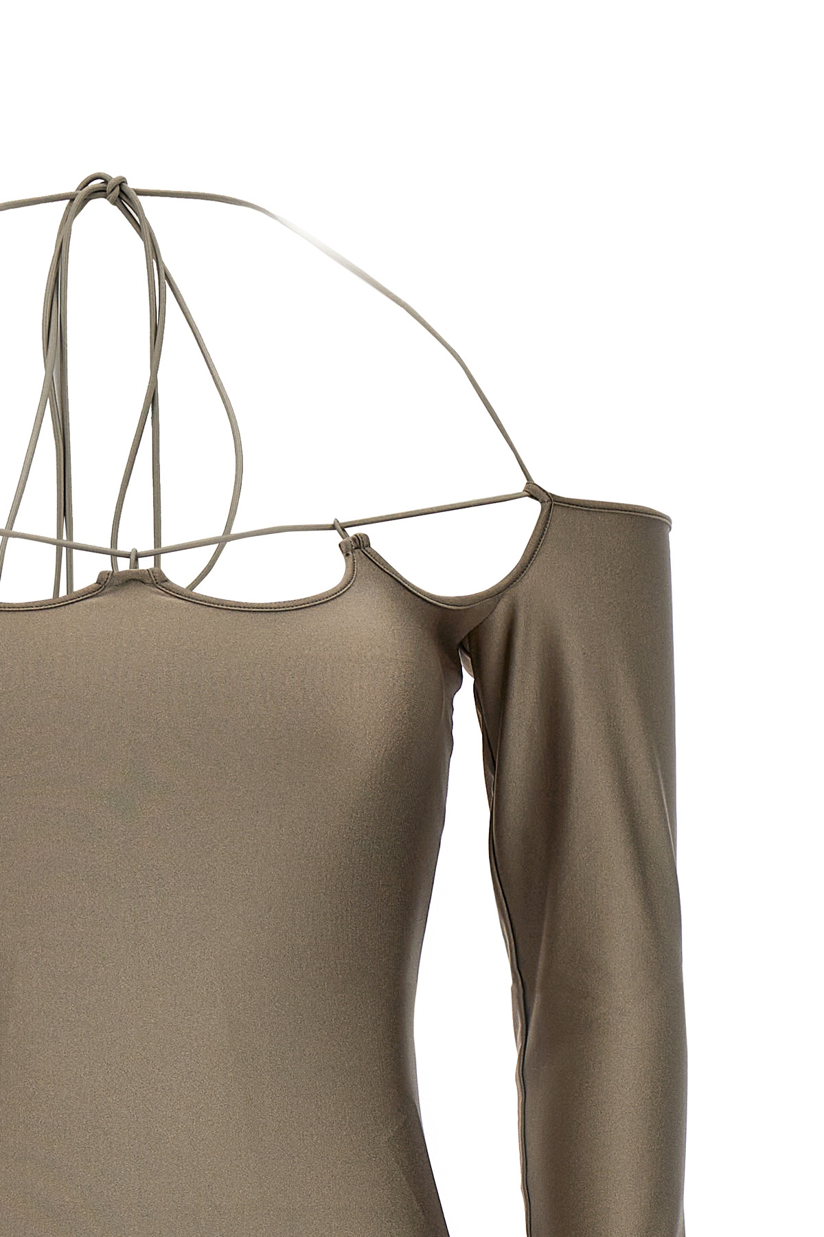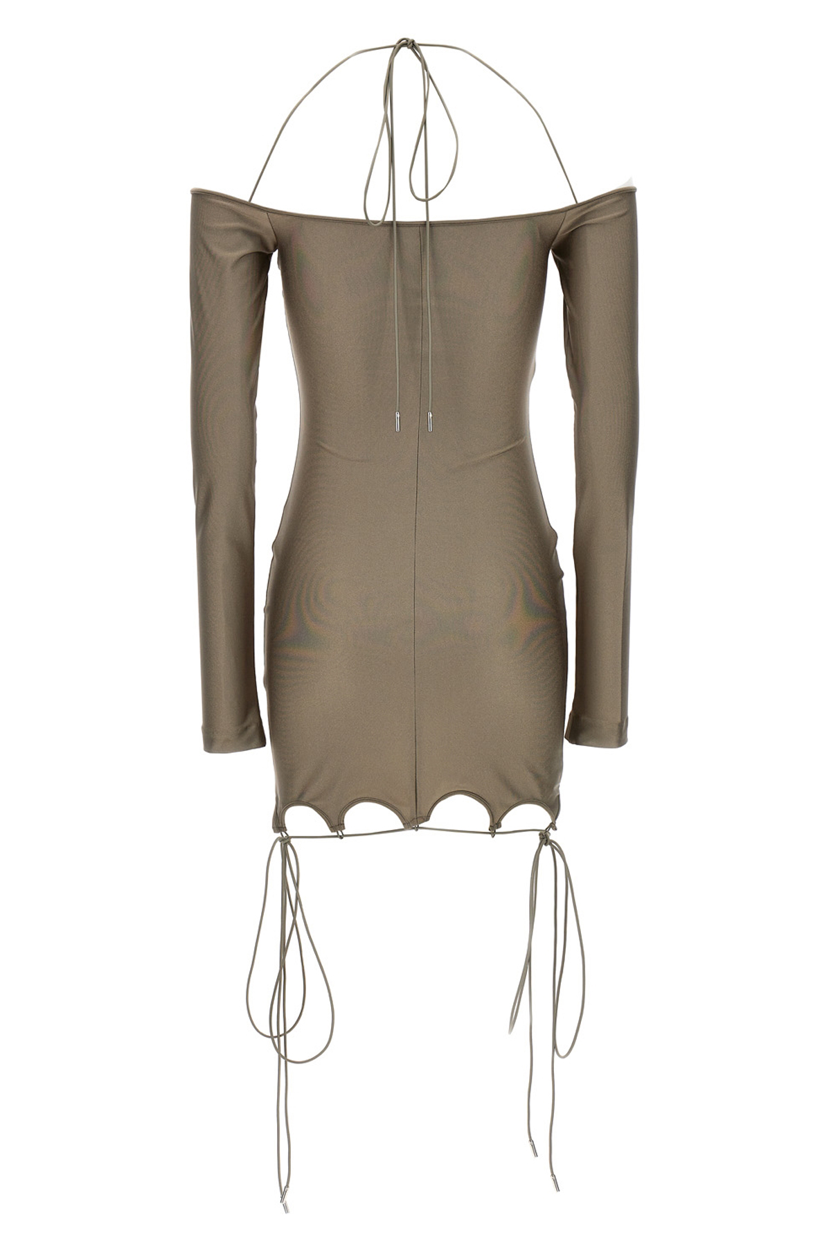 Lyna' shiny military lycra dress with flared neckline and hem and metal logo final.
