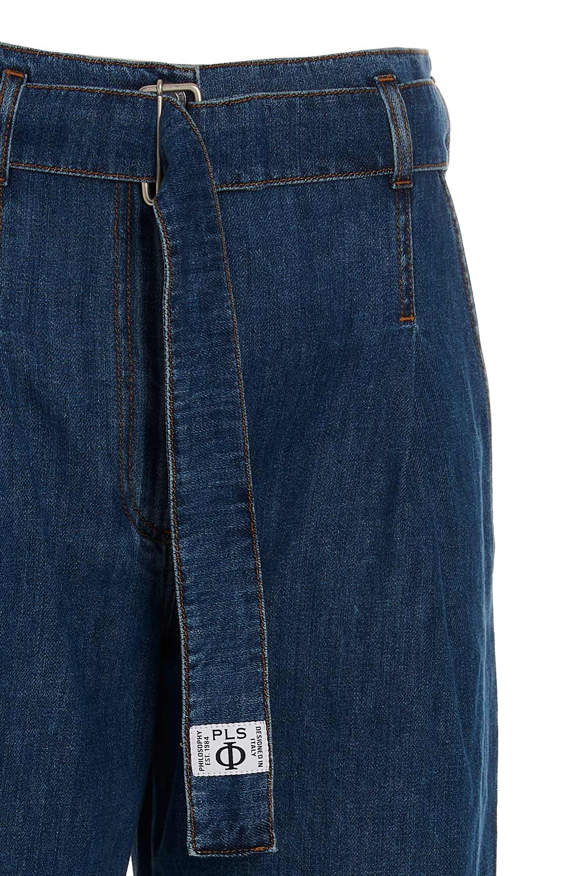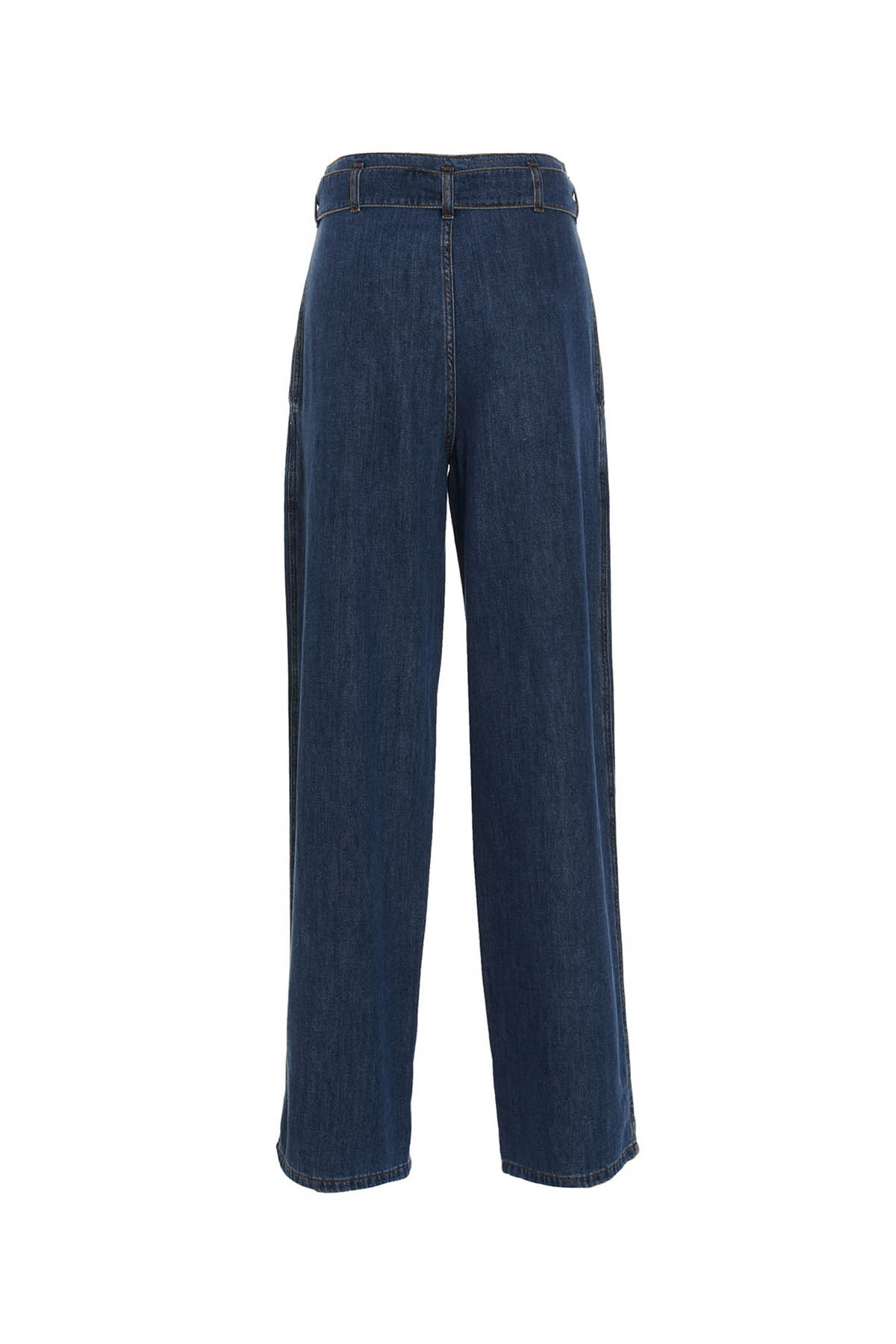 Cotton denim jeans with removable waist belt, zip and button closure, front pleats, pockets and a loose leg.