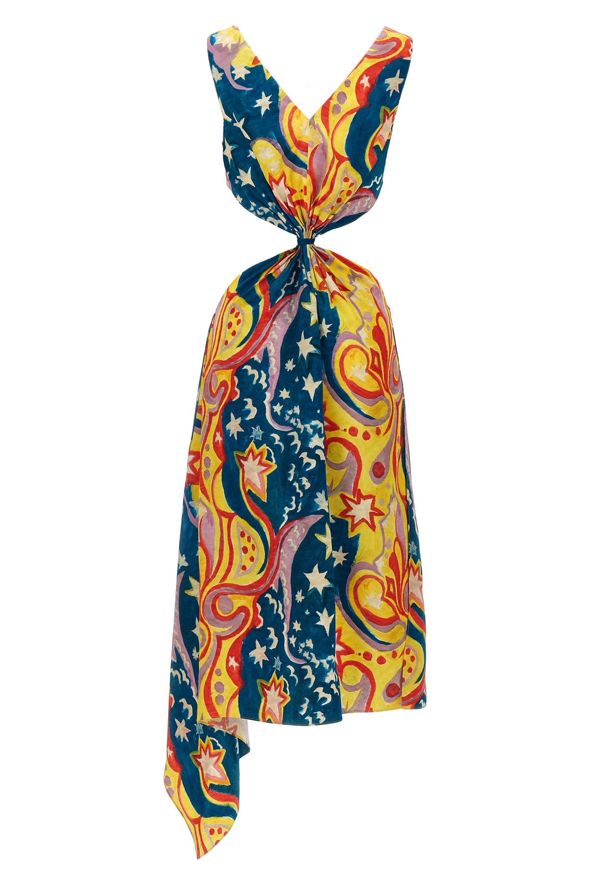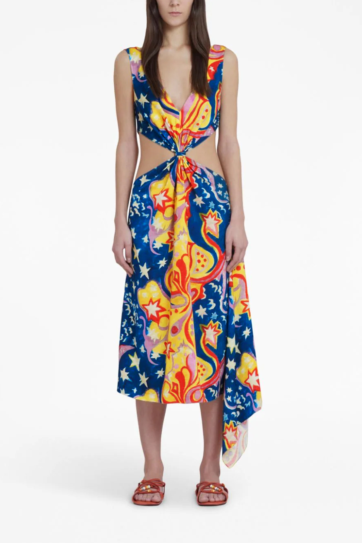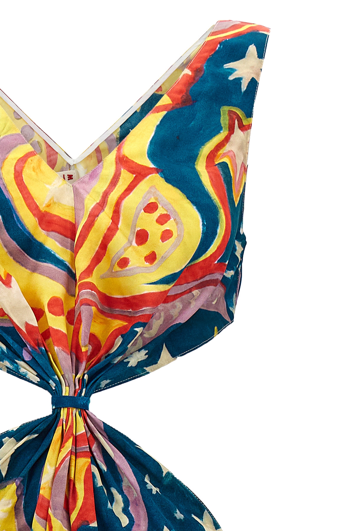 No Vacancy Inn' high Summer capsule viscose dress with all over print, front and back V-neck, knot detail at the waist on the front and back, cut out details on the sides, and sleeveless.