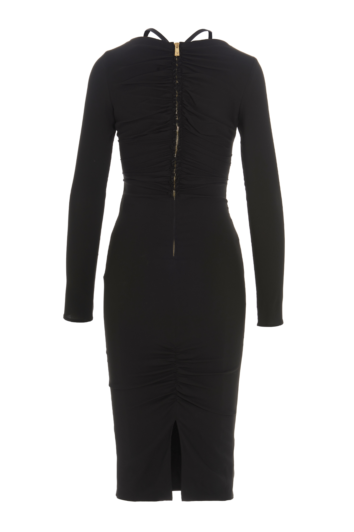 Medusa' viscose midi dress with Medusa strap detailing on the neck, ruffles at the center, a v-neck, long sleeves and ruffles.