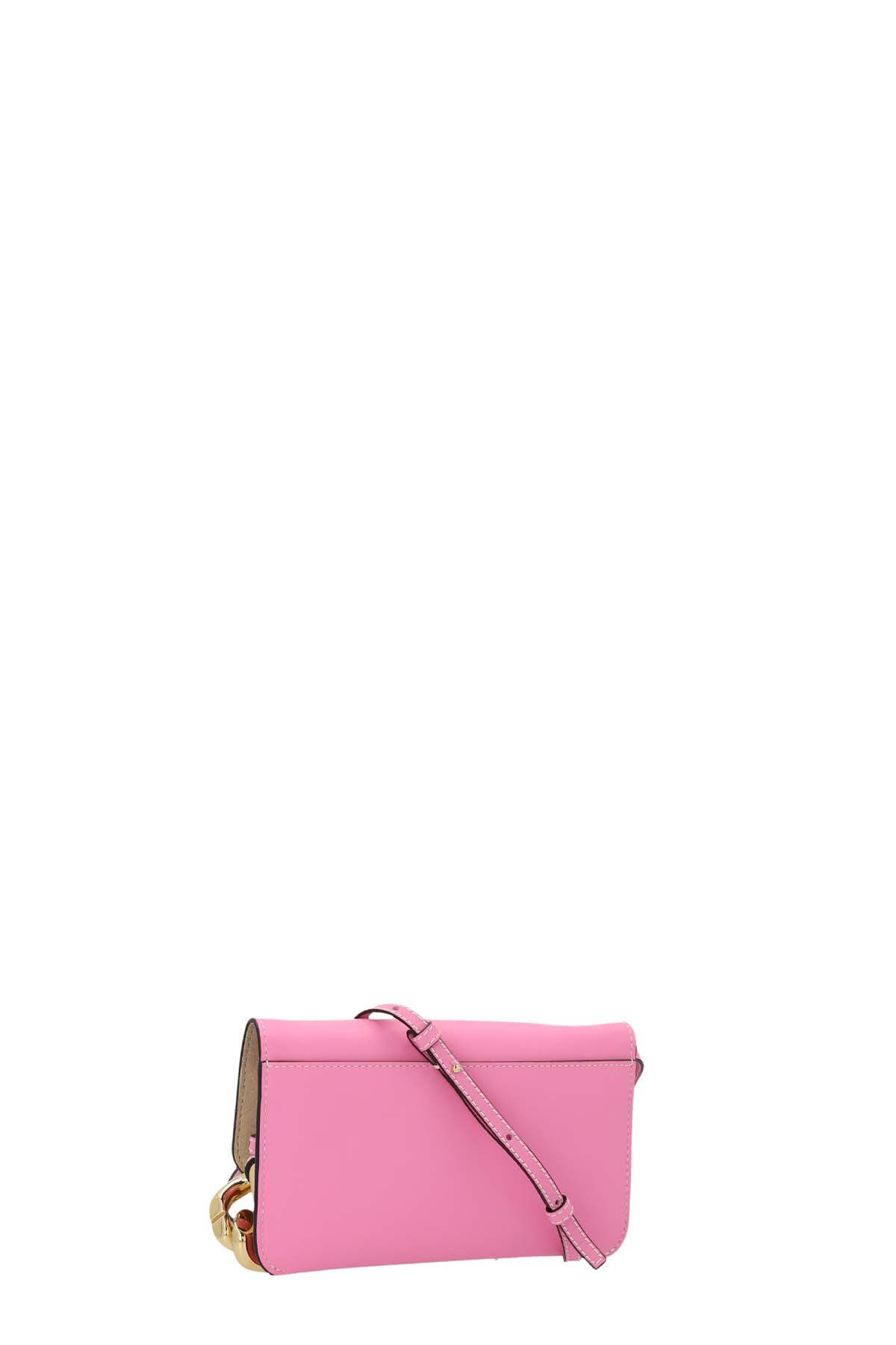 Smartphone holder with adjustable leather shoulder strap, gold chain detail and a magnetic flap closure with embossed logo.