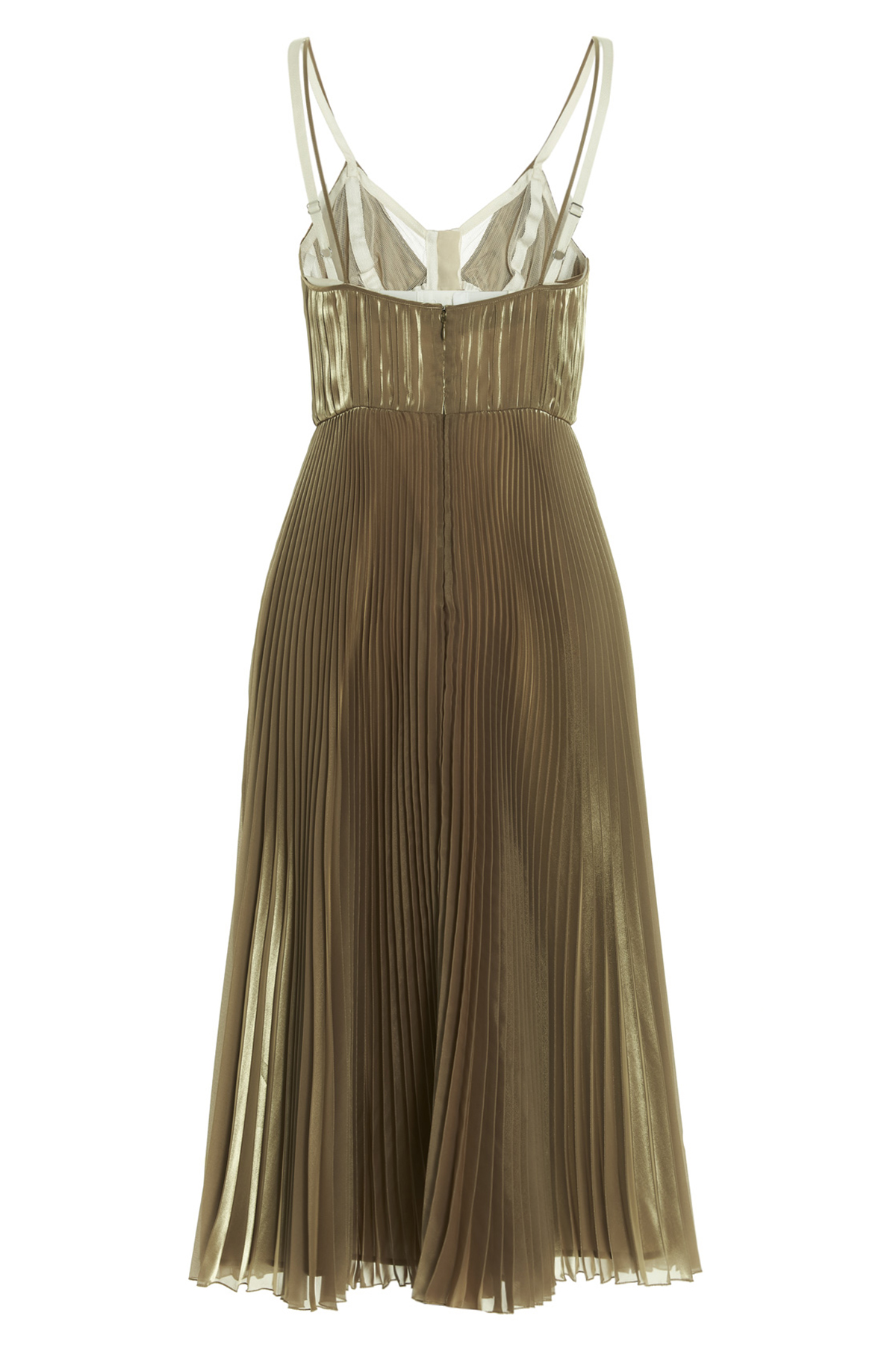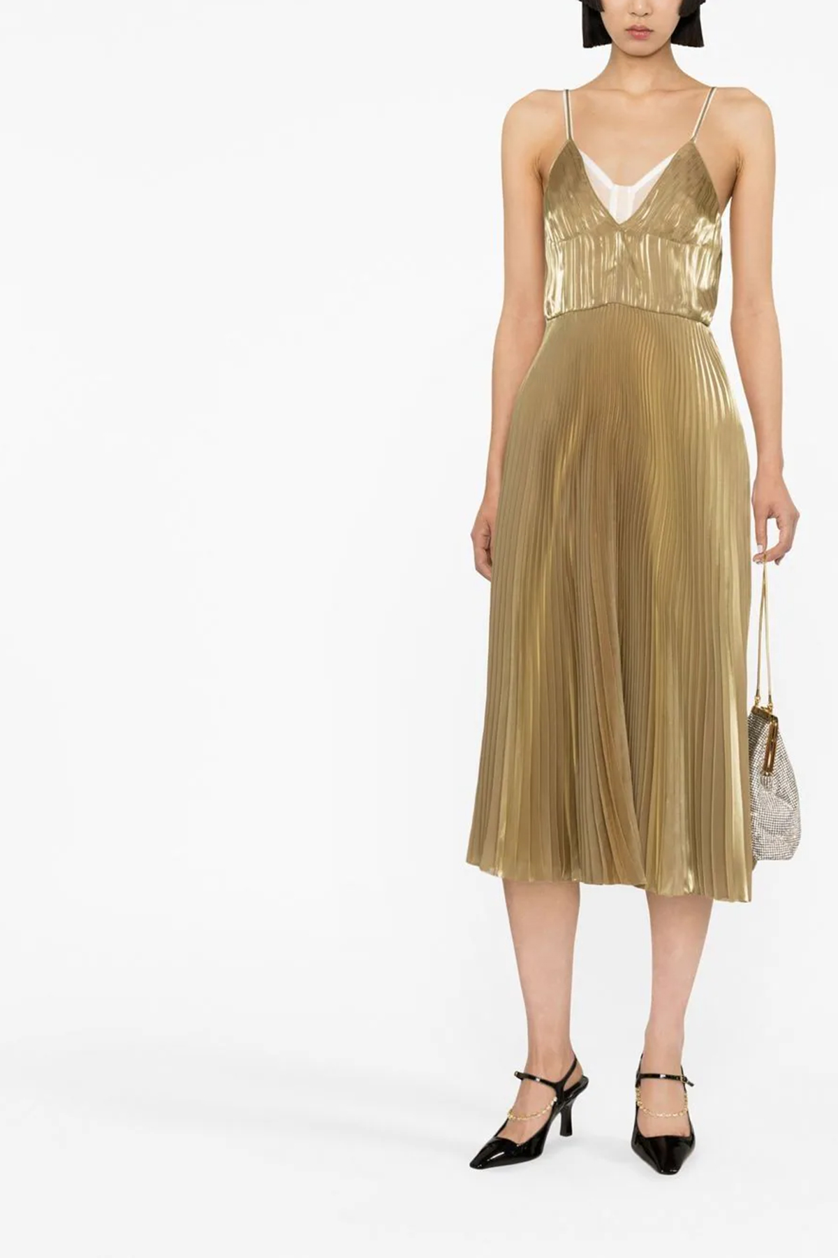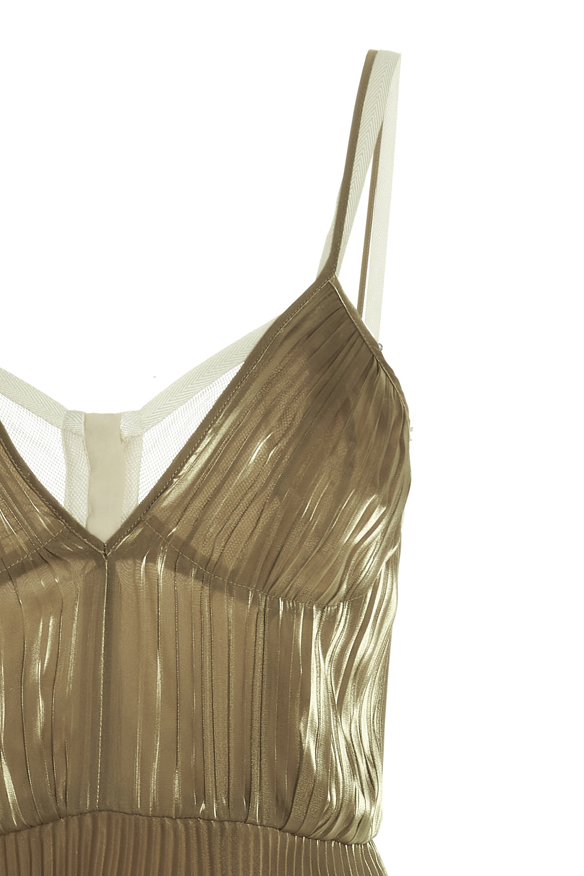 Holographic effect gold fabric pleated voile satin fabric dress, with thin straps, V-neck, cupro and silk lining, visible lace bra detail with adjustable shoulders and a hook closure at the front and back.