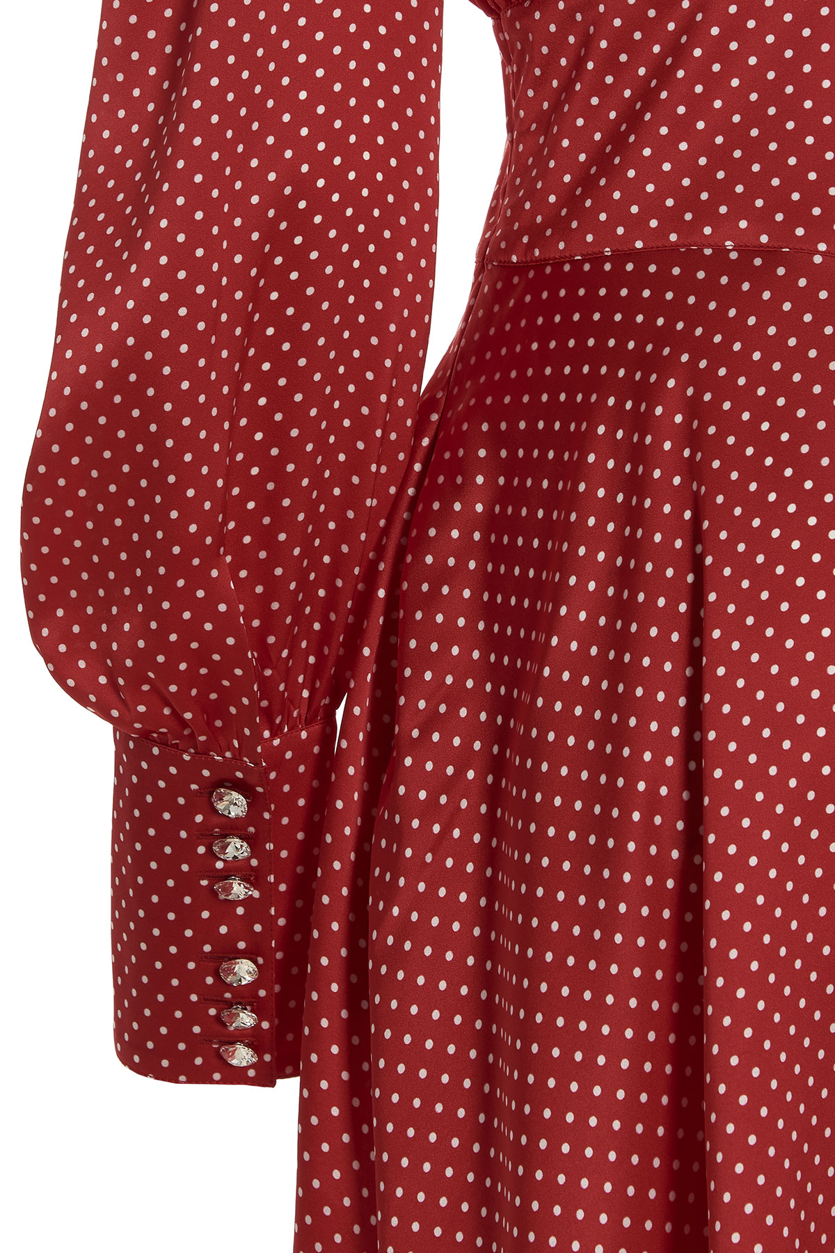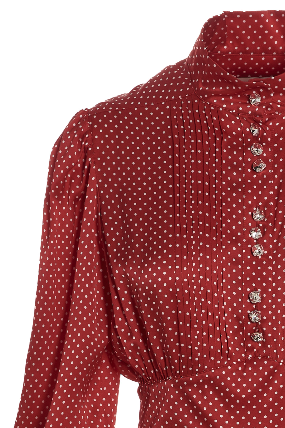 Silk midi dress with polka dot fabric, shirt style with pleated plastron and a jewel button closure.