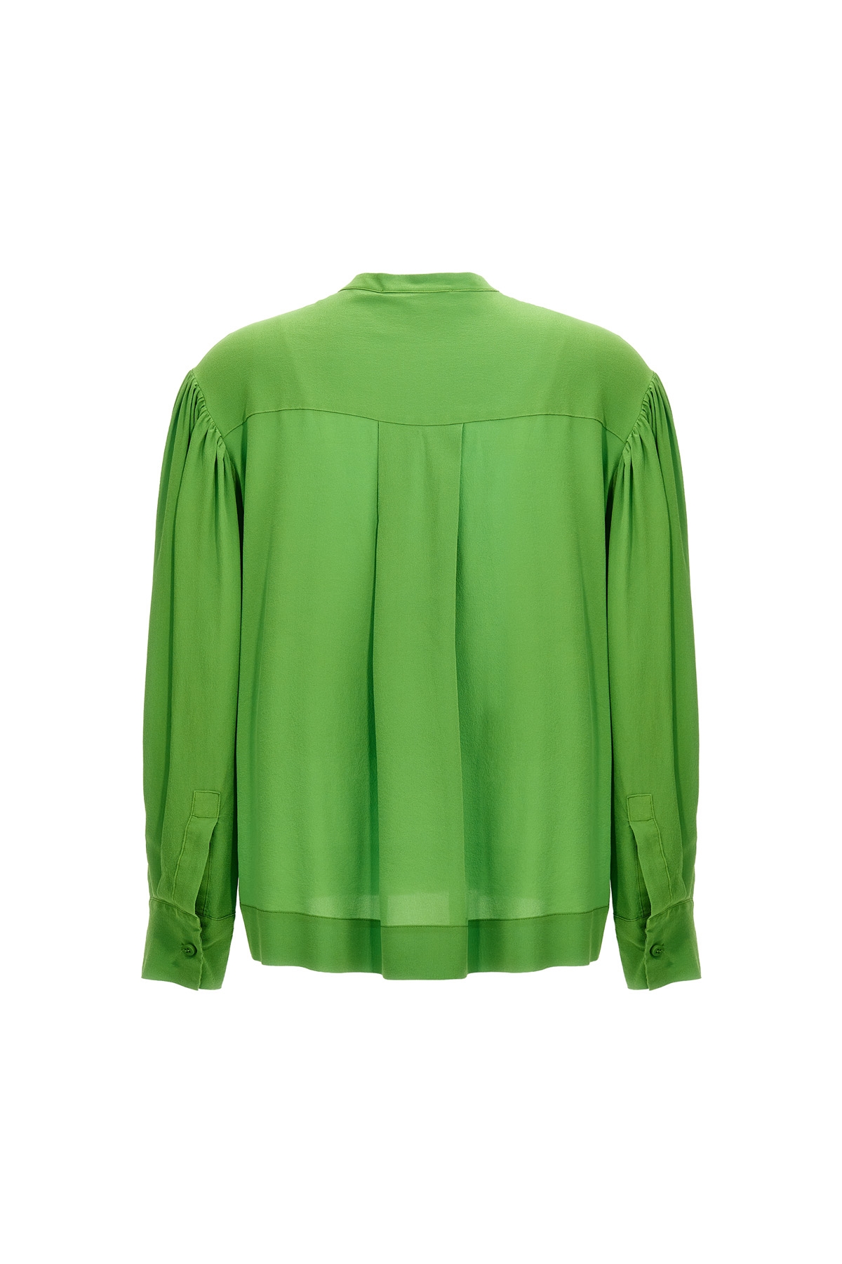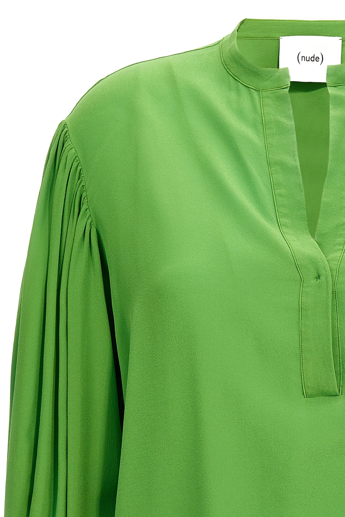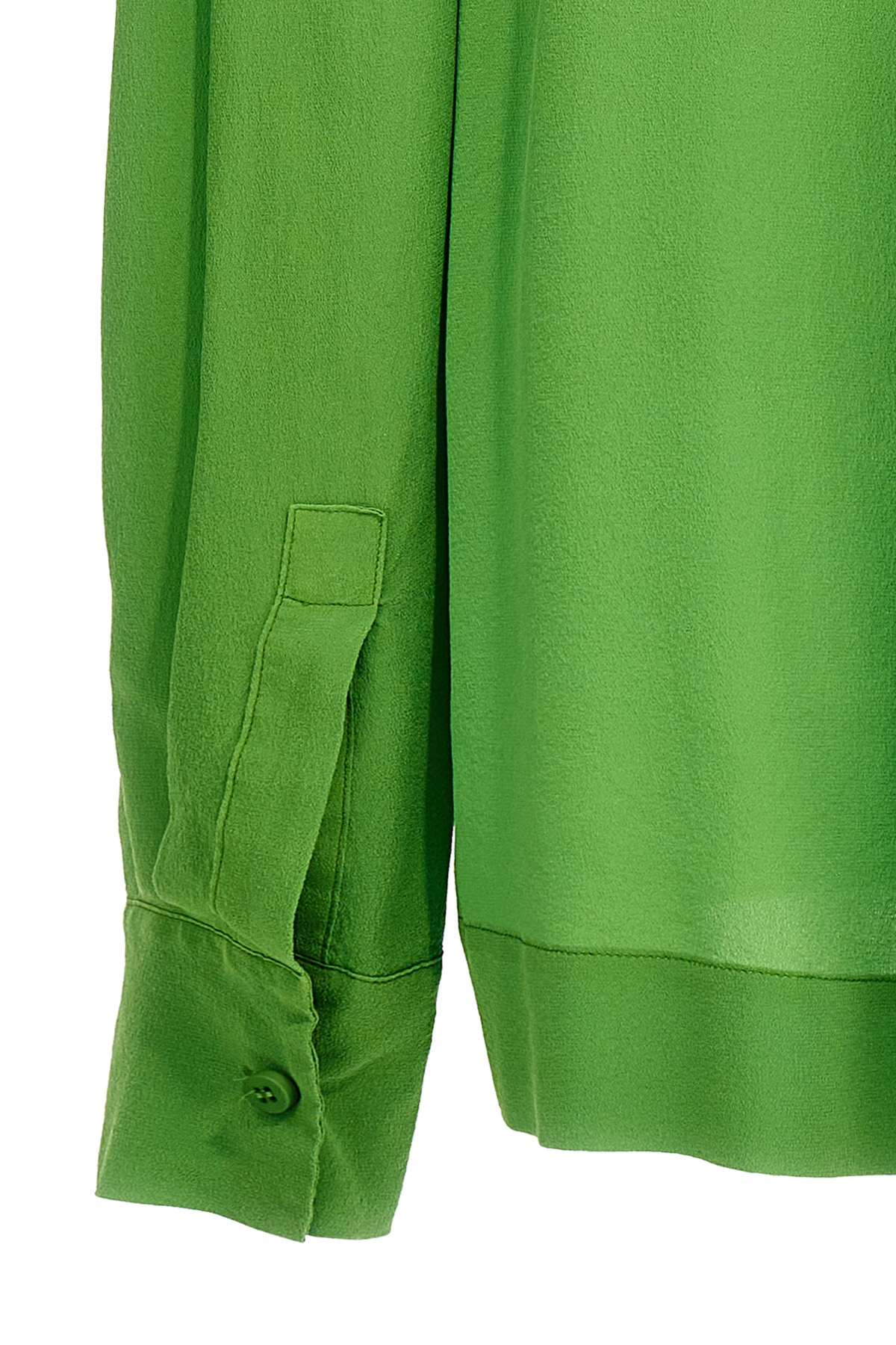 Silk blotter with V-neck and button, front pocket, and long cuffed sleeves
