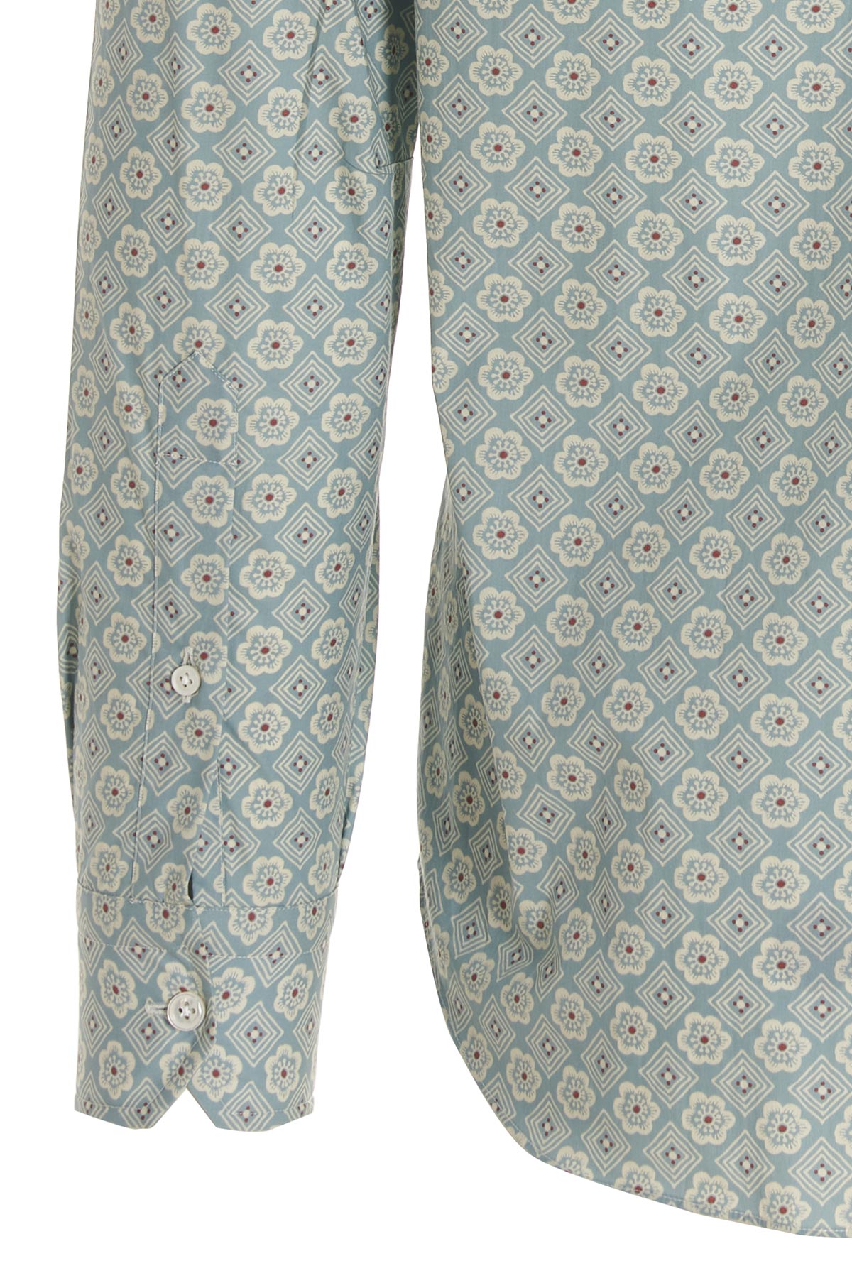Cotton shirt with all-over print, mandarin collar, button closure, long sleeves with cuffs.