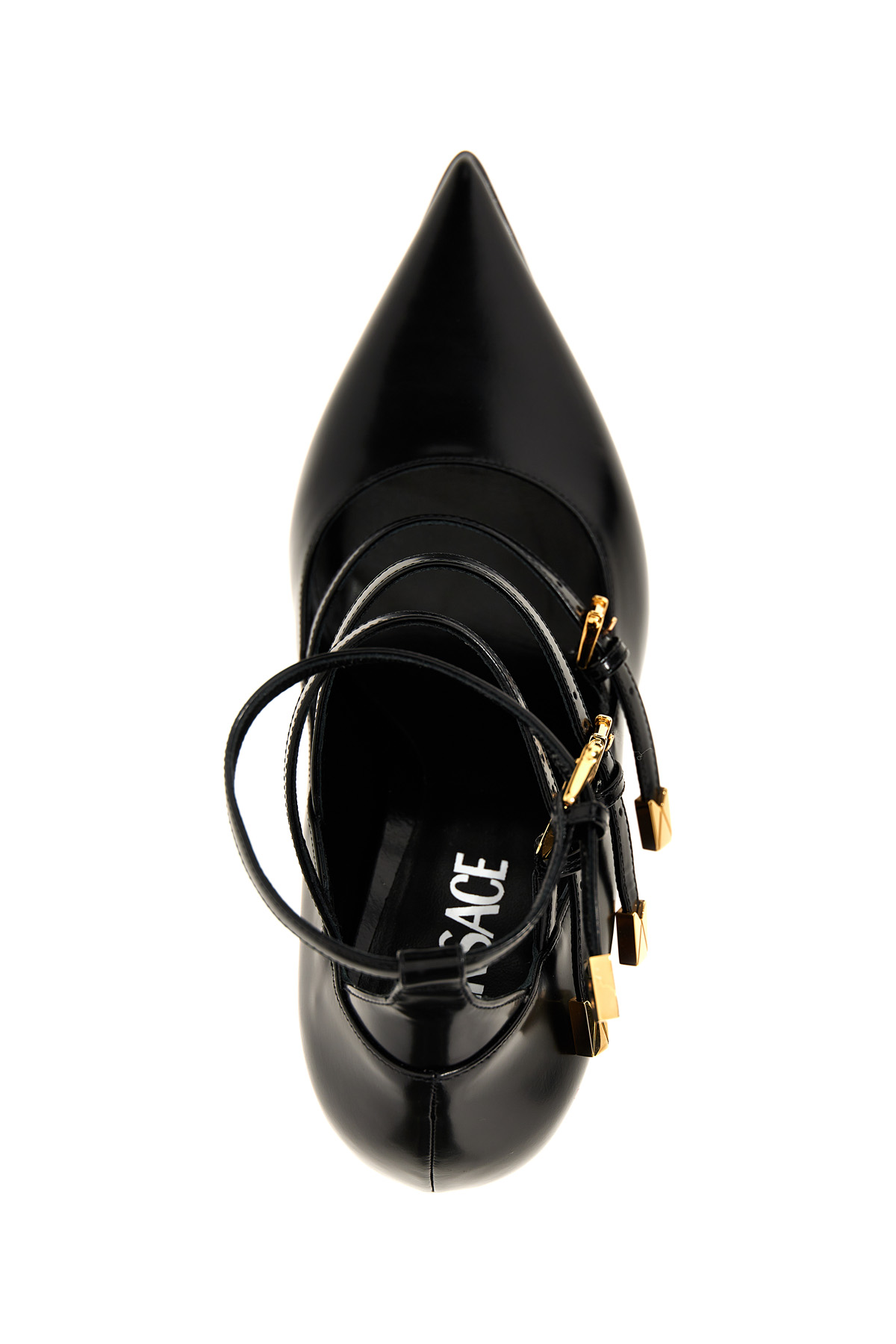 Stormy' leather pointed toe pumps with heel and plateau with notched and wavy edging, V-shaped metal details on the straps with adjustable buckle.