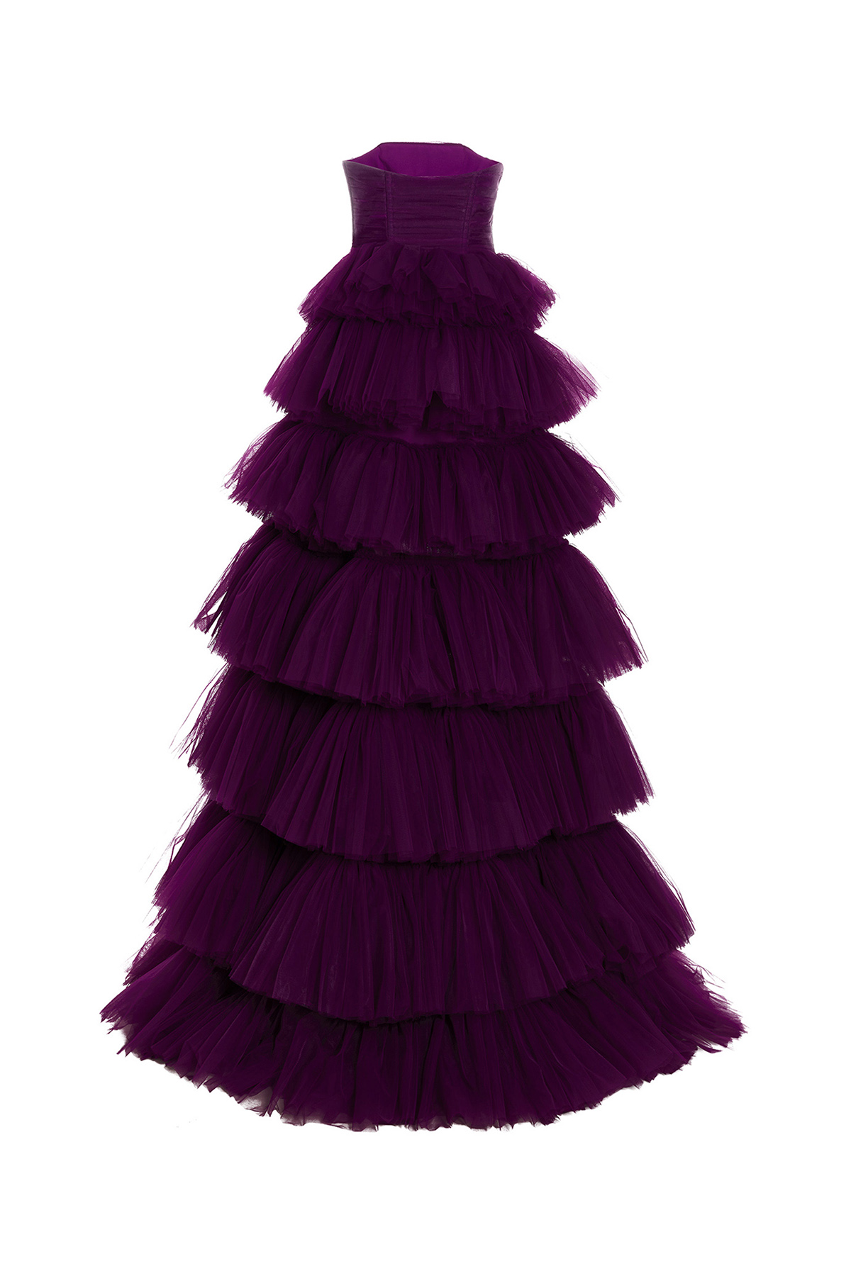 Flounced tulle maxi dress with strapless style, bodice and an unseen zip closure.