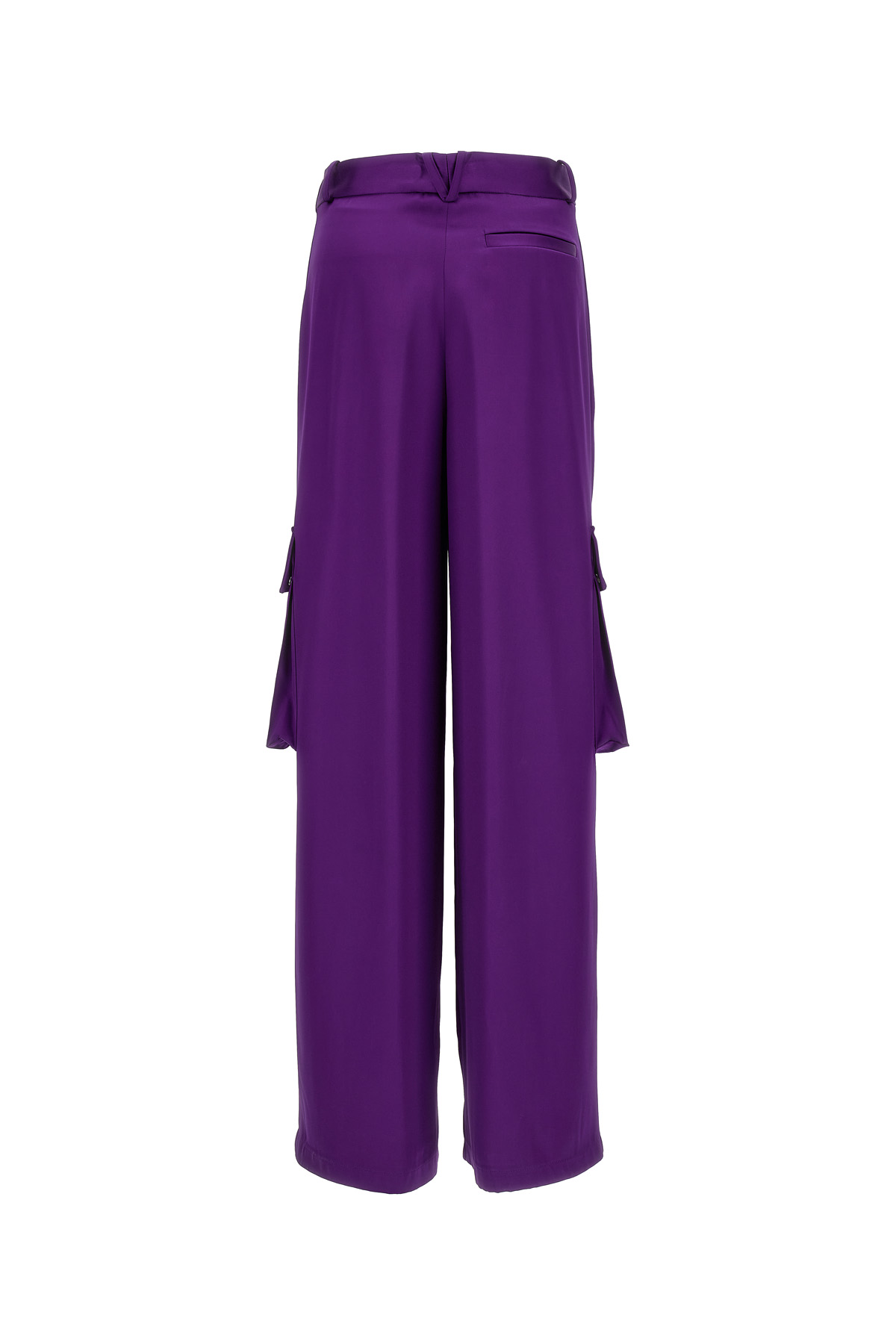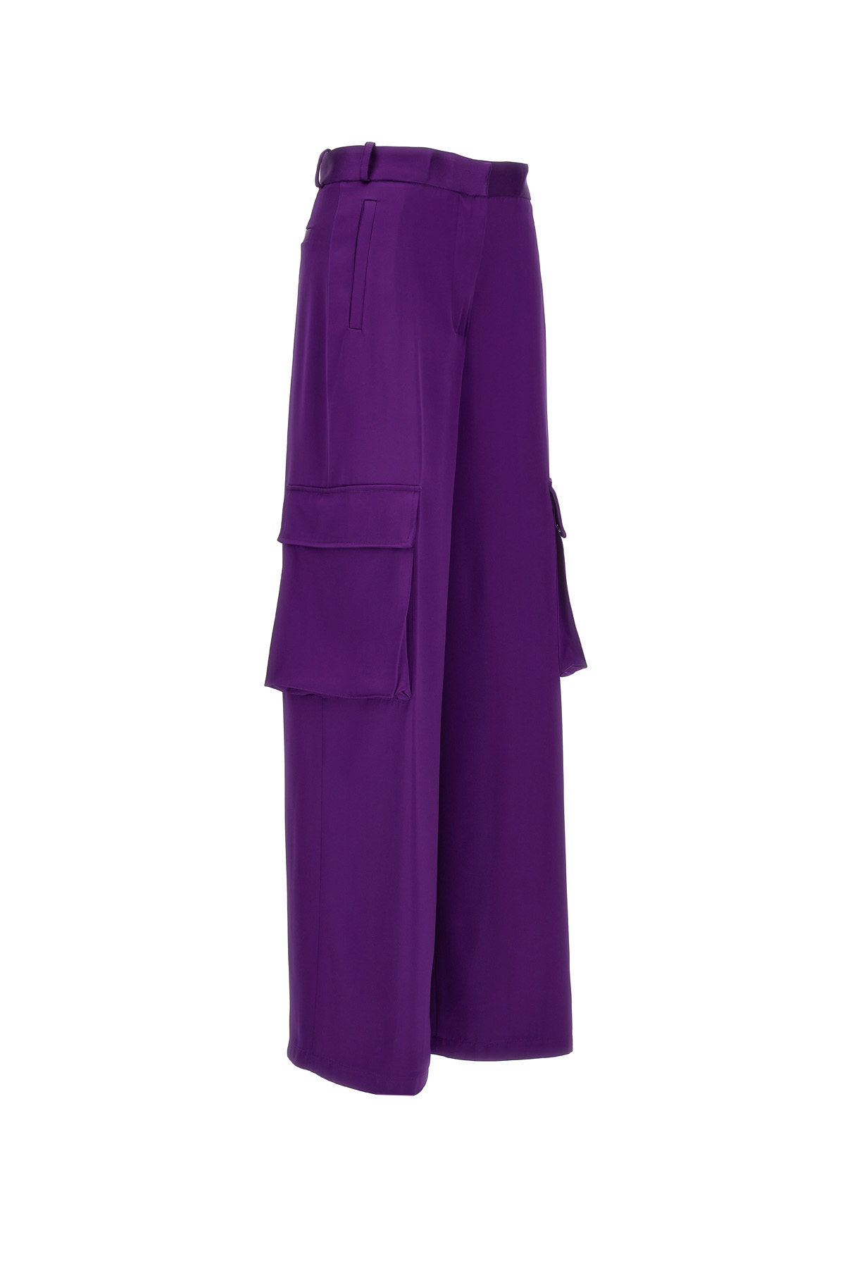 Satin cargo pants with loose leg, multi pockets, a zip, hook-and-eye and button closure.