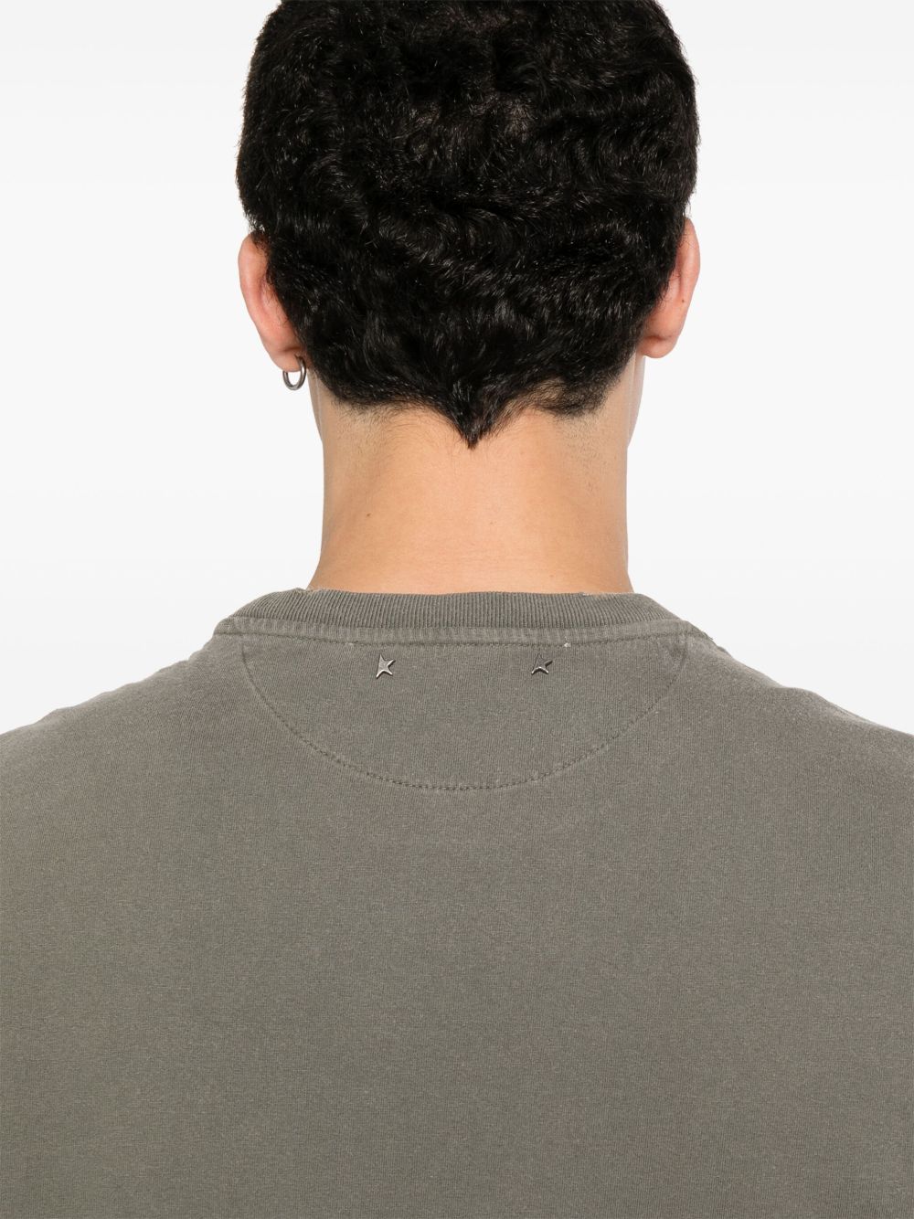 dust olive green cotton jersey texture distressed effect ribbed crew neck short sleeves logo print to the front logo plaque to the rear straight hem