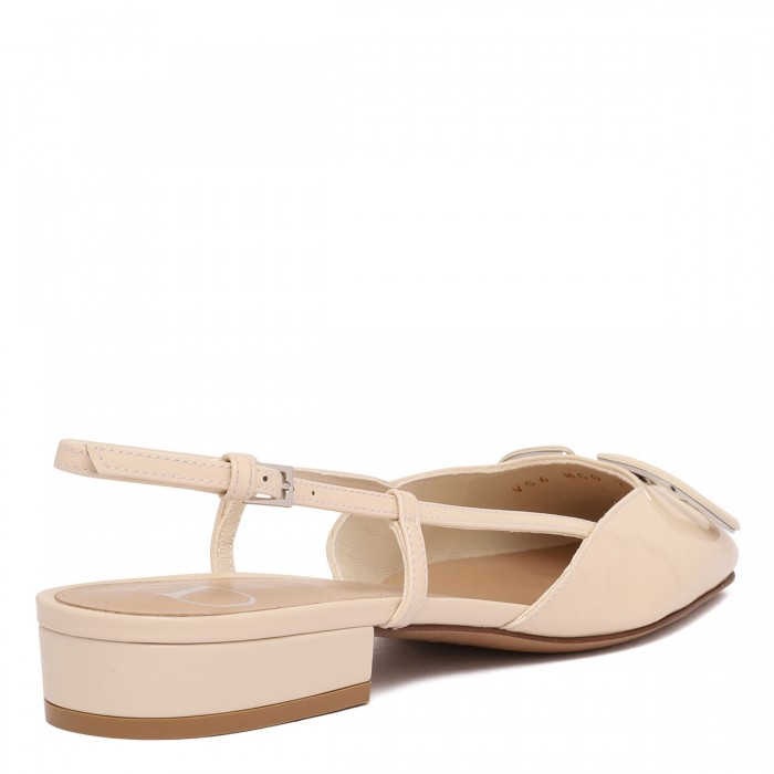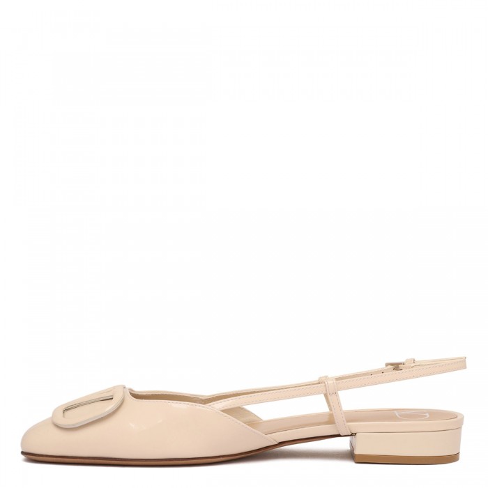 Light ivory patent leather ballerinas from Valentino Garavani featuring VLogo signature on toe, slingback strap with buckle closure, squared toe, low heel, leather insole and sole.