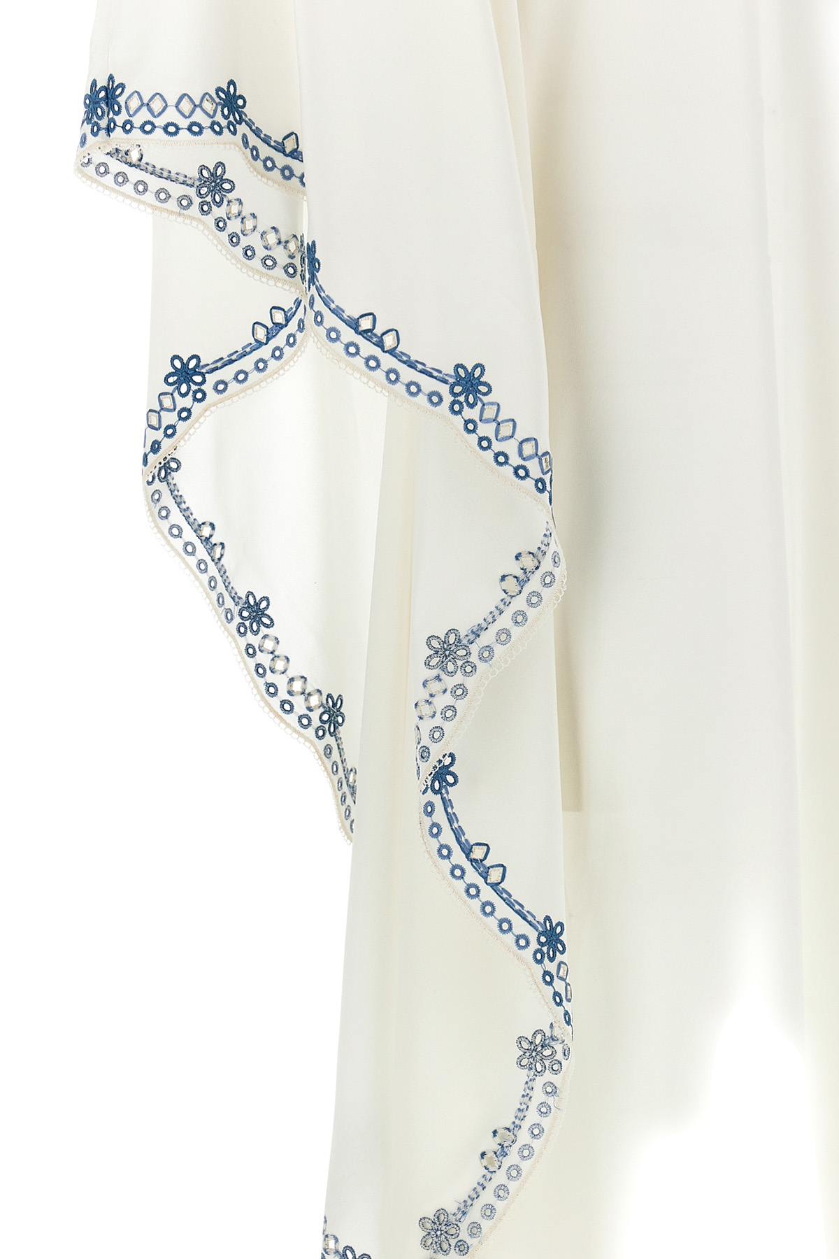 Long pure silk crepe de chine kaftan with 7/8 wide sleeves, embroidery with trimmings, V-neck with button closure.