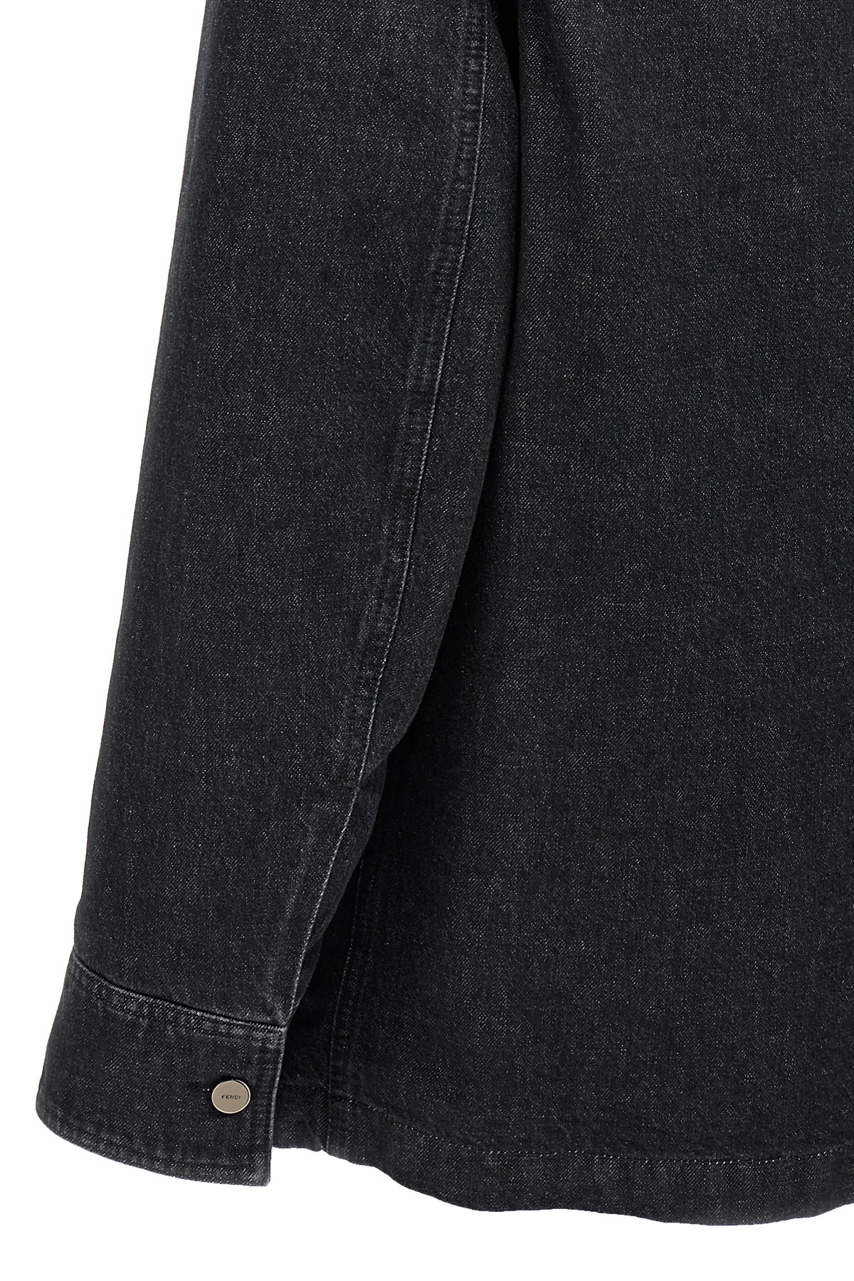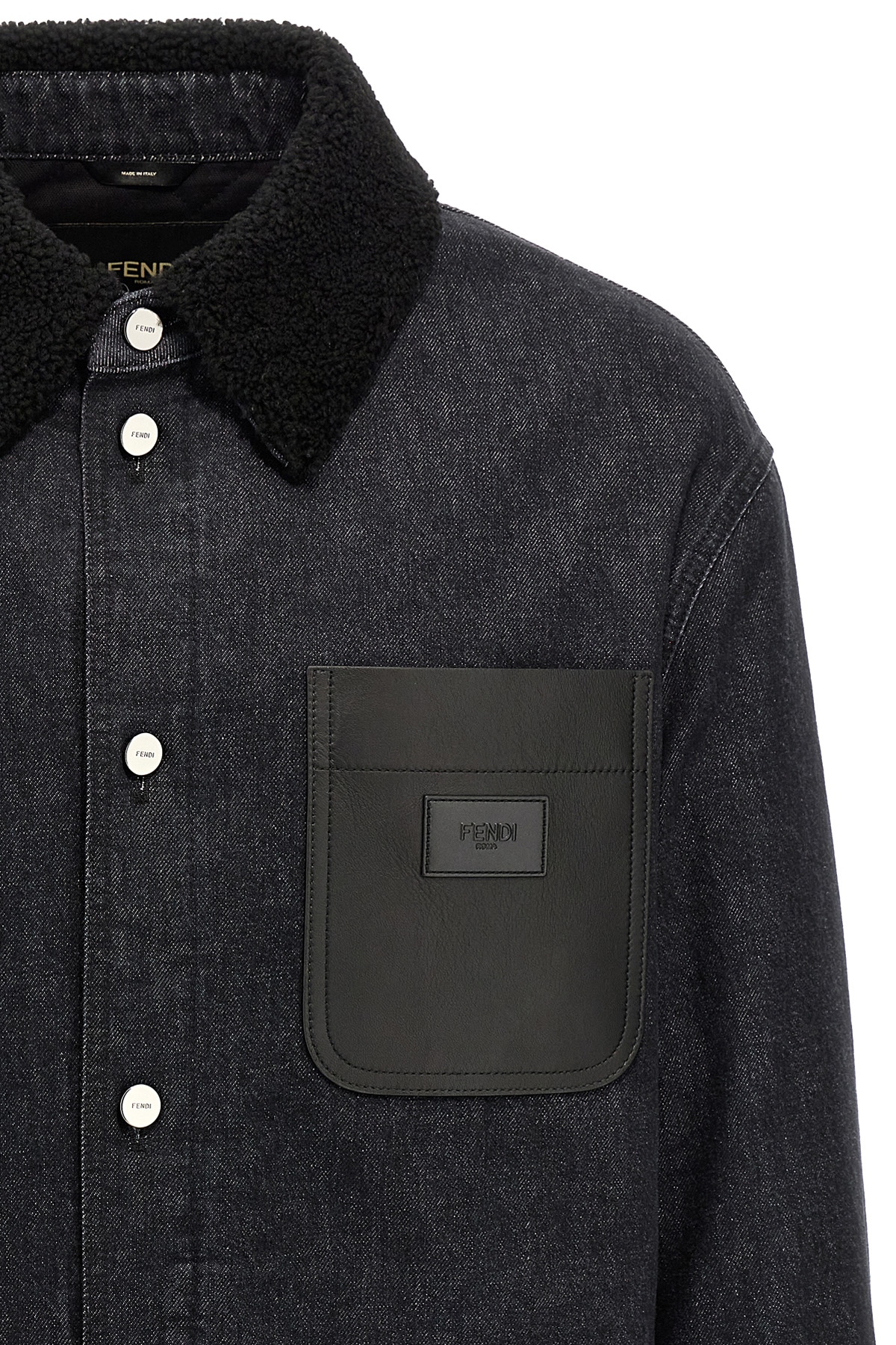 Lightly padded cotton denim jacket with tone-on-tone sheepskin collar, leather pocket with logo patch, button closure, pockets, long cuffed sleeves.