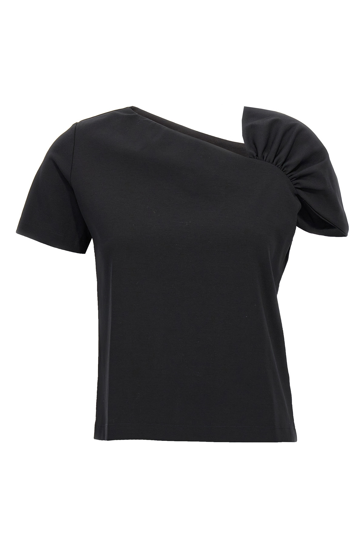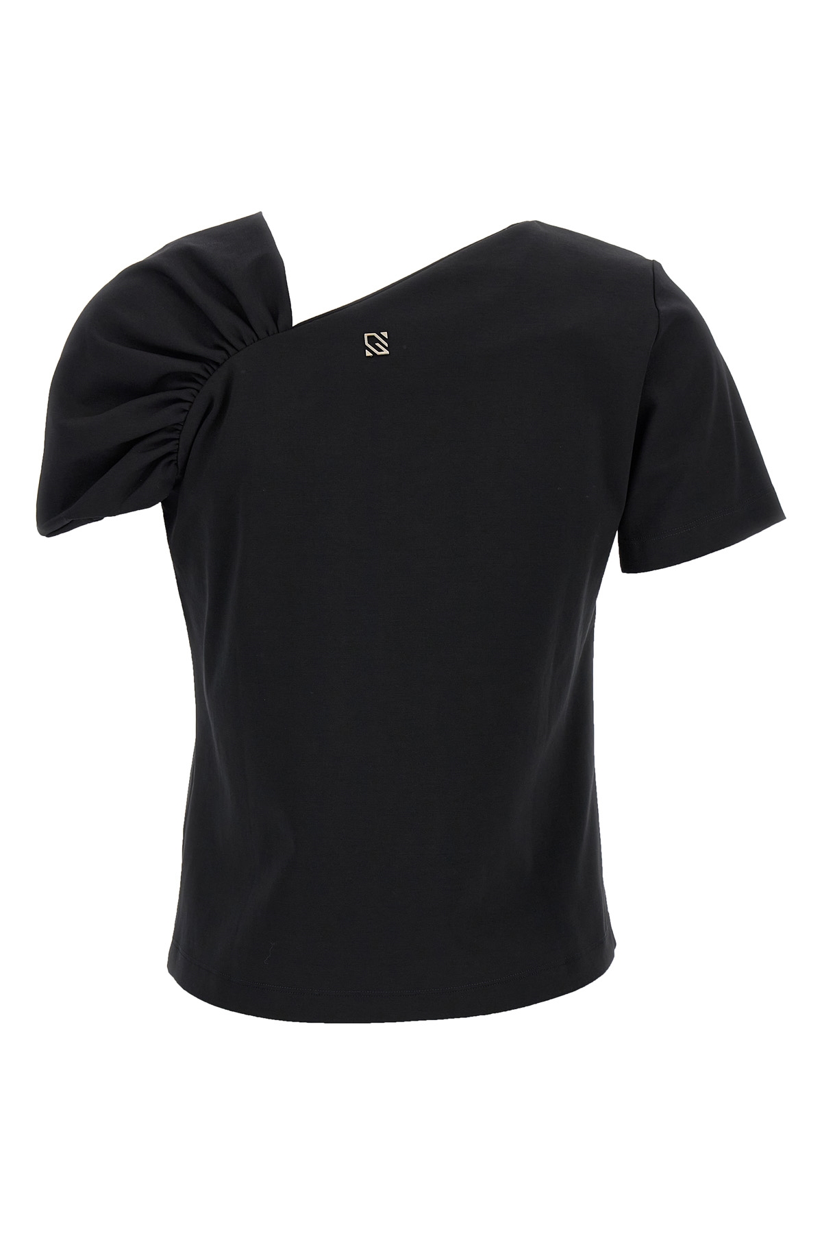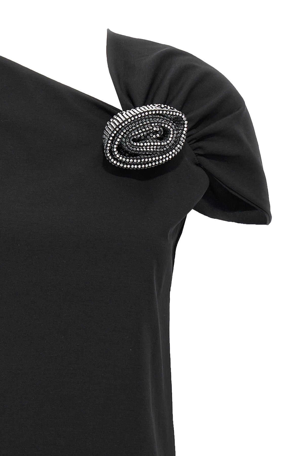 Cotton blend top with floral brooch with rhinestones on the front, asymmetric V-neck, and short sleeves.
