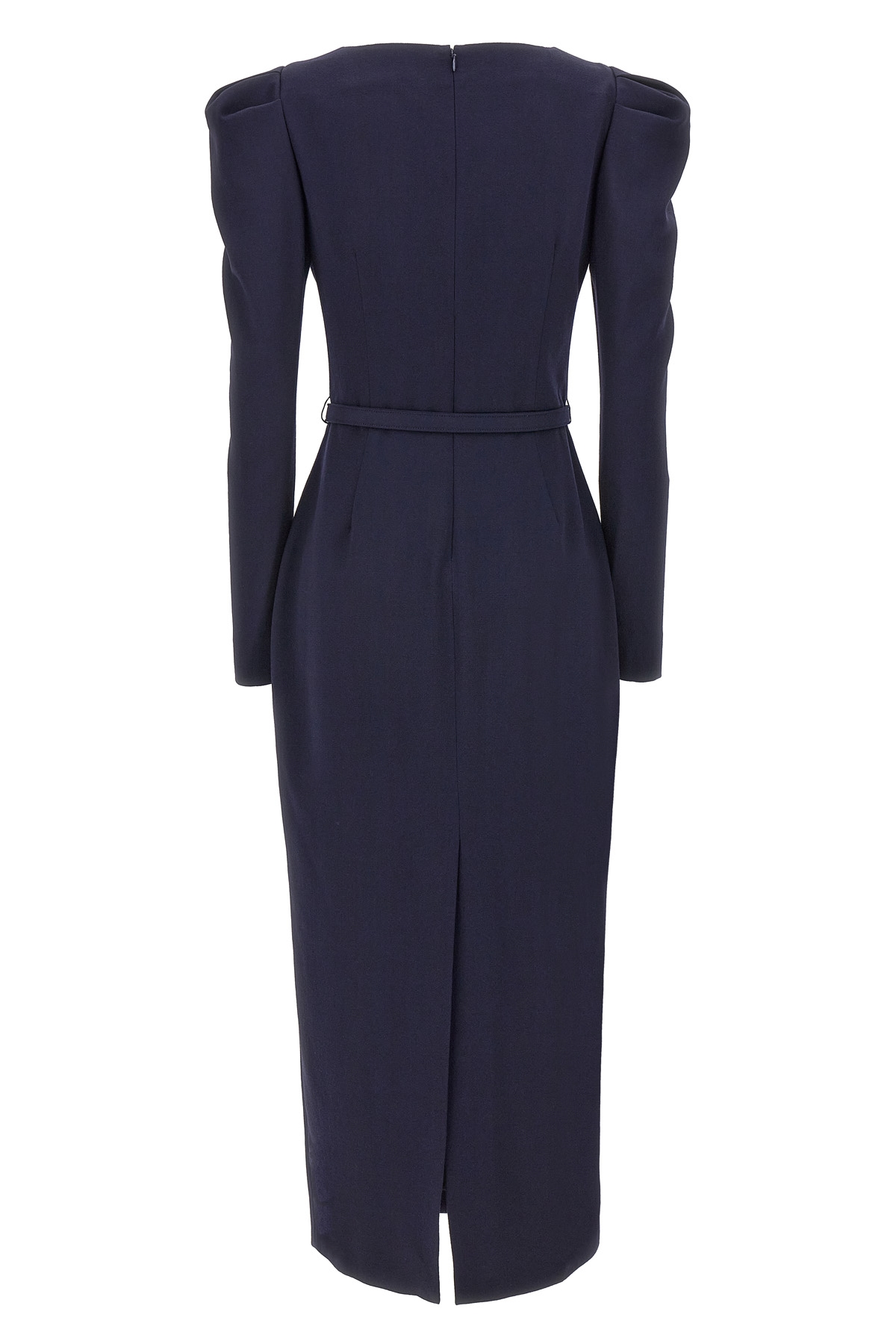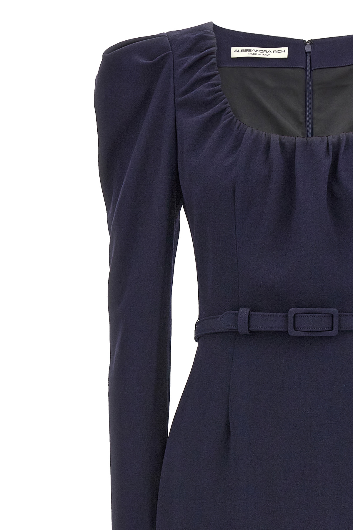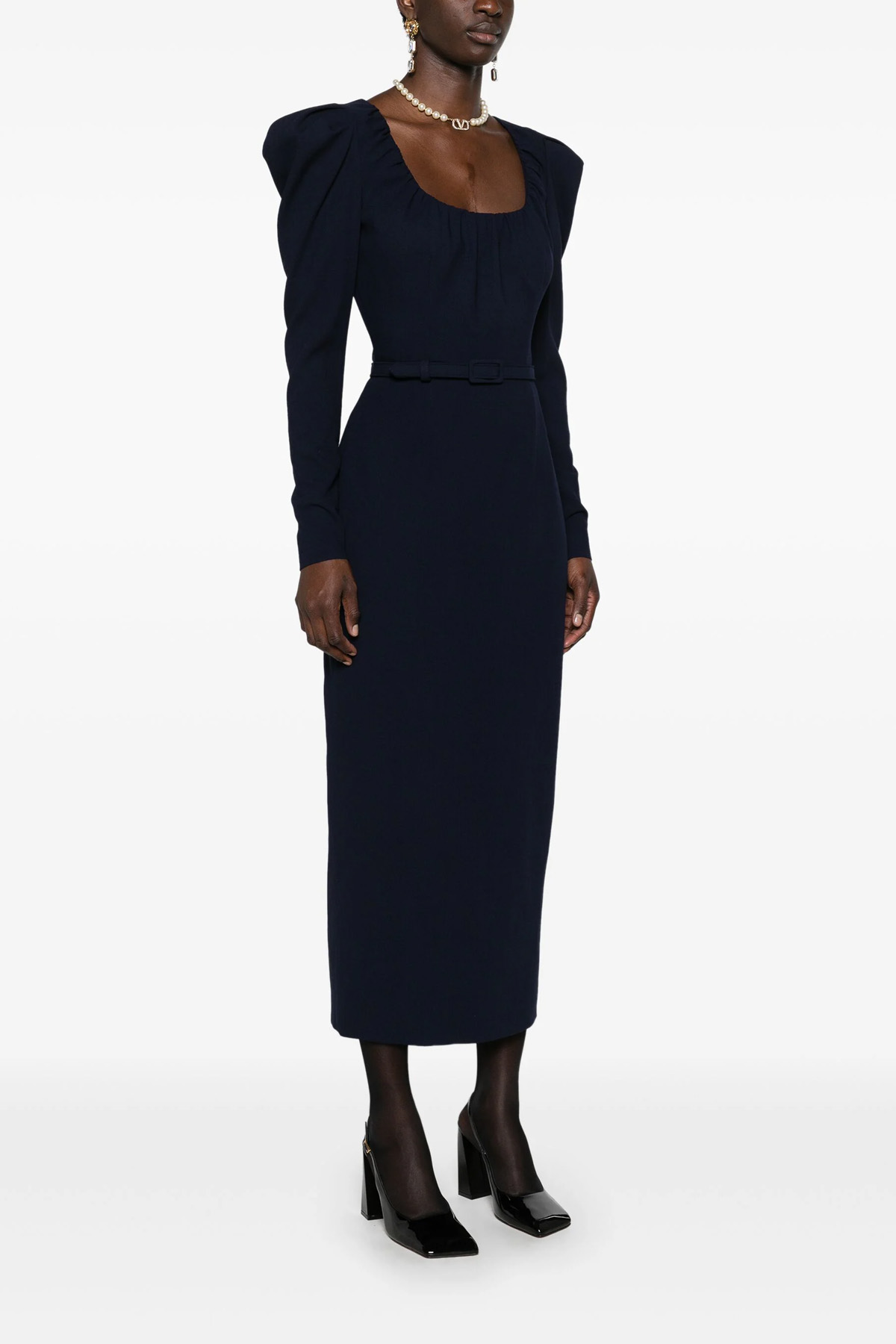 Crepe dress with matching belt at the waist, crew neck, padded shoulder and puff sleeves, long sleeves, back zip closure, back split.