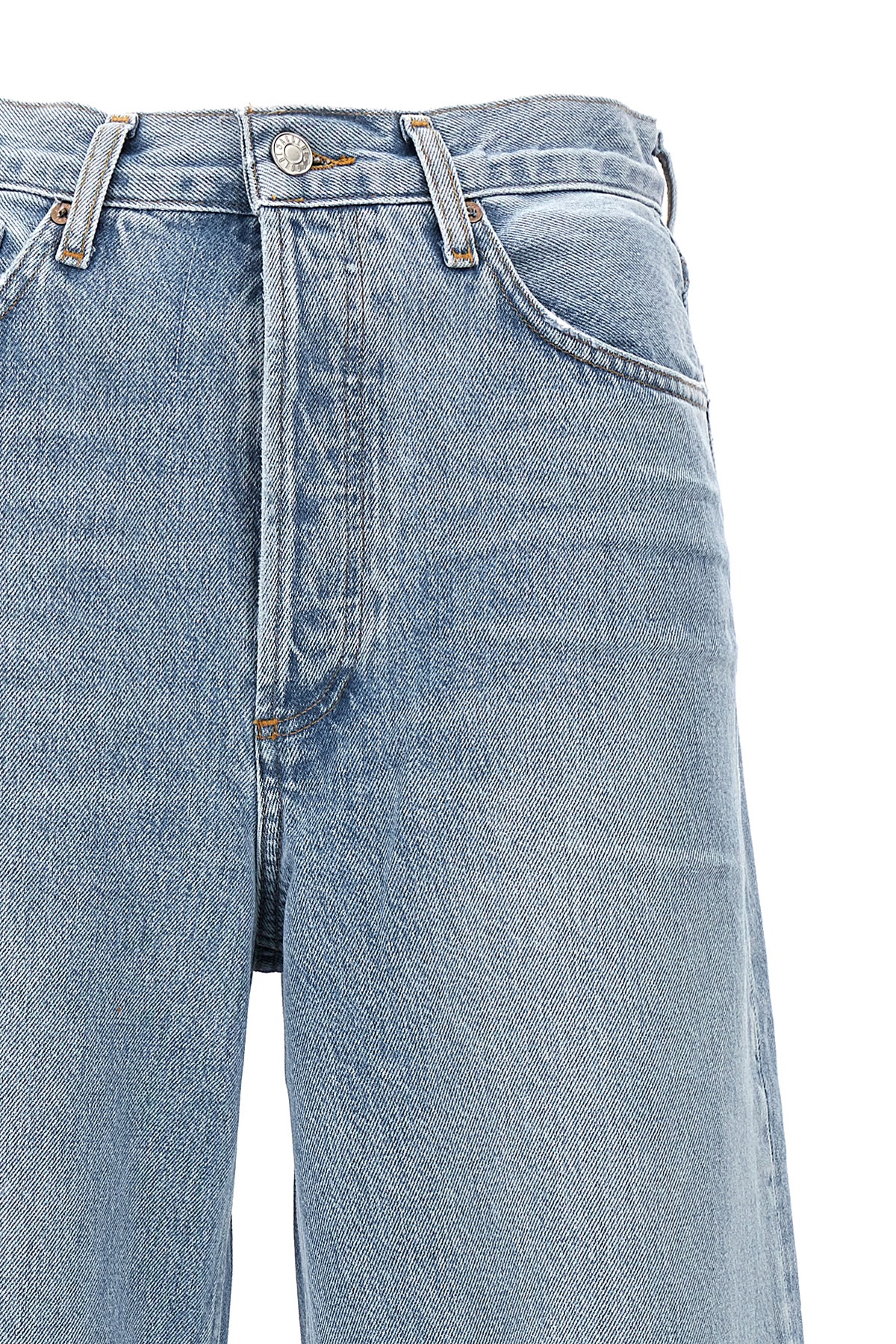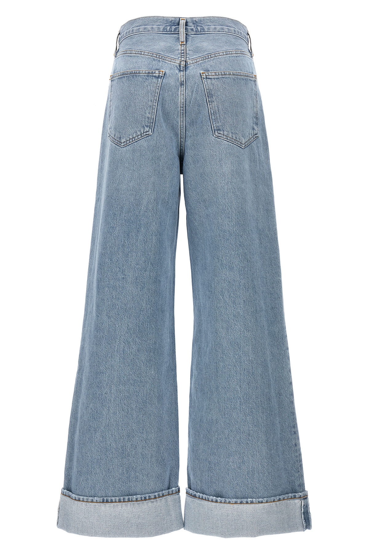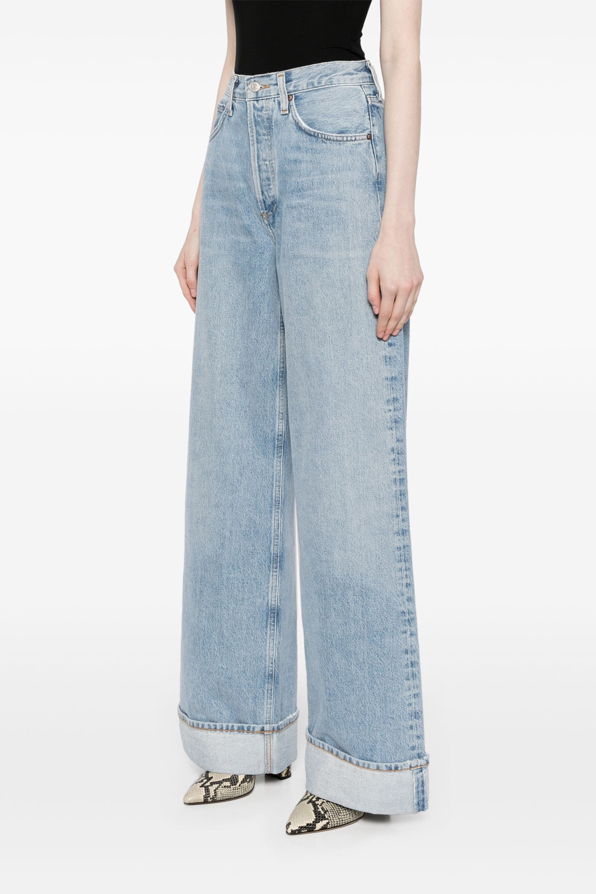 'Dame' cotton denim jeans with button closure, five pockets, high waist style with wide leg and turned-up hem.