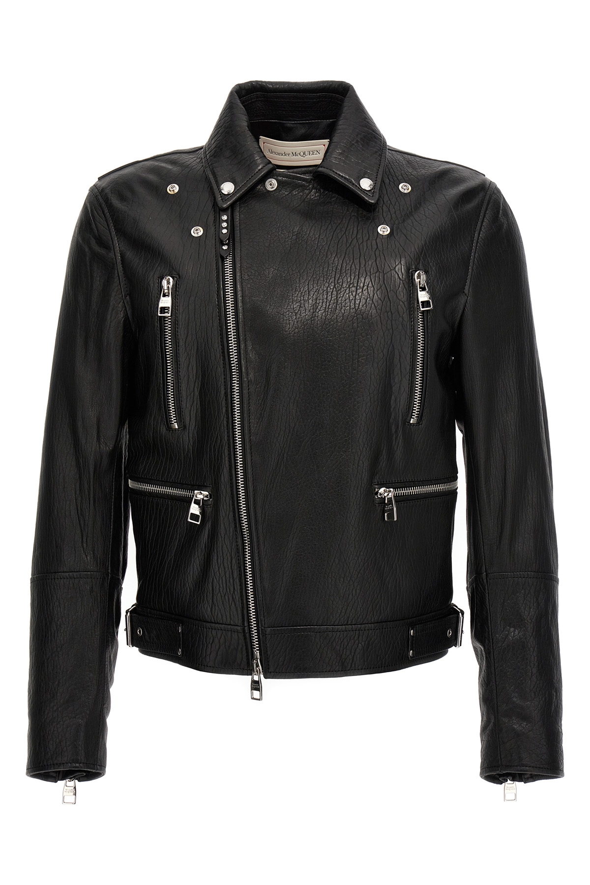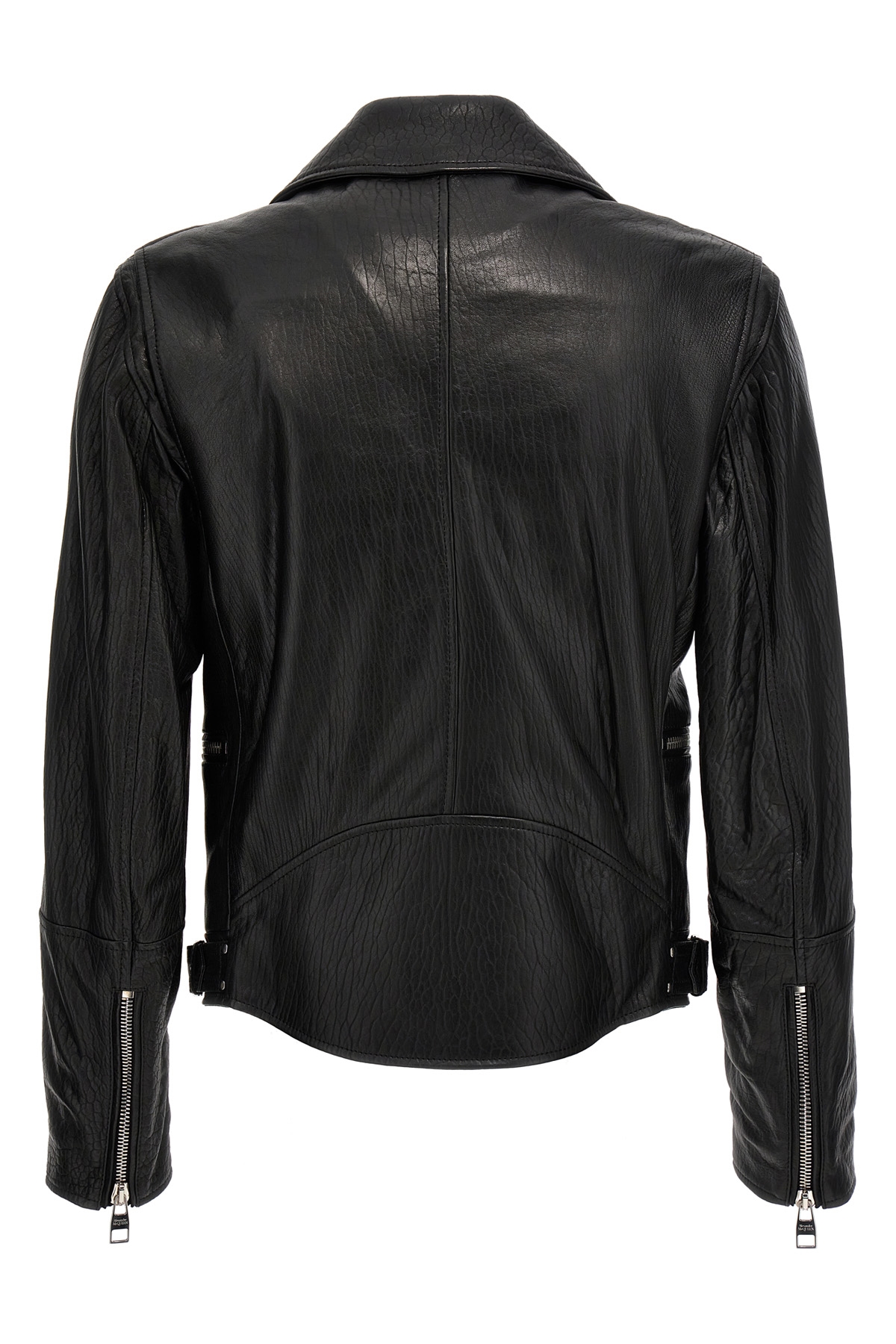 Leather jacket with texture, zip closure, pockets and long sleeves.