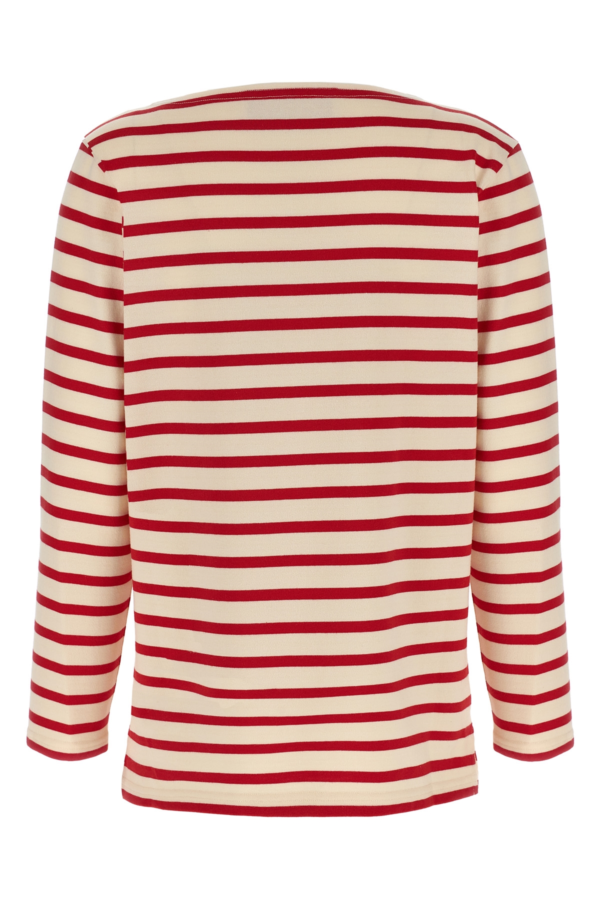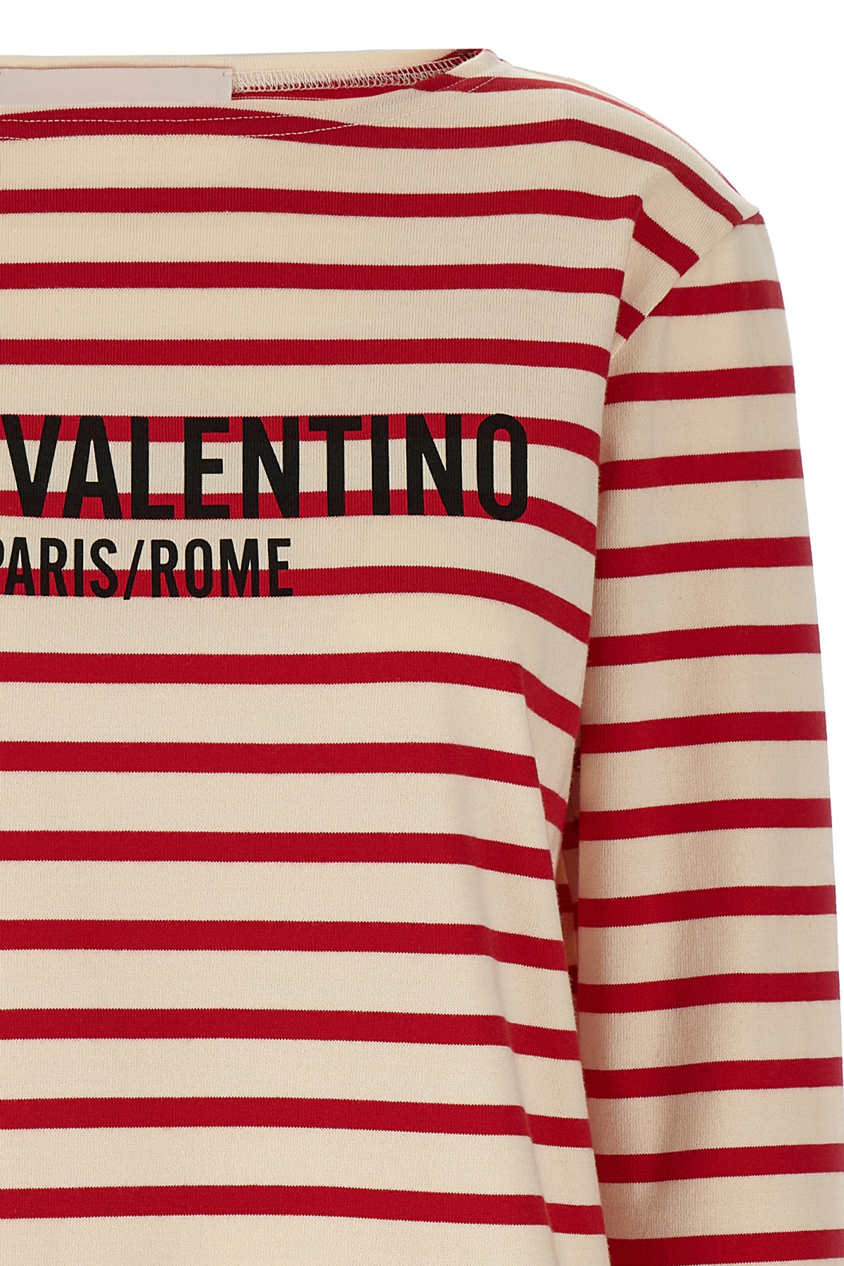 Striped cotton jersey T-shirt with front 'Chez Valentino' print, boat neck, long sleeves with slightly dropped shoulders, side splits.