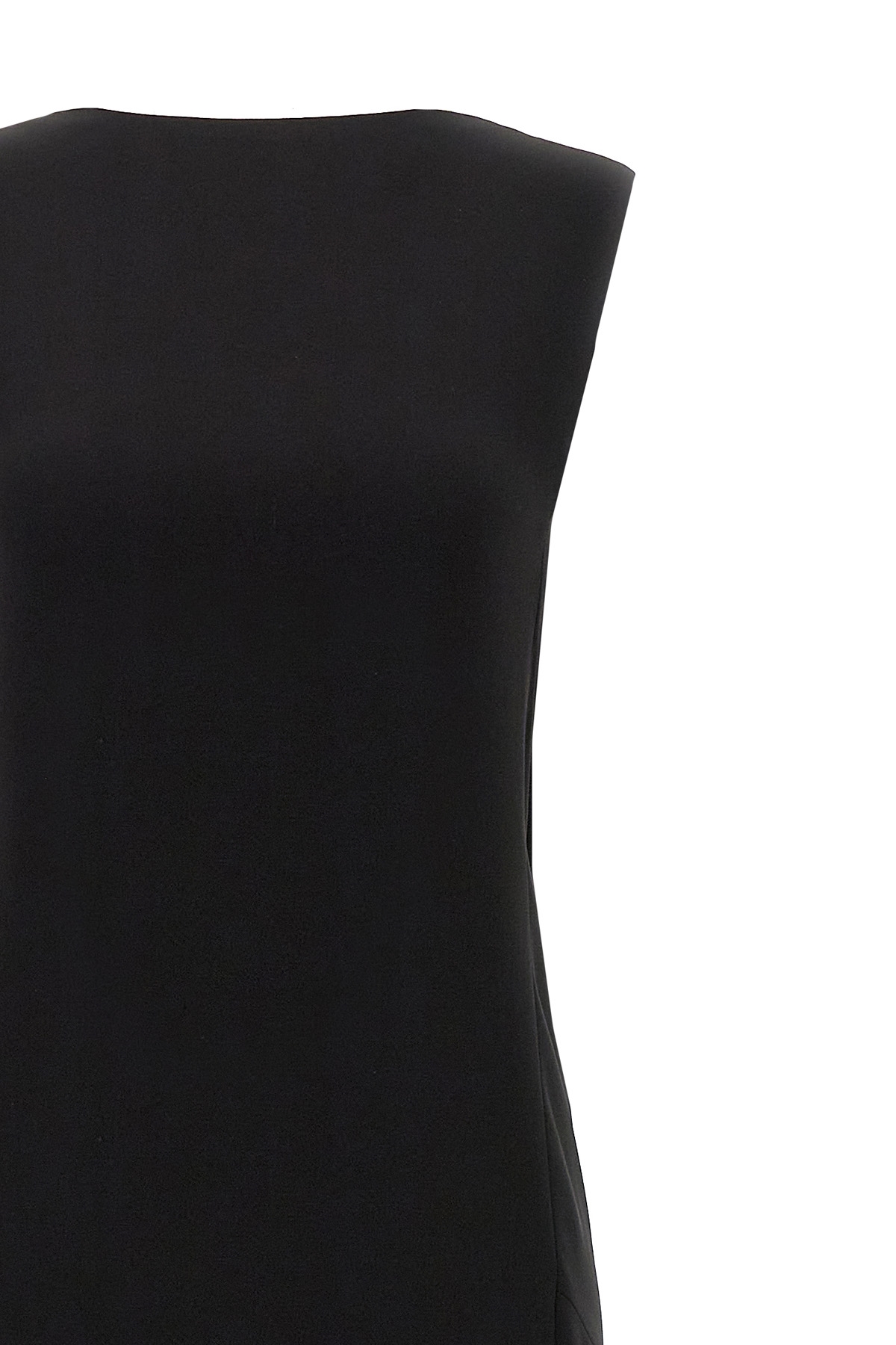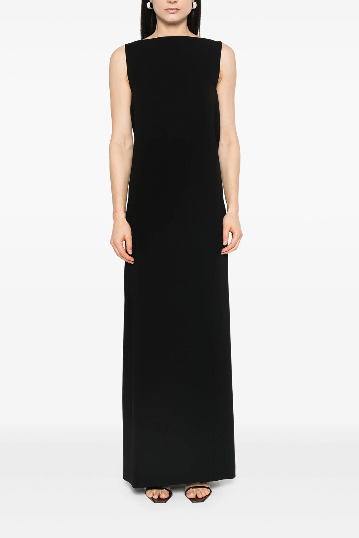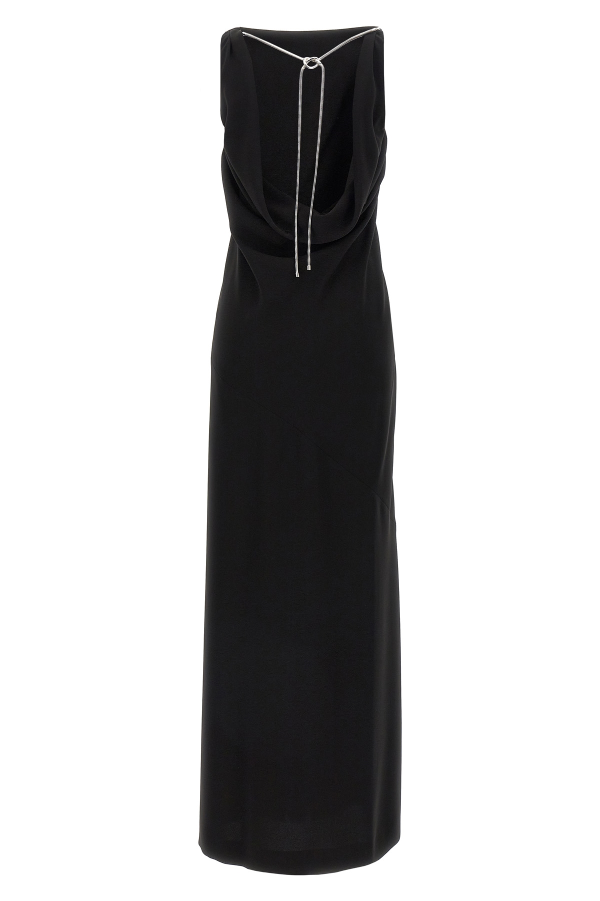 Long 'Creso' dress in light cagoule cady, deep draped cagoule effect neckline with jewel chain detail at the back, boat neck, sleeveless, and side front split.
