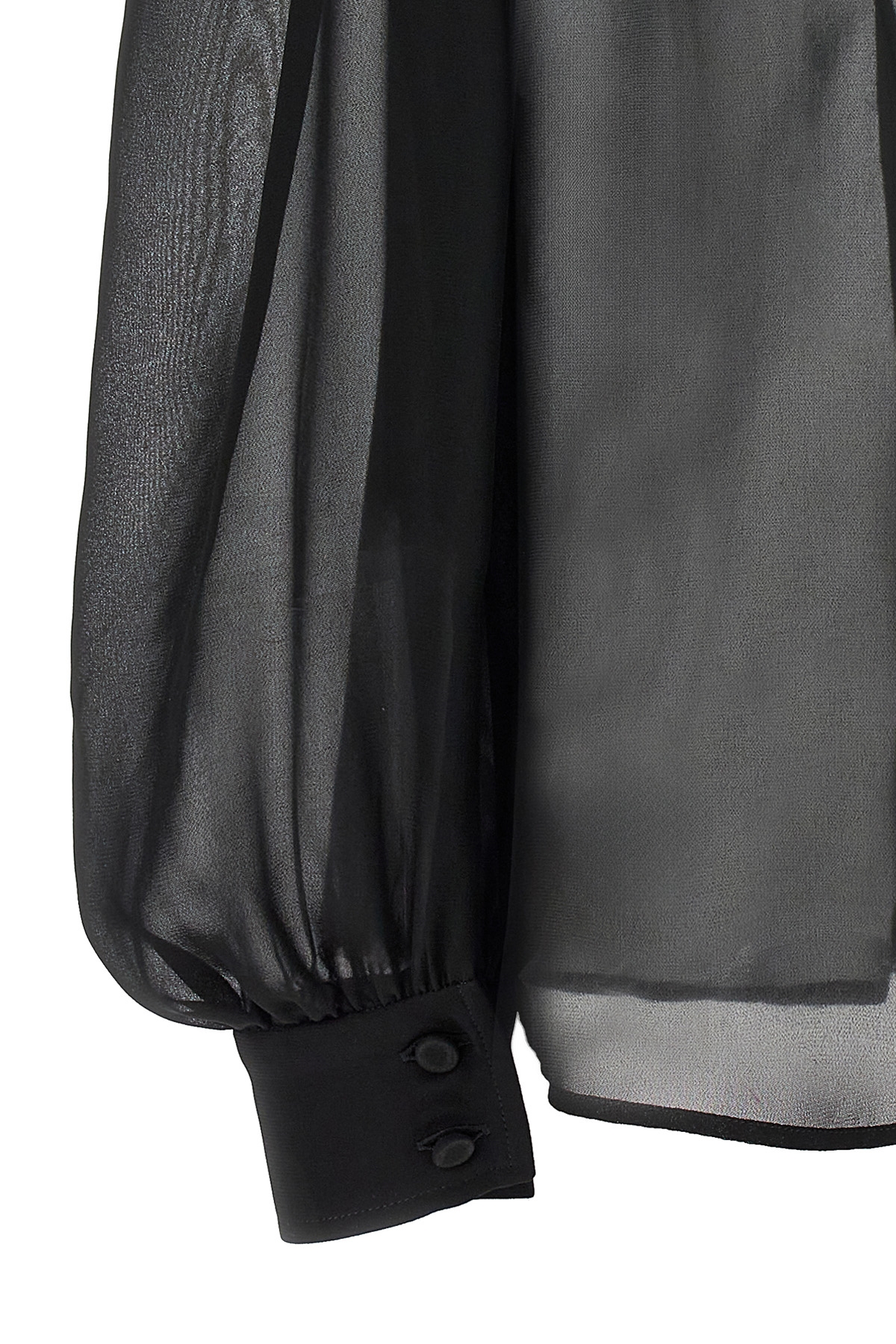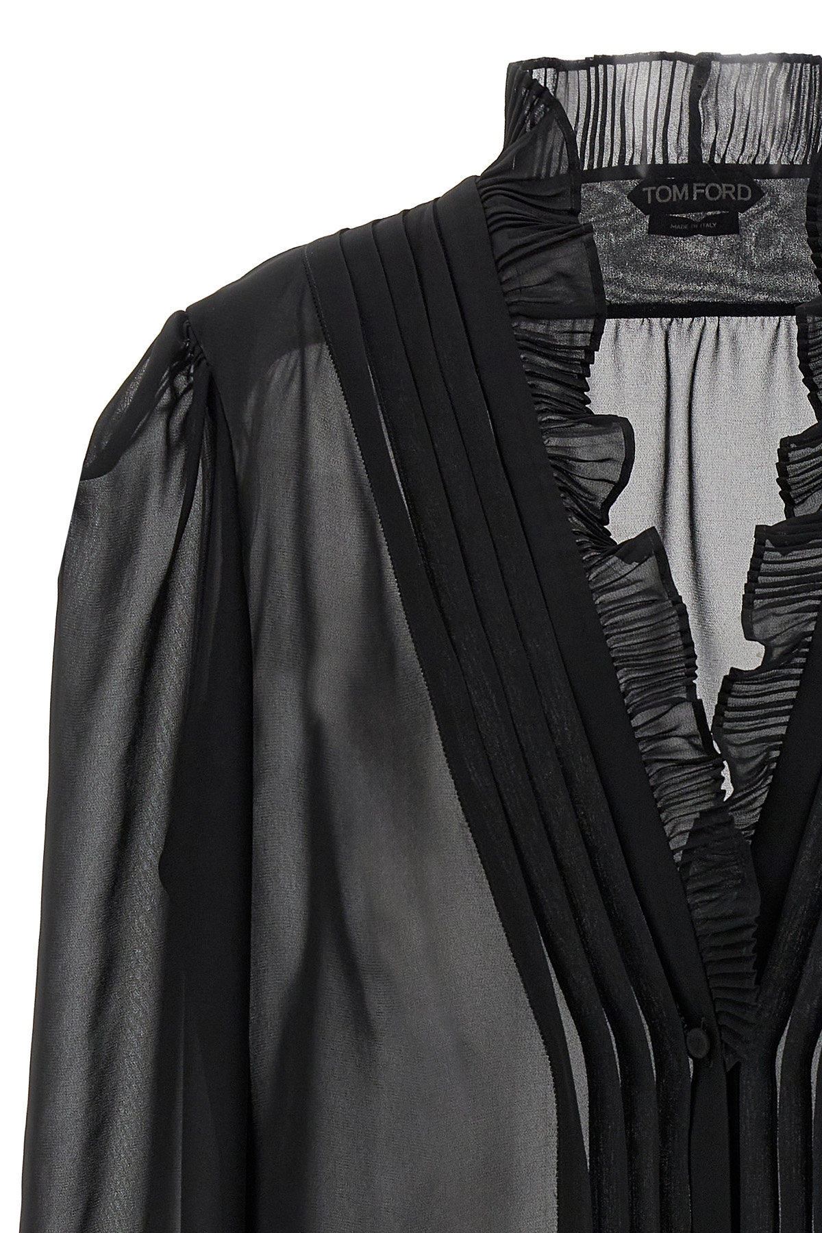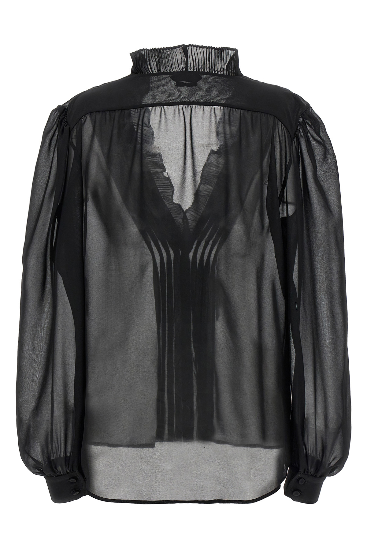 Semi-transparent georgette shirt, V-neck with ruffled piping, front button closure with pleats, long cuffed sleeves.