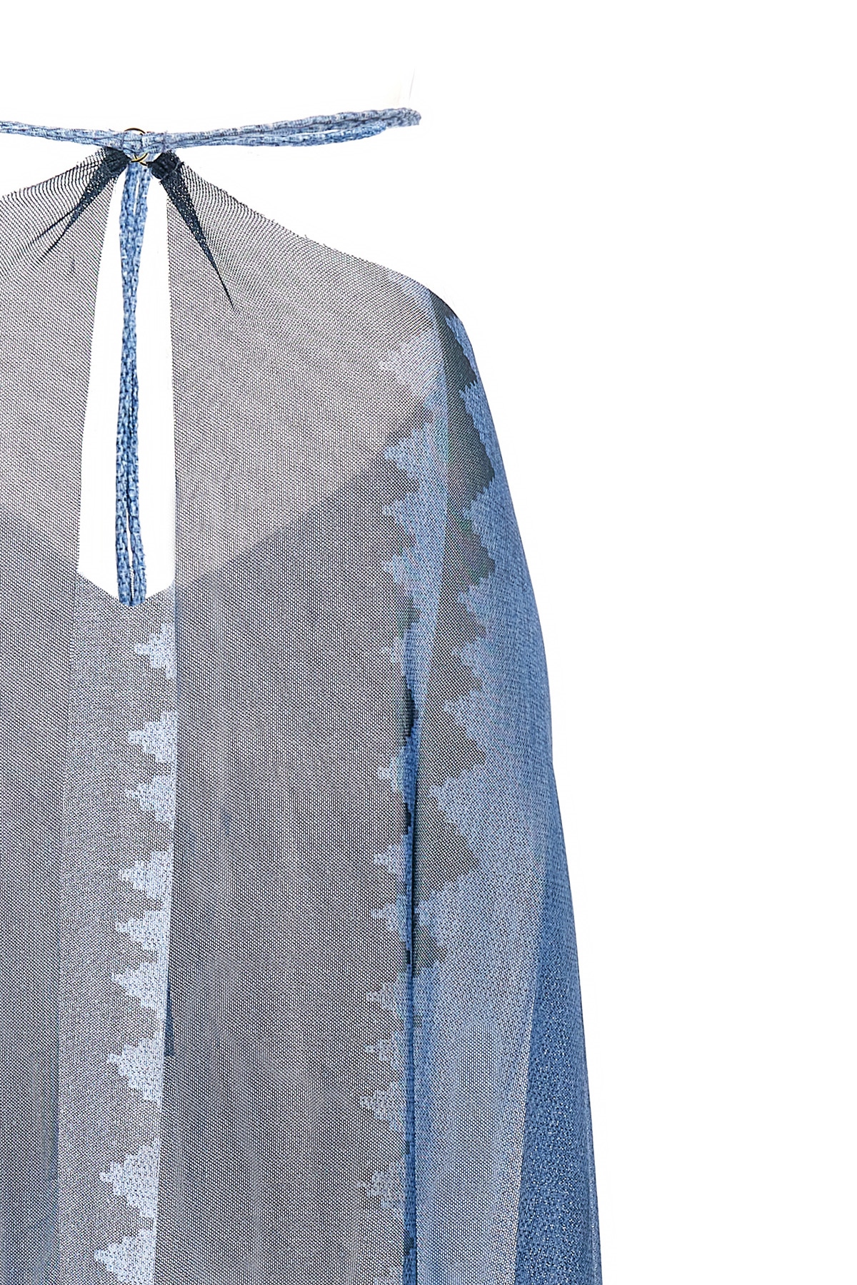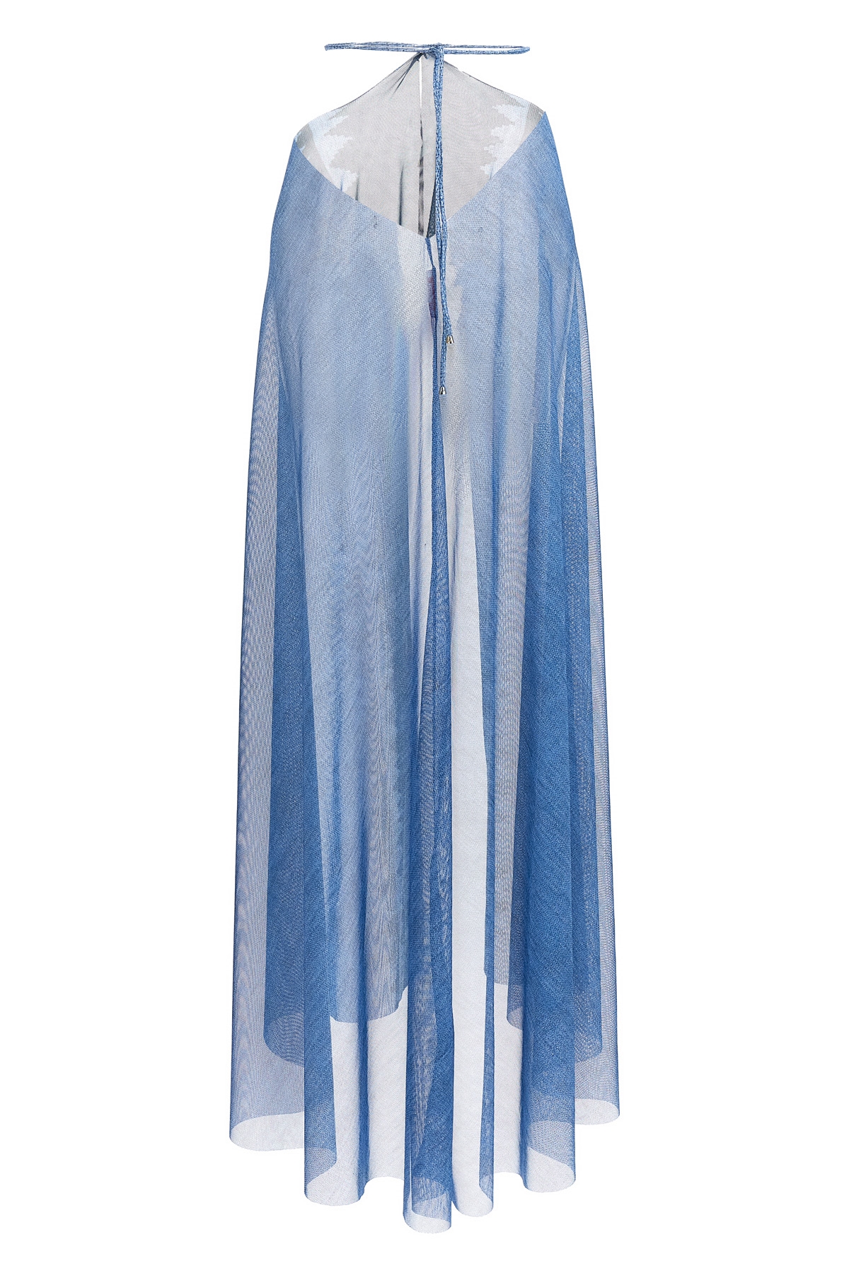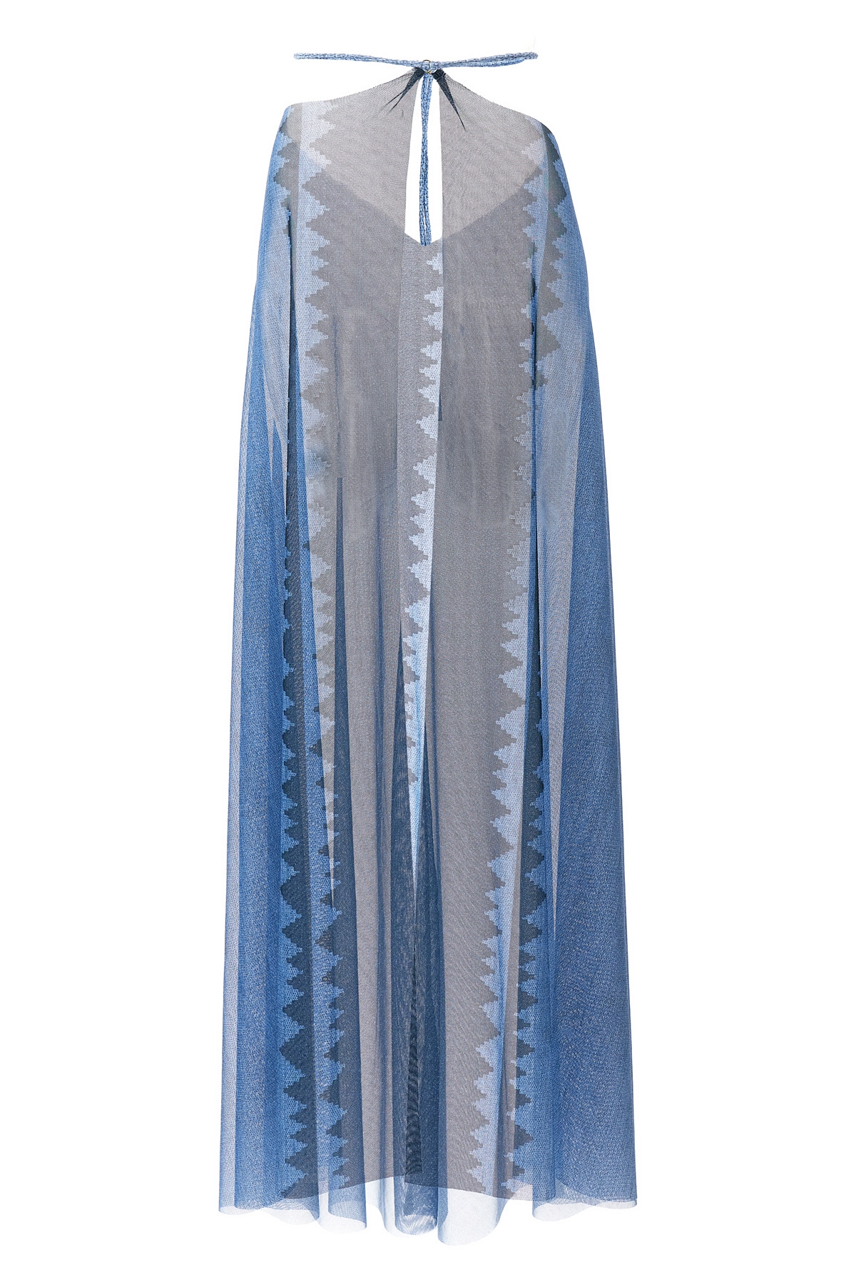 Long 'Intreccio Africano' print tulle dress with lacing closure. It can be used as a sarong dress fastened to the neck or as a sarong skirt with high or low waist.