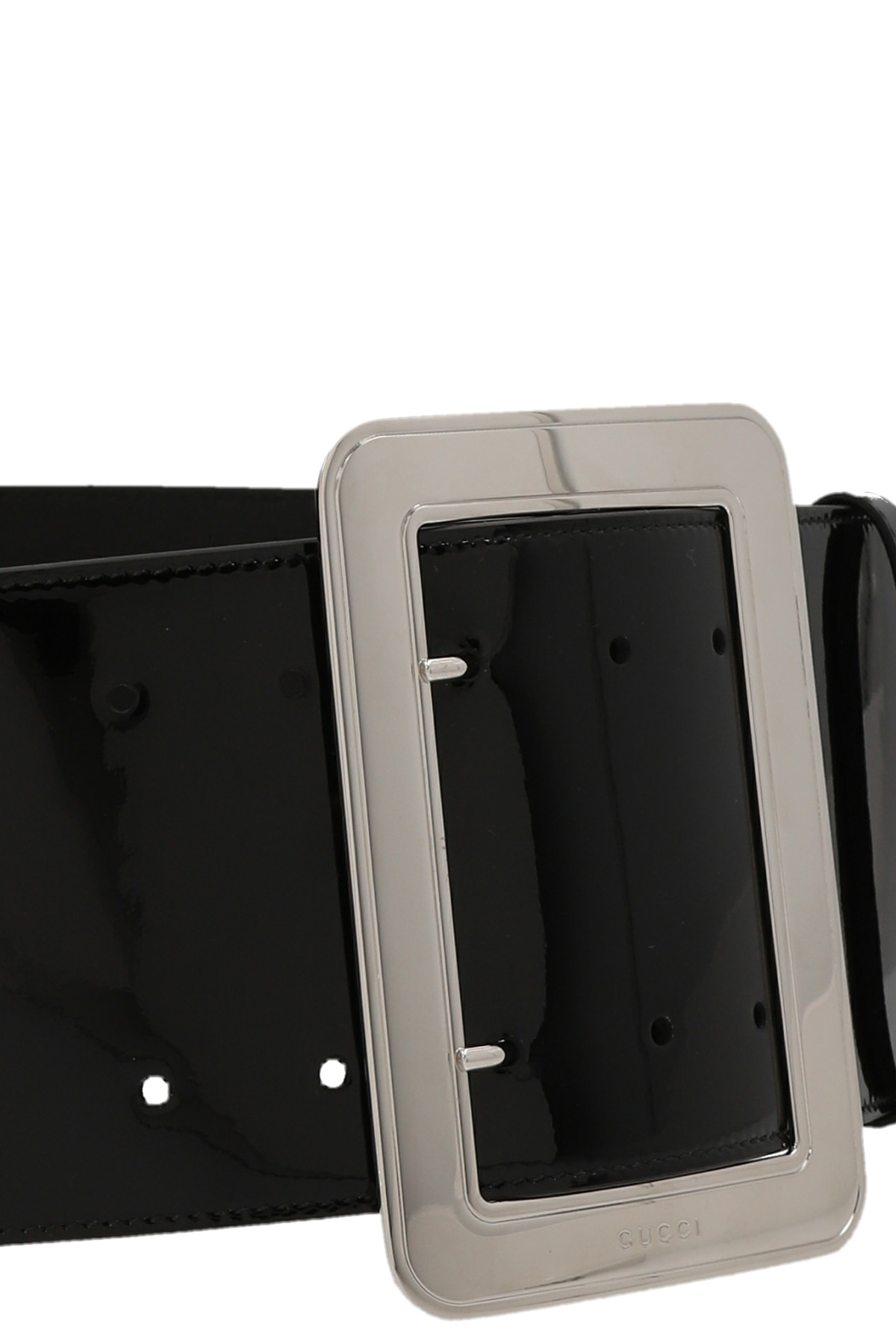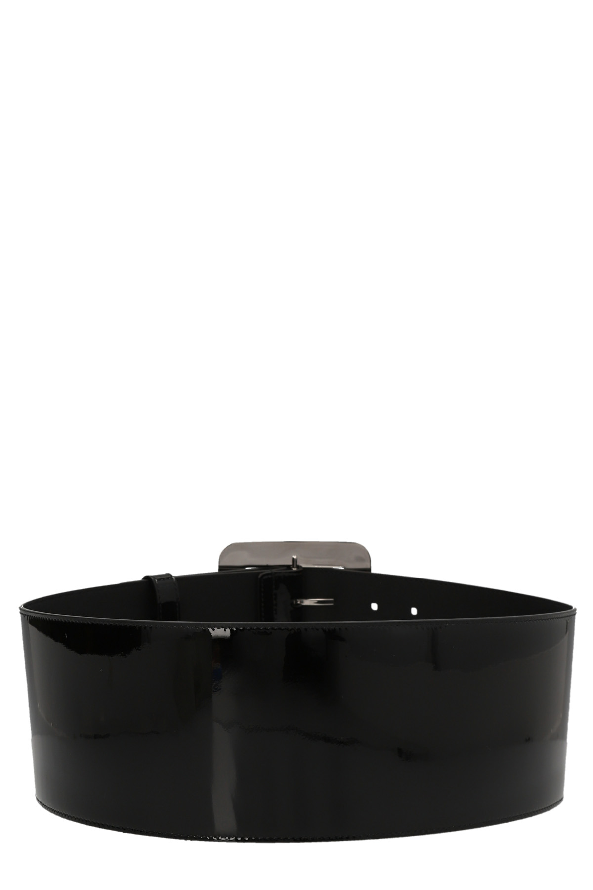 Black painted leather belt with palladium color finishes and a rectangular logo buckle.ing a logo.