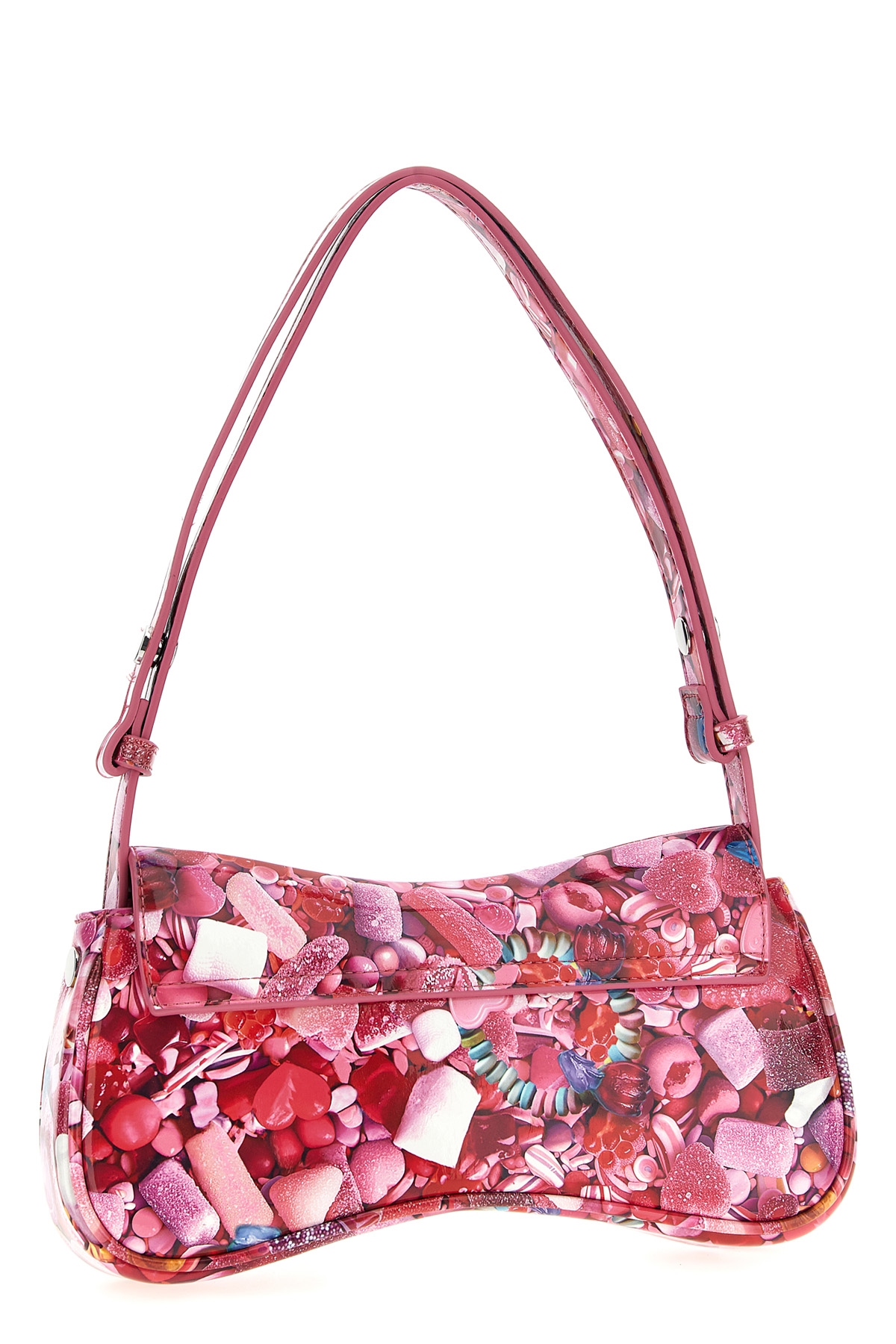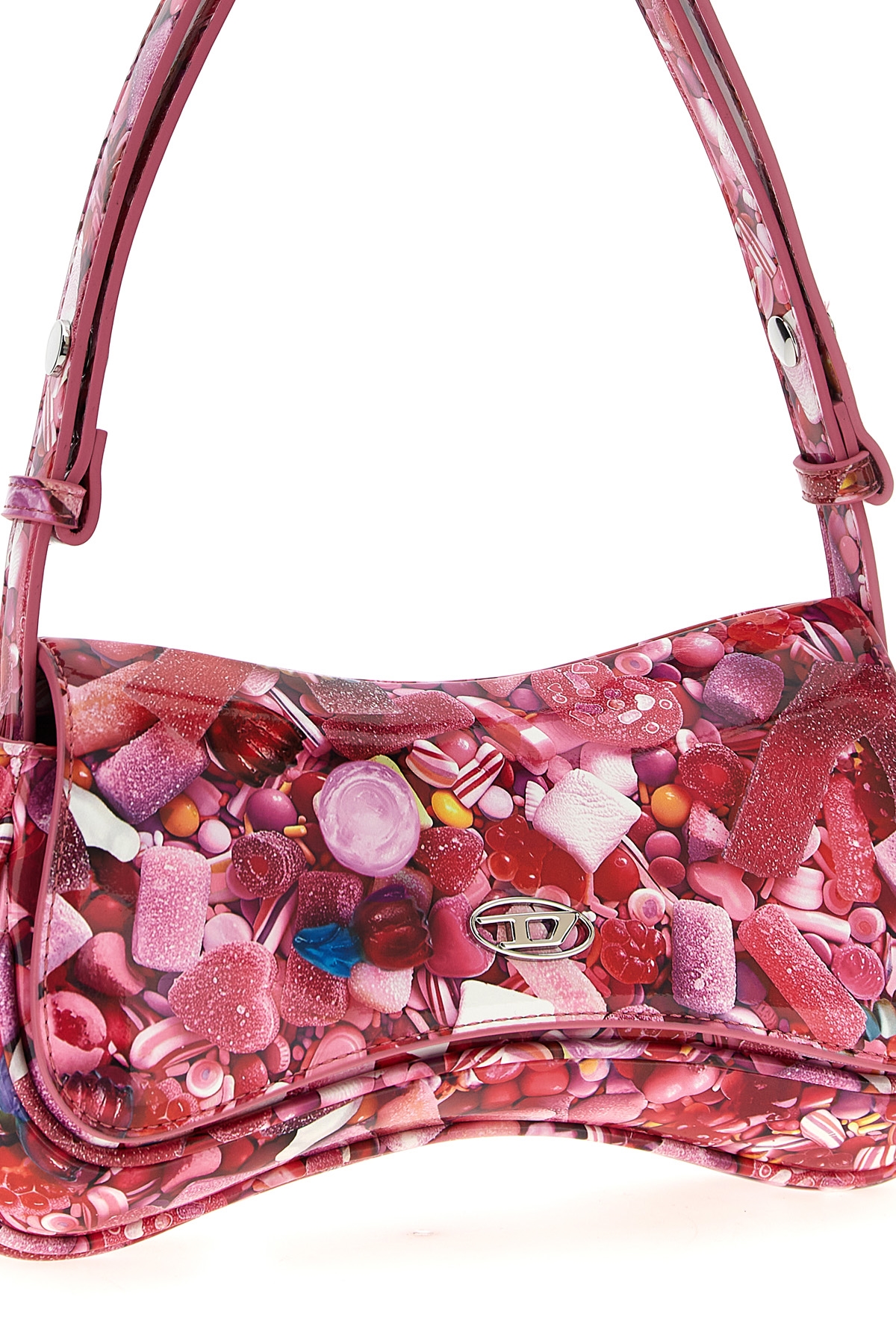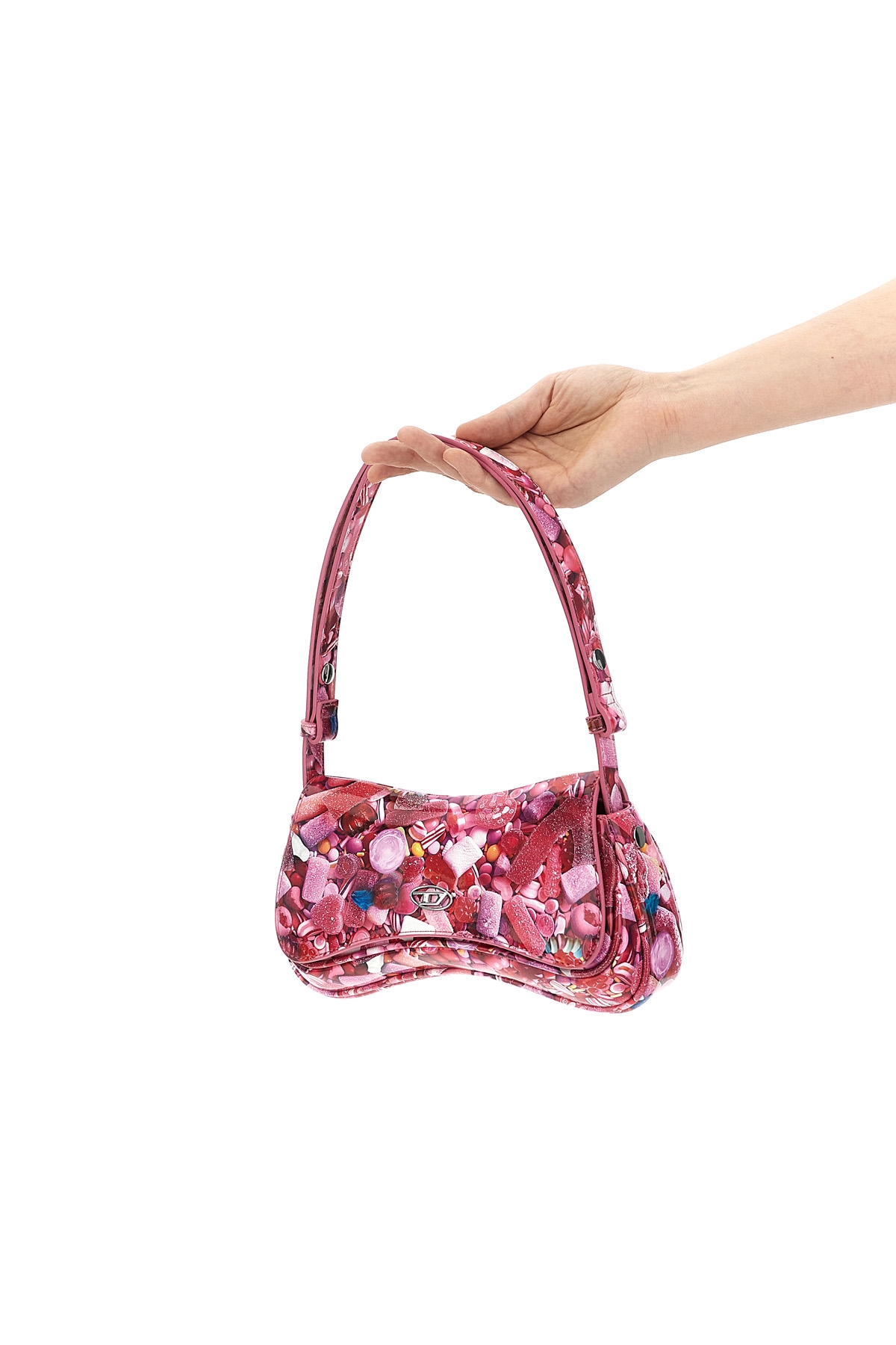 Play Clutch glossy PU shoulder bag with all-over print, magnetic flap closure, front metal logo, and adjustable handle. SUSTAINABLE: Product made with recycled materials.