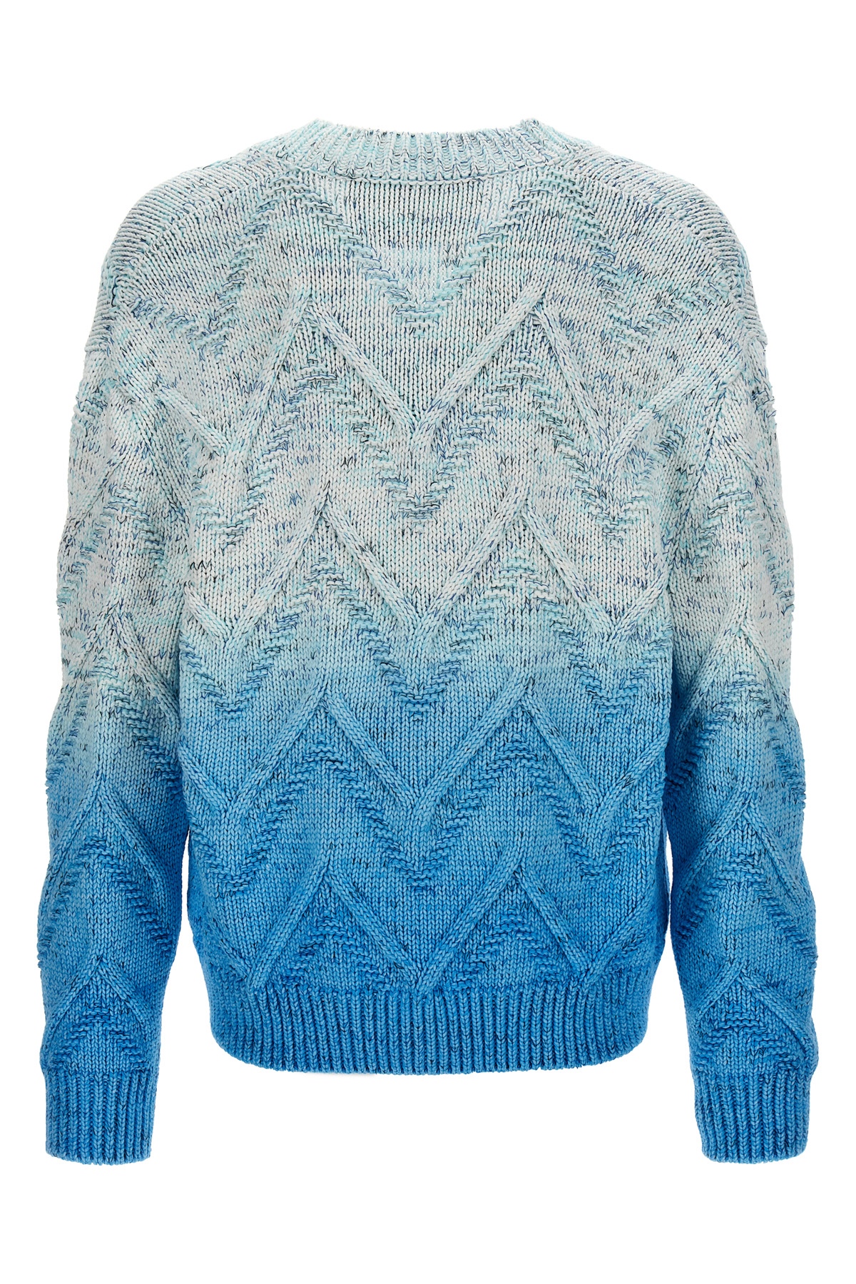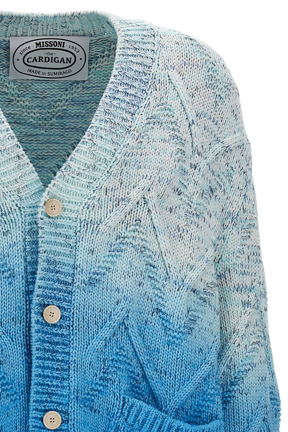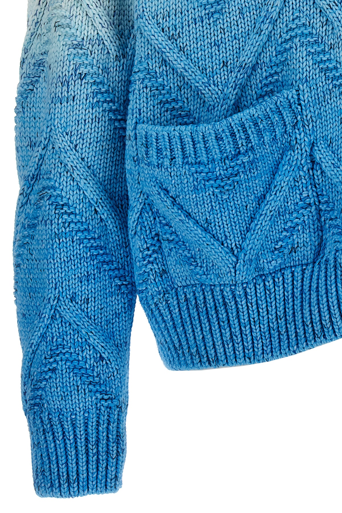 Ombre cotton blend knit cardigan, front button closure, long cuffed sleeves, pockets.