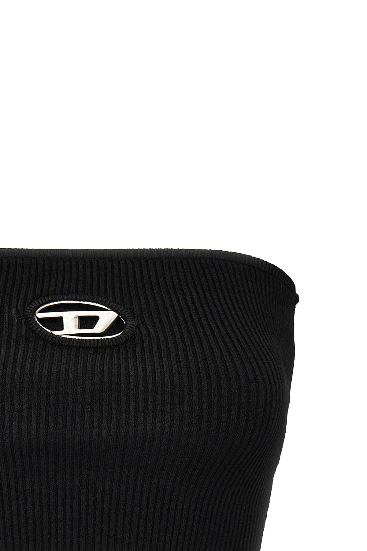 'M-Clarksvillex' ribbed stretch jersey top with front metal logo plaque with cut-out detail, off-the-shoulder bandeau design.