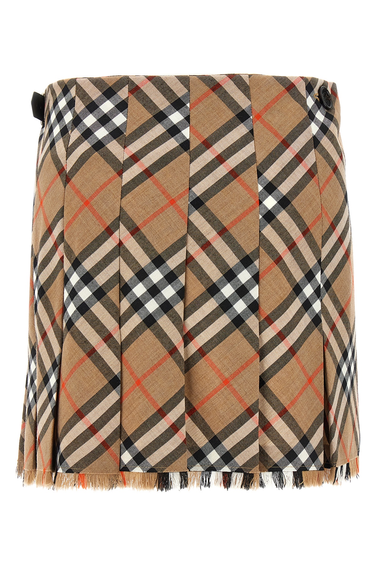 Mini skirt in woven wool blend with Burberry Check, kilt model with button closure and leather strap, fringes on the hem.